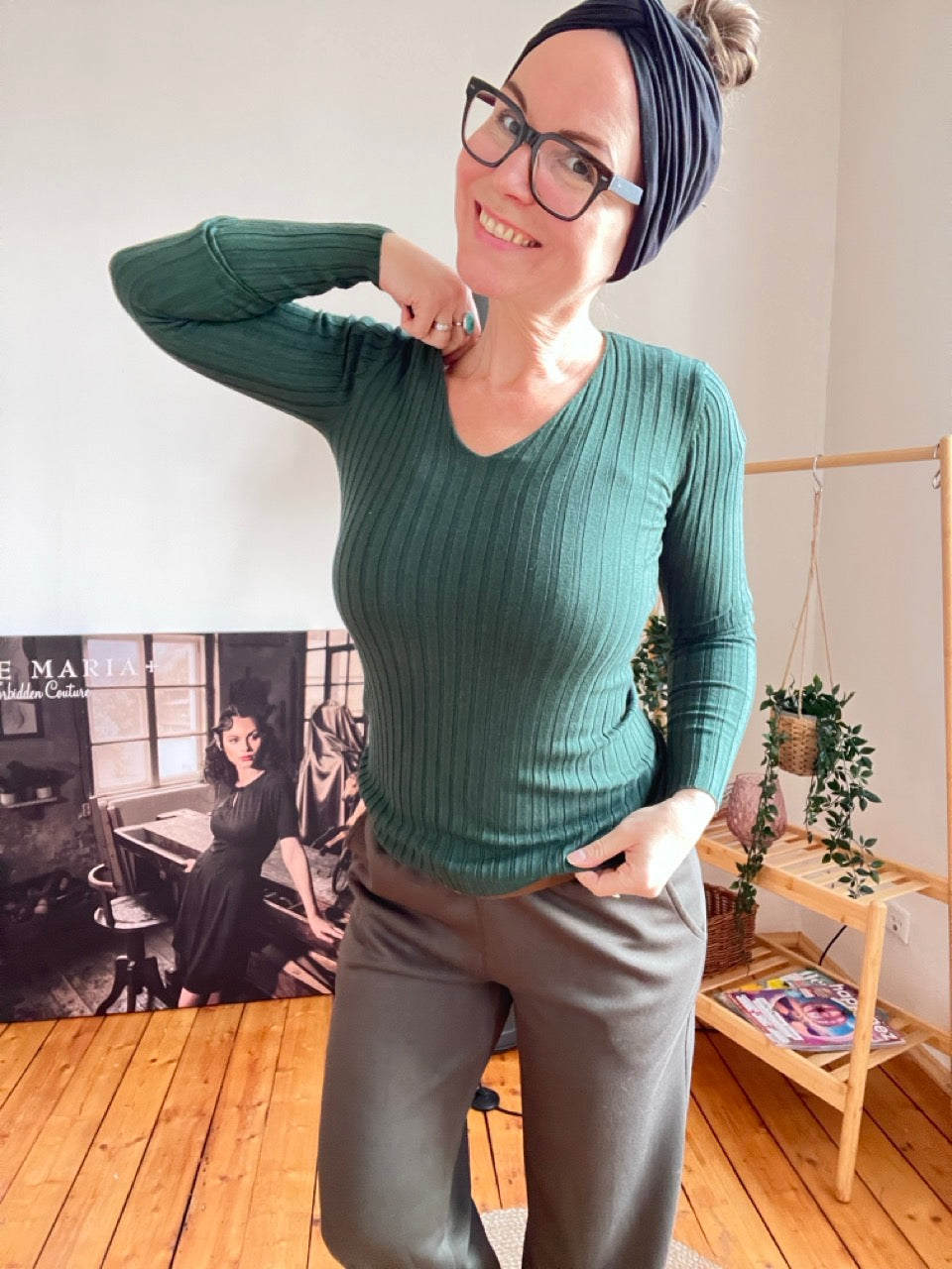• Toller, figurnah geschnittener Pulli in Tannengrün, ein Alltagsheld und Liebling in unserem Shop