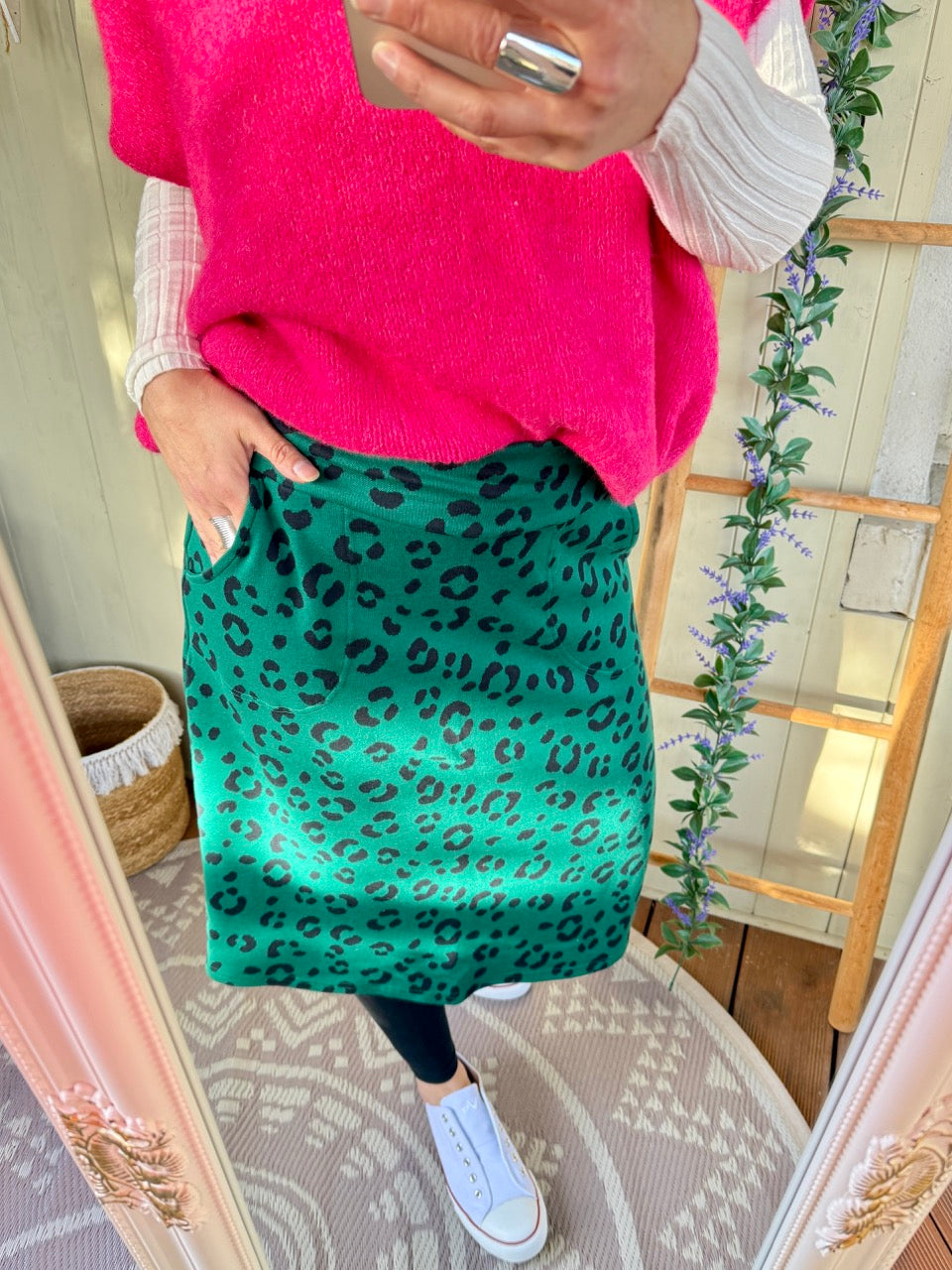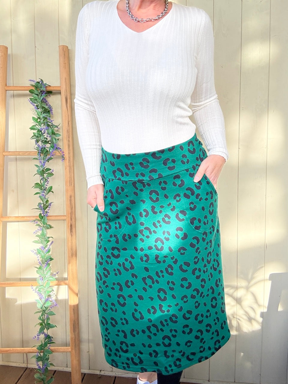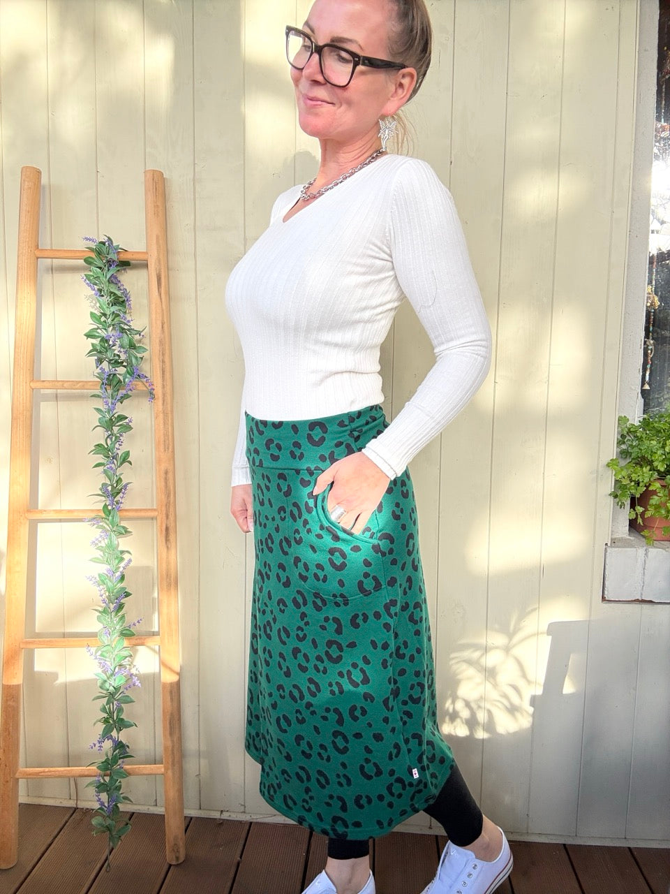 • Super gemütlicher, wadenlanger Midirock in Grün, mit Leo Muster