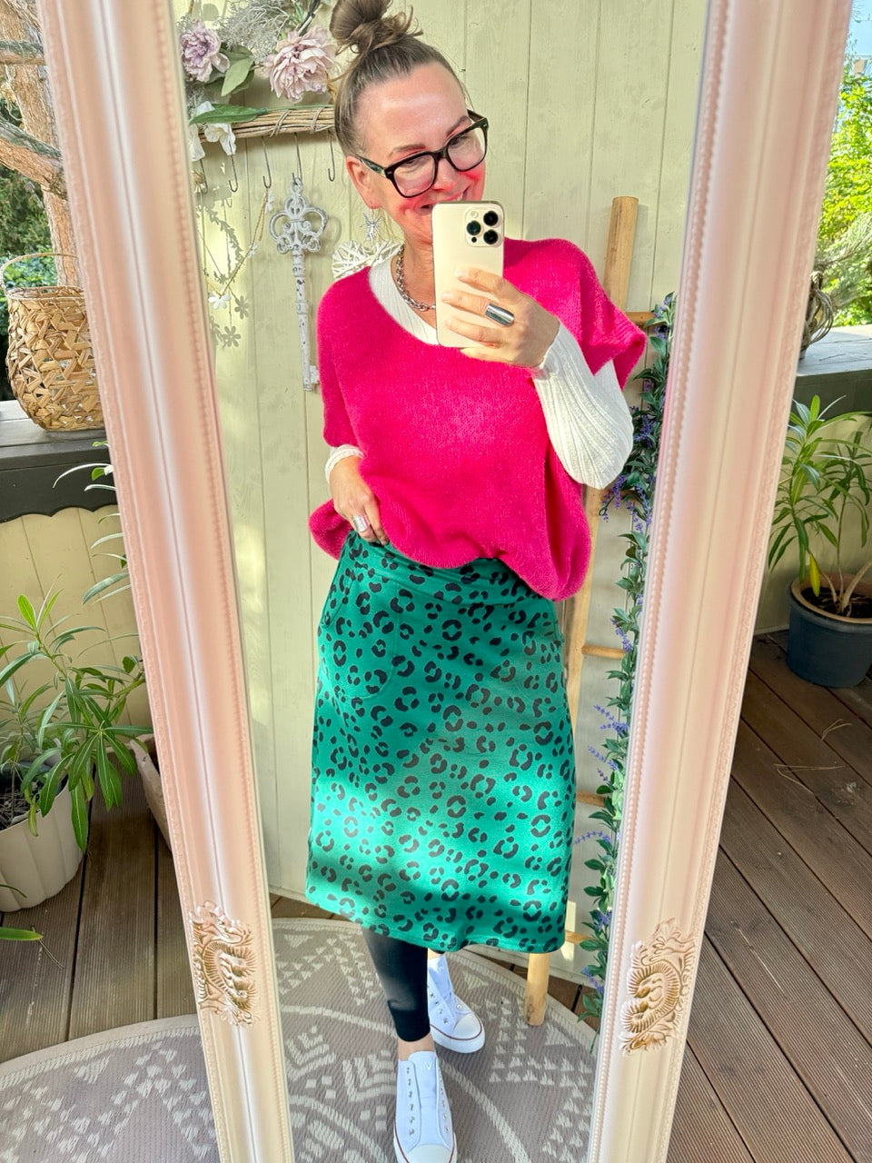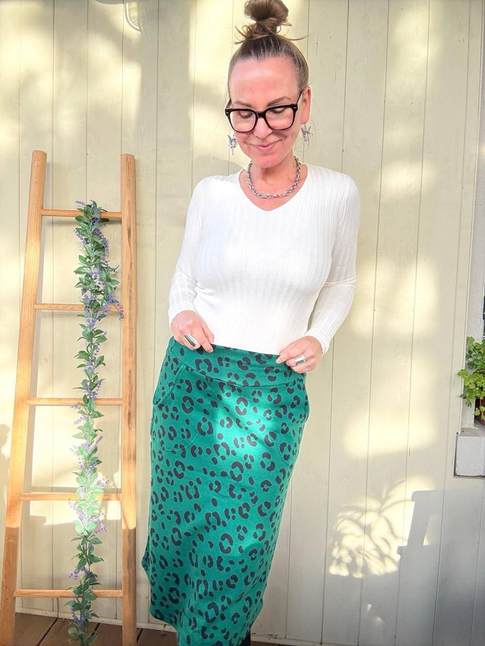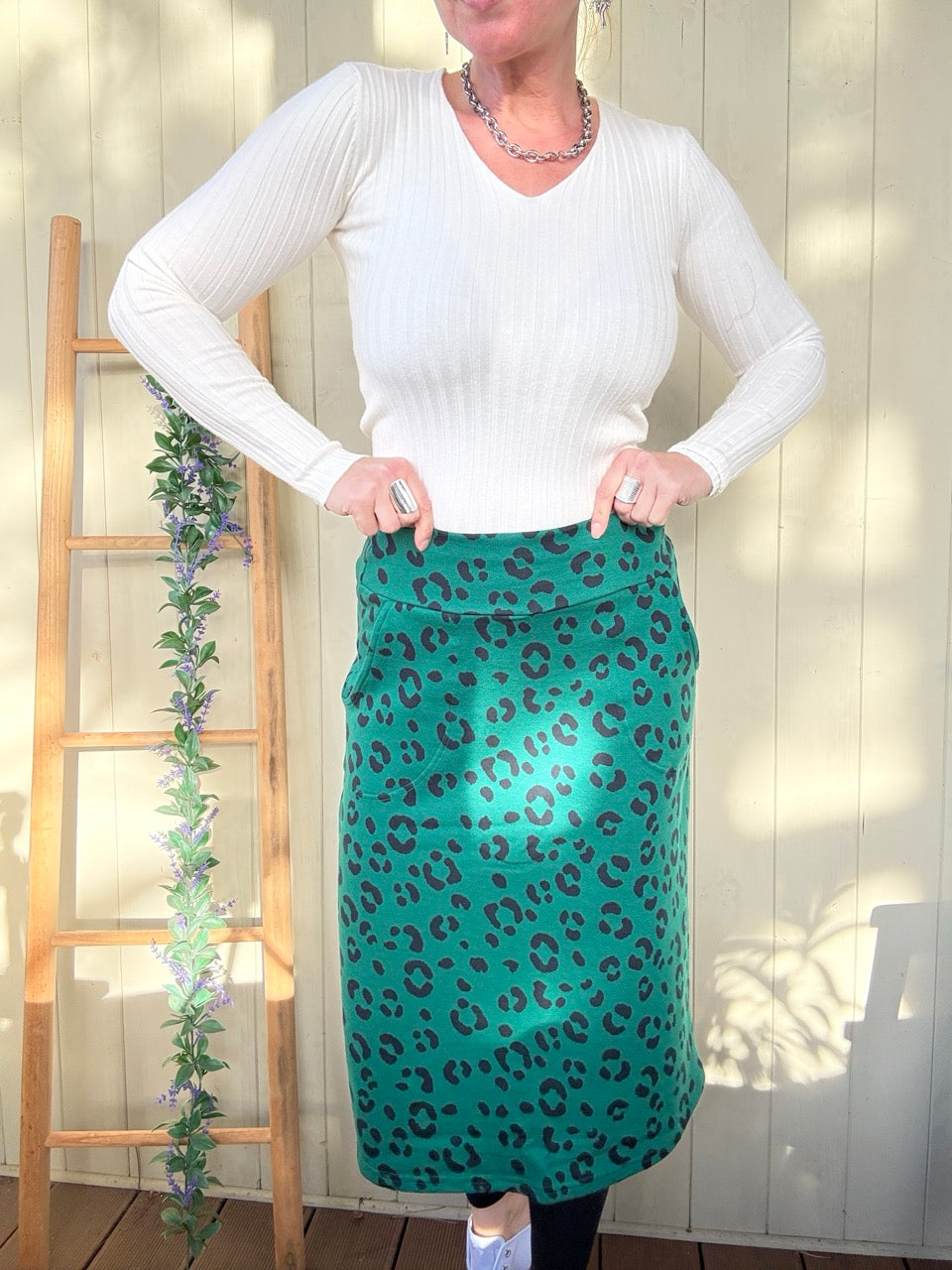 • Super gemütlicher, wadenlanger Midirock in Grün, mit Leo Muster
