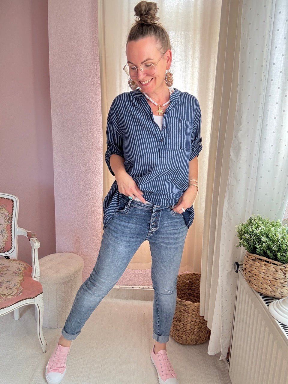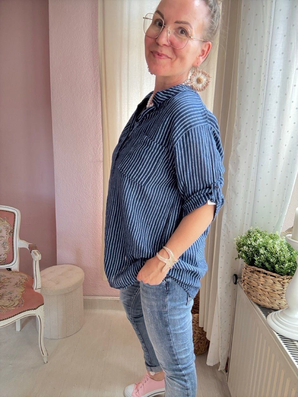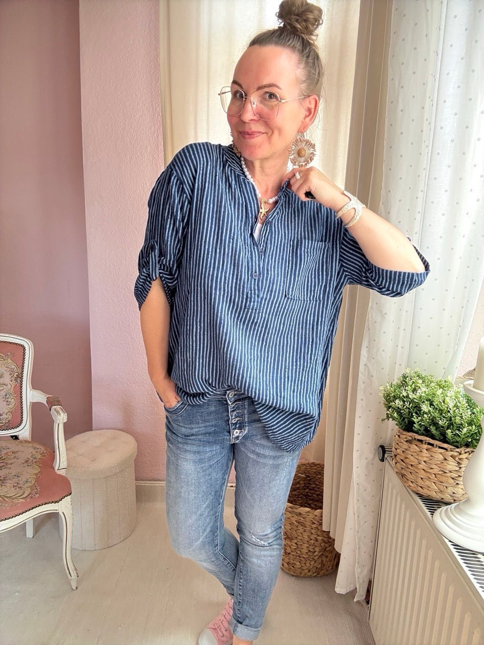• die halblangen Arme können lässig nach oben gerollt und mit einem Knopf befestigt werden