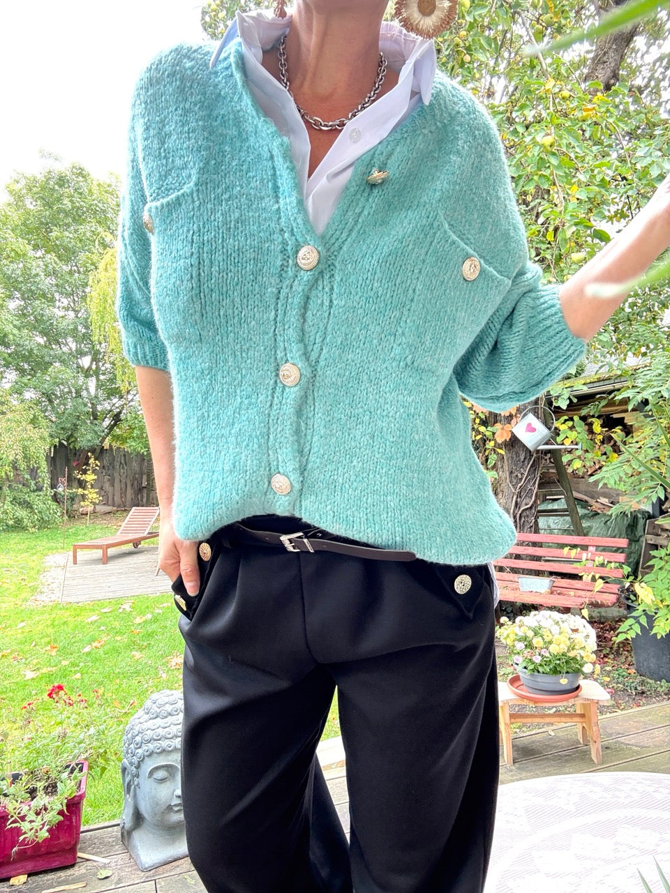 • Super gemütliche, locker geschnittene Strickjacke mit kurzen Armen in strahlendem Tiffany Blue und kleinem Wollanteil