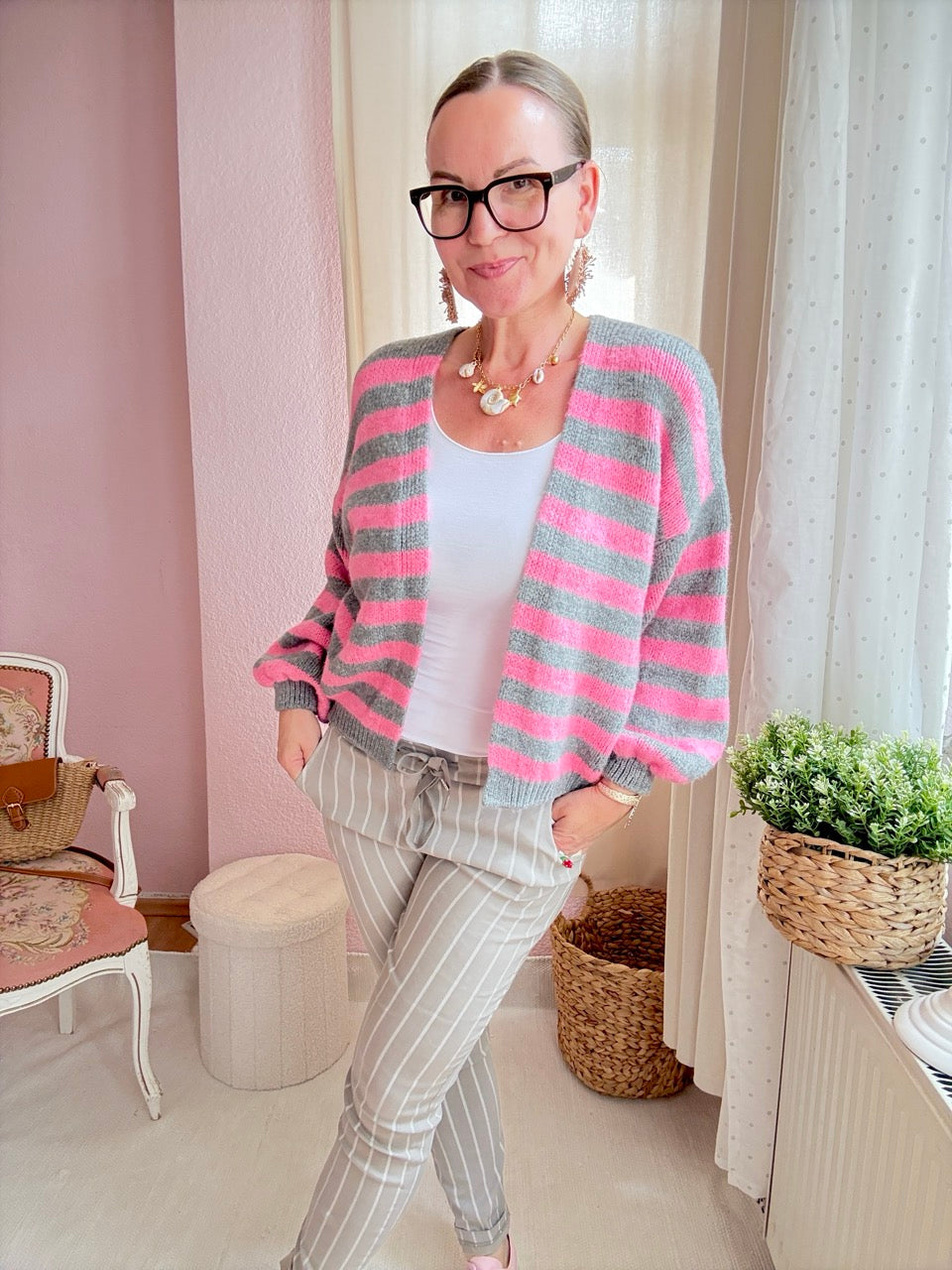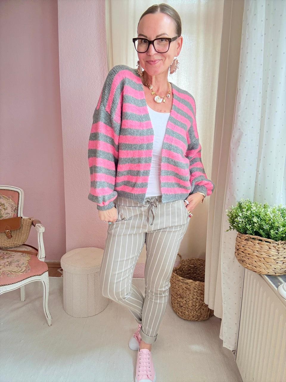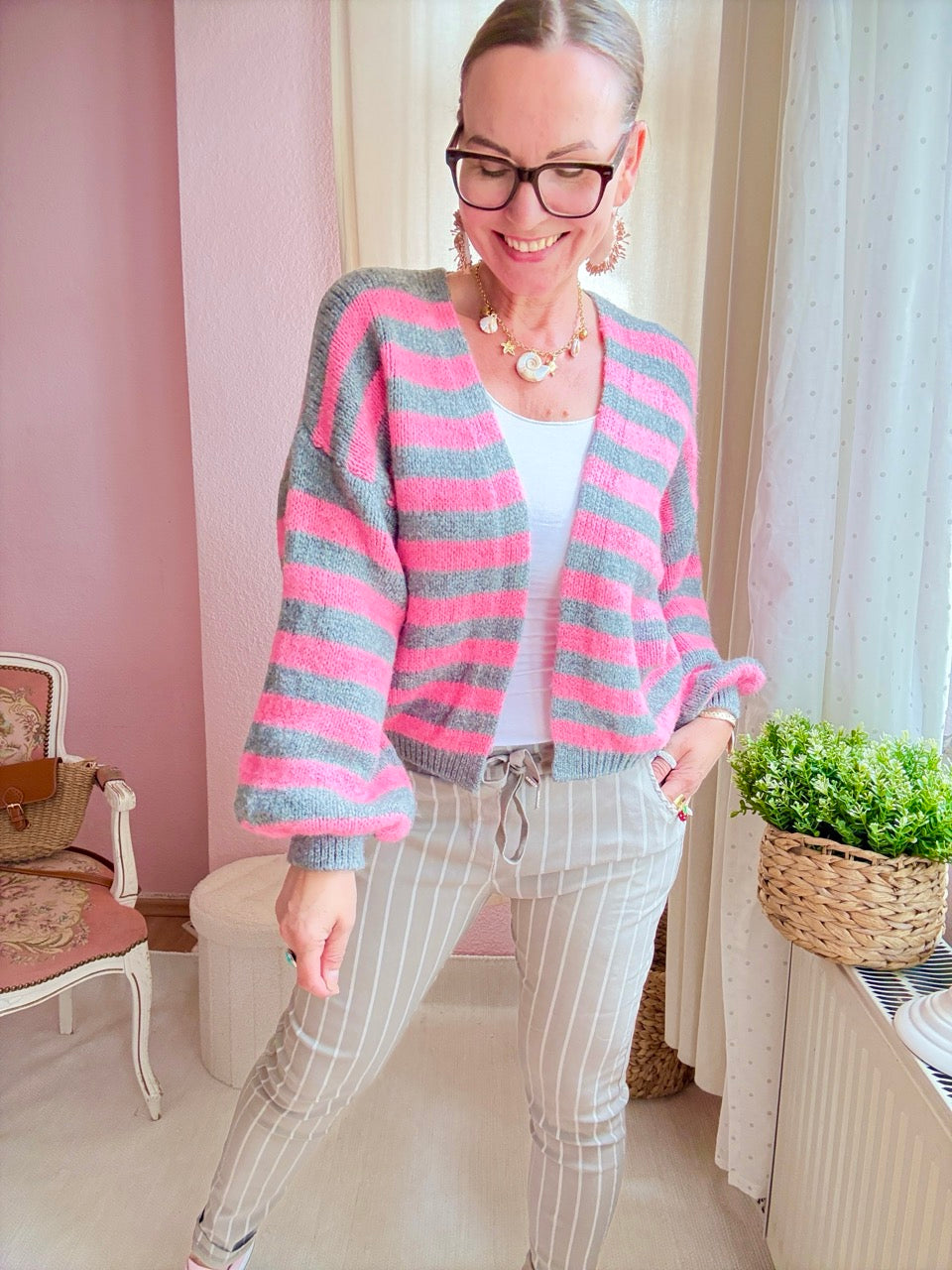 • Super gemütliche, locker geschnittene Strickjacke mit Streifen in Hellgrau / Rose und kleinem Wollanteil