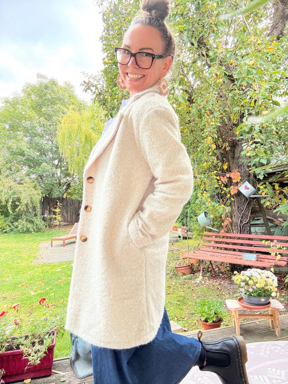 • Umlegekragen, Knopfleiste und seitliche Einschubtaschen und Oberschenkellang