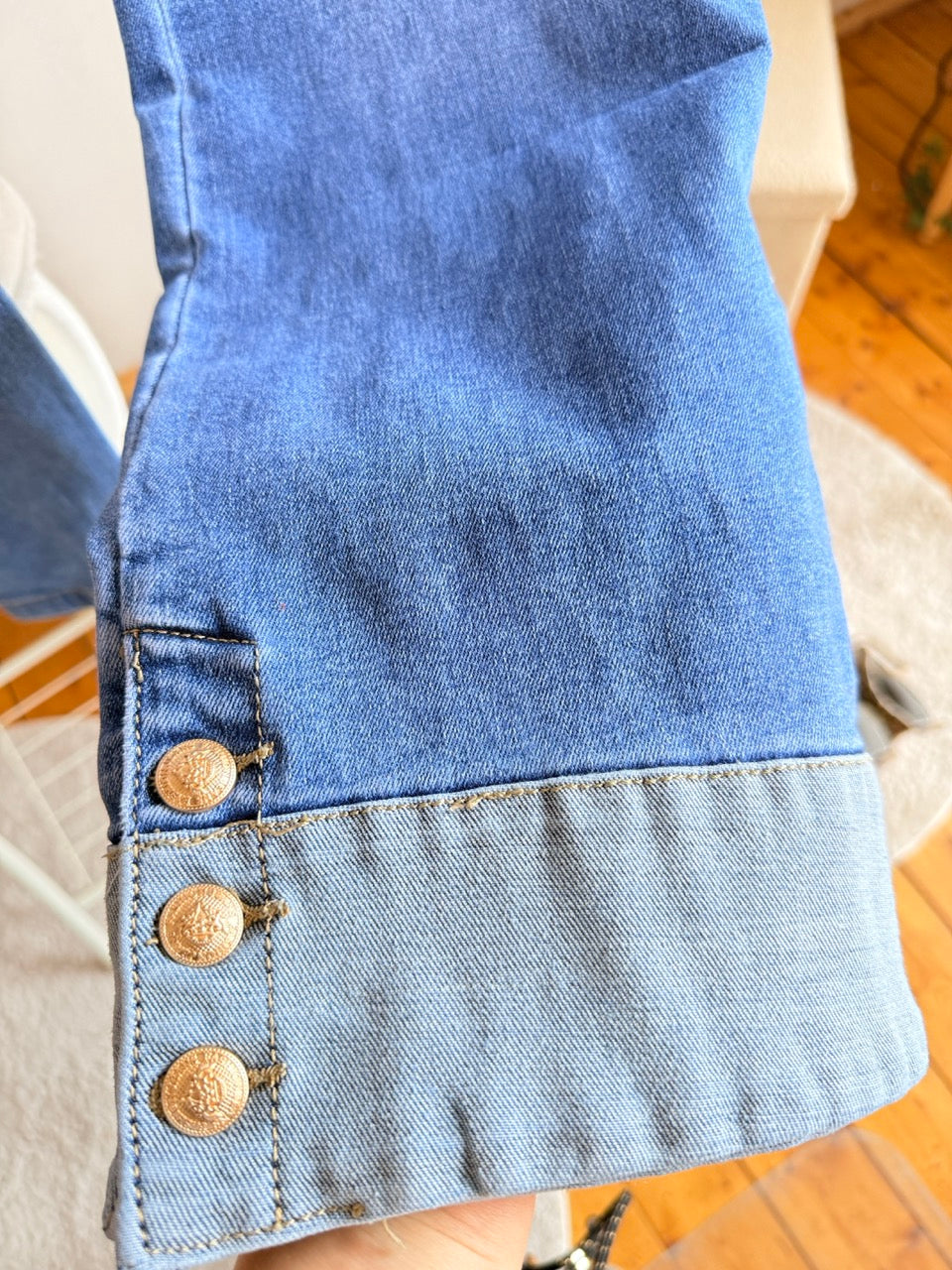 • Der genähte Saum am Beinabschluss wird durch eine seitliche Öffnung mit aufknöpfbaren Metallknöpfen betont, die es ermöglichen, den Look des Saums je nach gewünschtem Stil anzupassen.