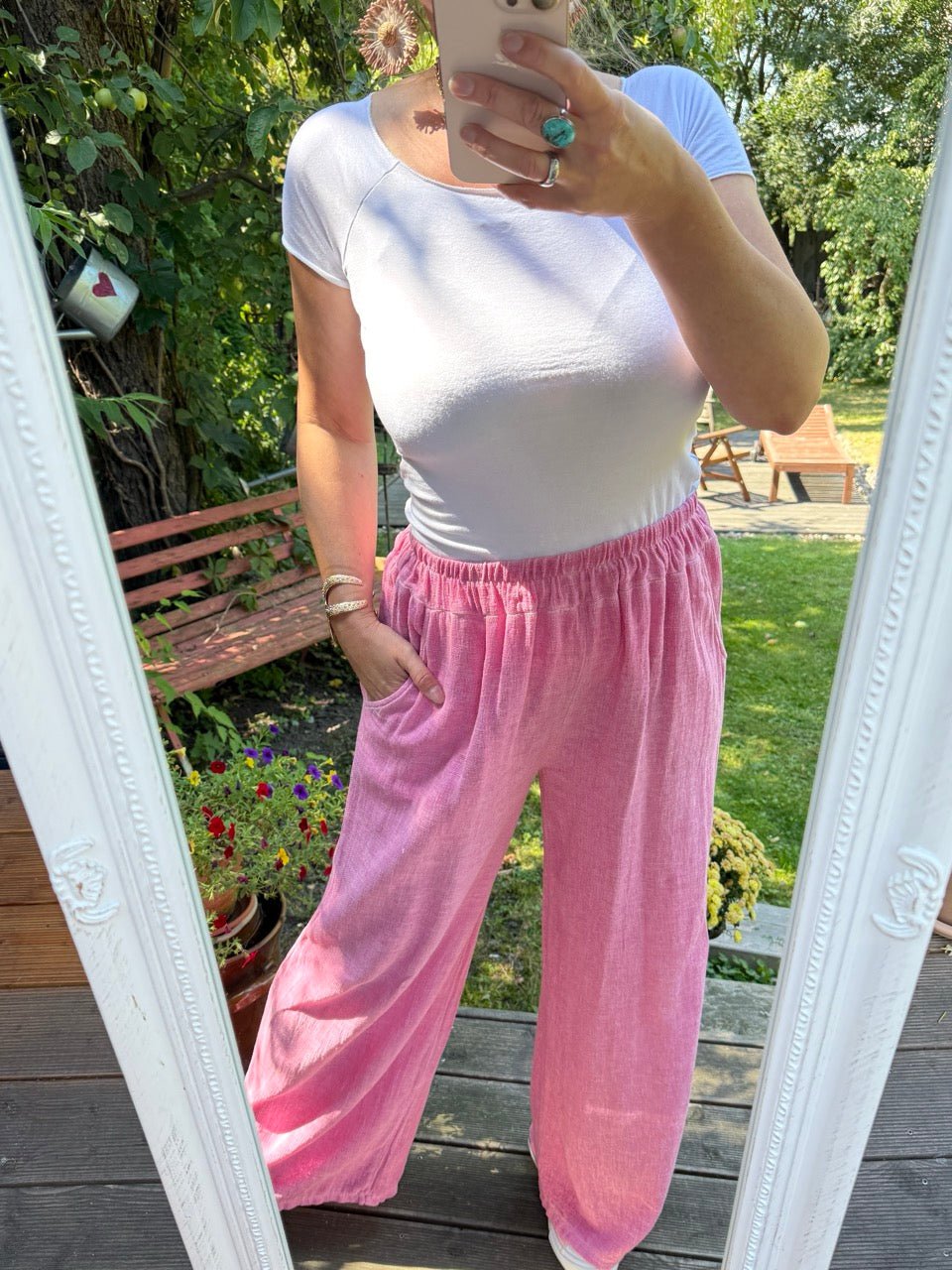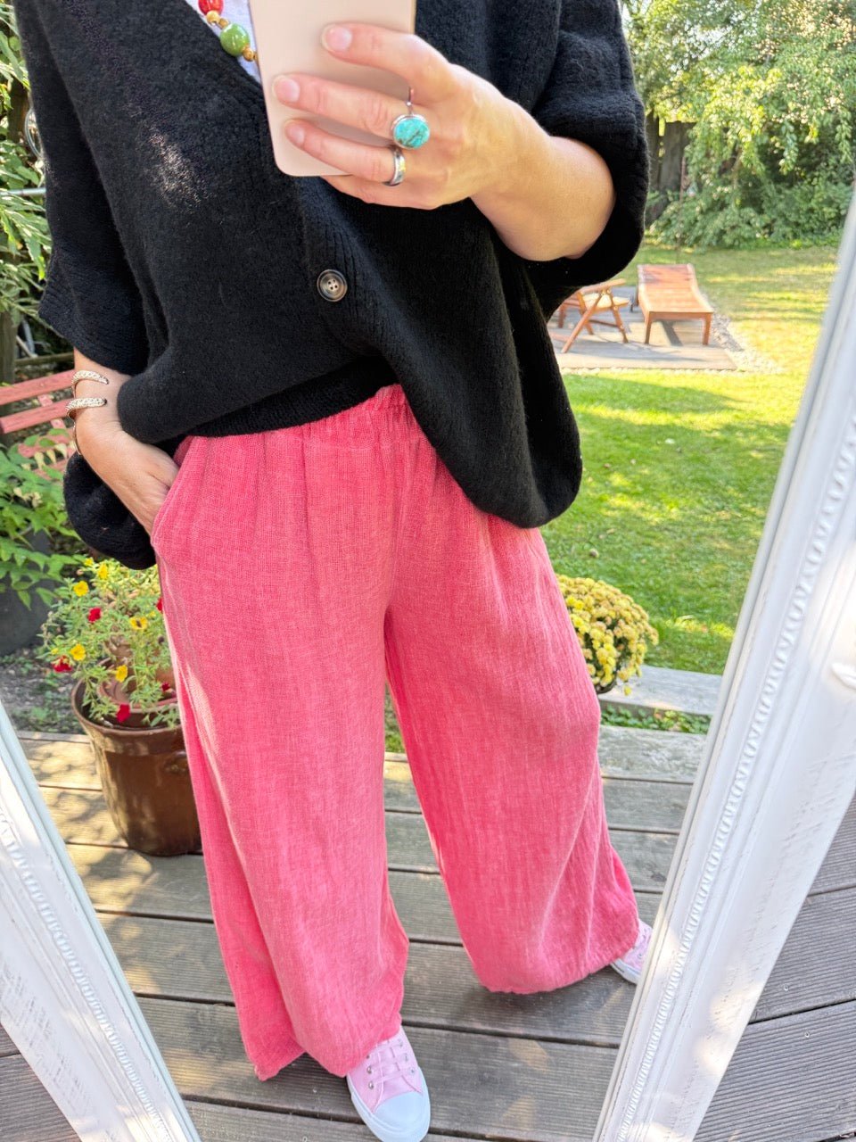 • Bequeme Leinen Hose im Culotte Schnitt mit leicht ausgestelltem Bein, in drei Farben