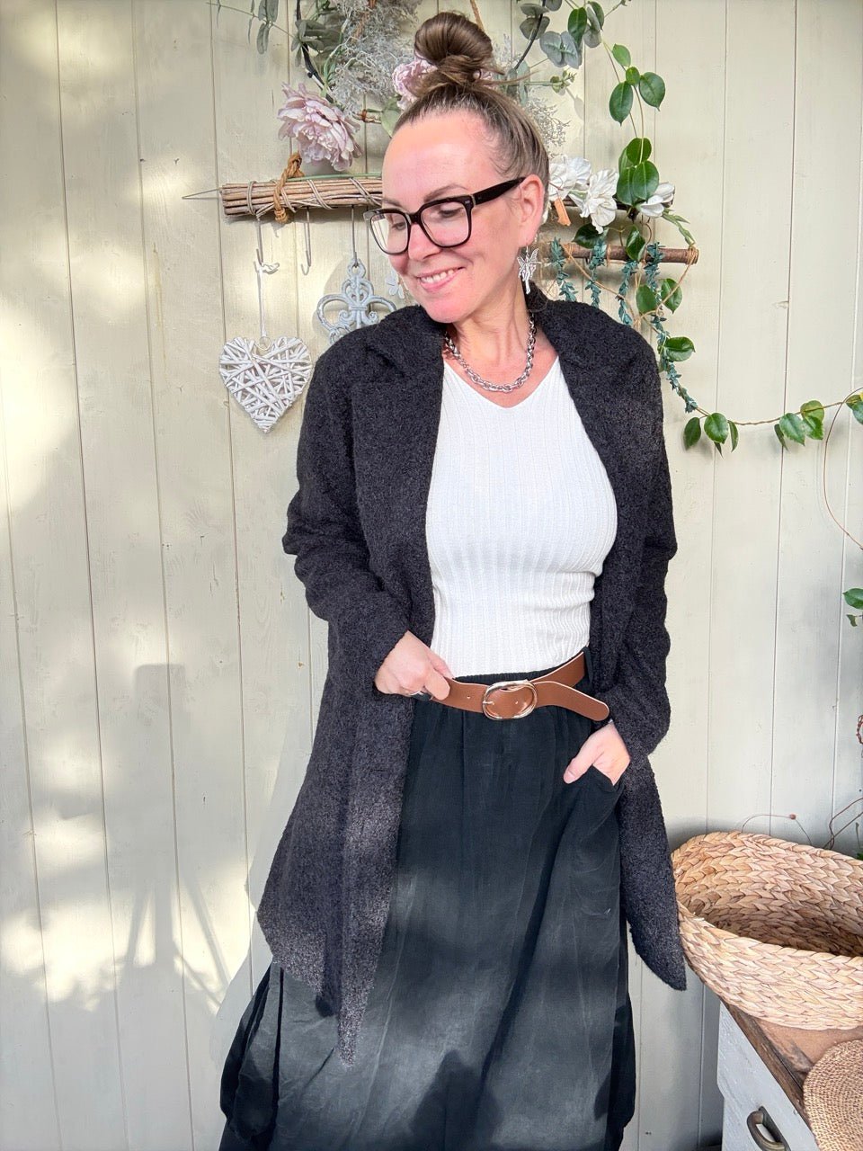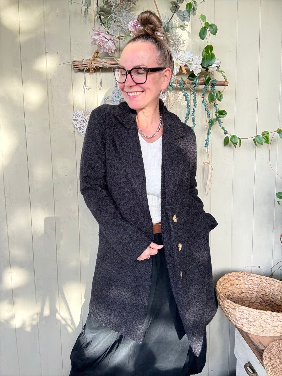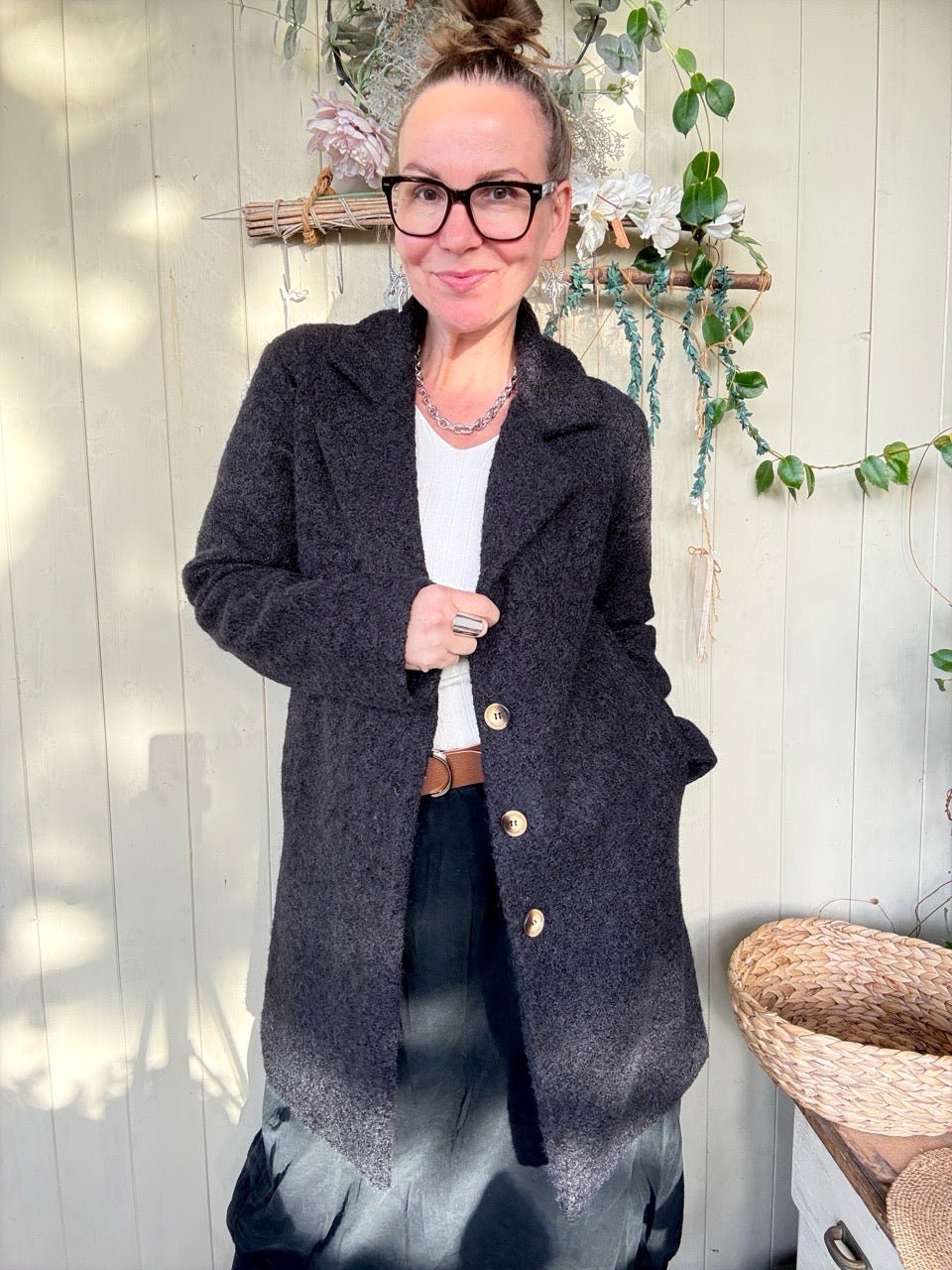 • Umlegekragen, Knopfleiste und seitliche Einschubtaschen und Oberschenkellang, Ärmel können lässig nach oben geschlagen werden