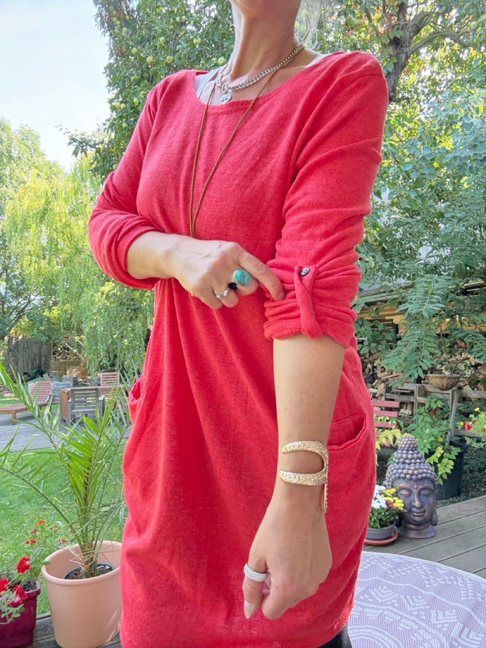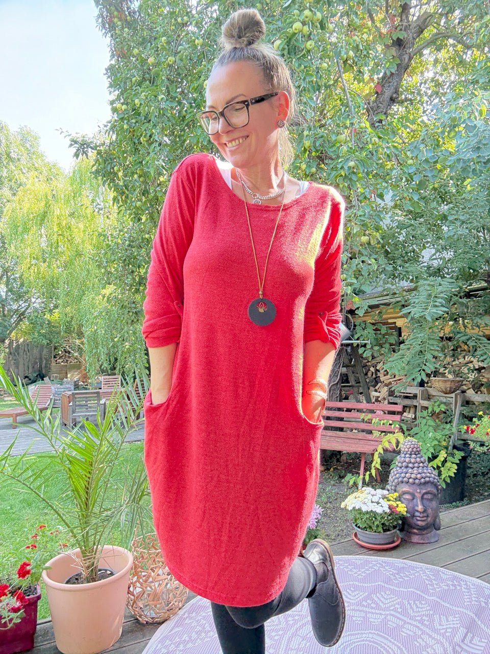 • Zauberhaft, weiches Pulloverkleid in Rot Koralle, mit toller Kette