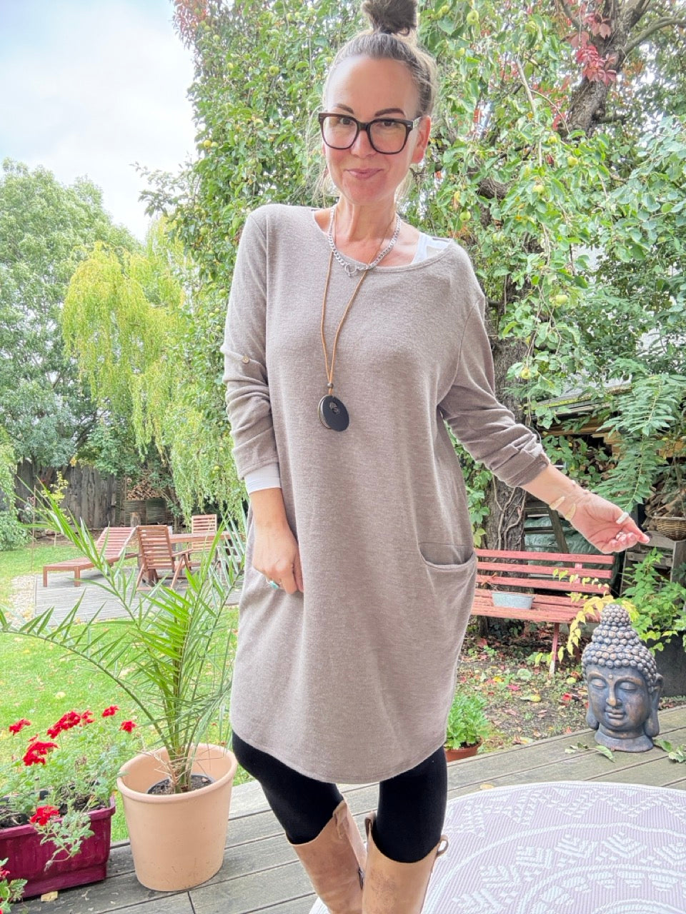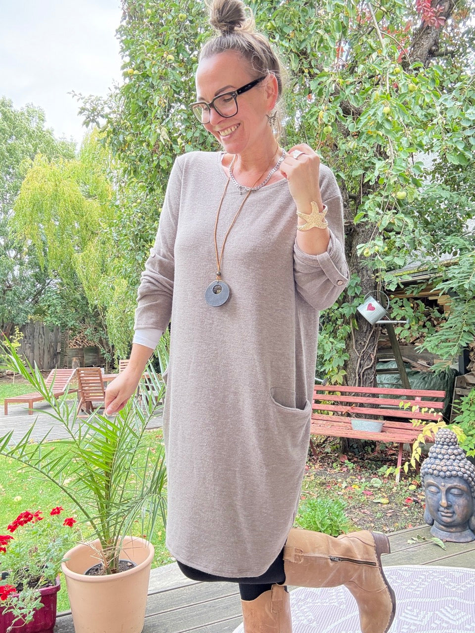 • Zauberhaft, weiches Pulloverkleid in Coffee, mit toller Kette