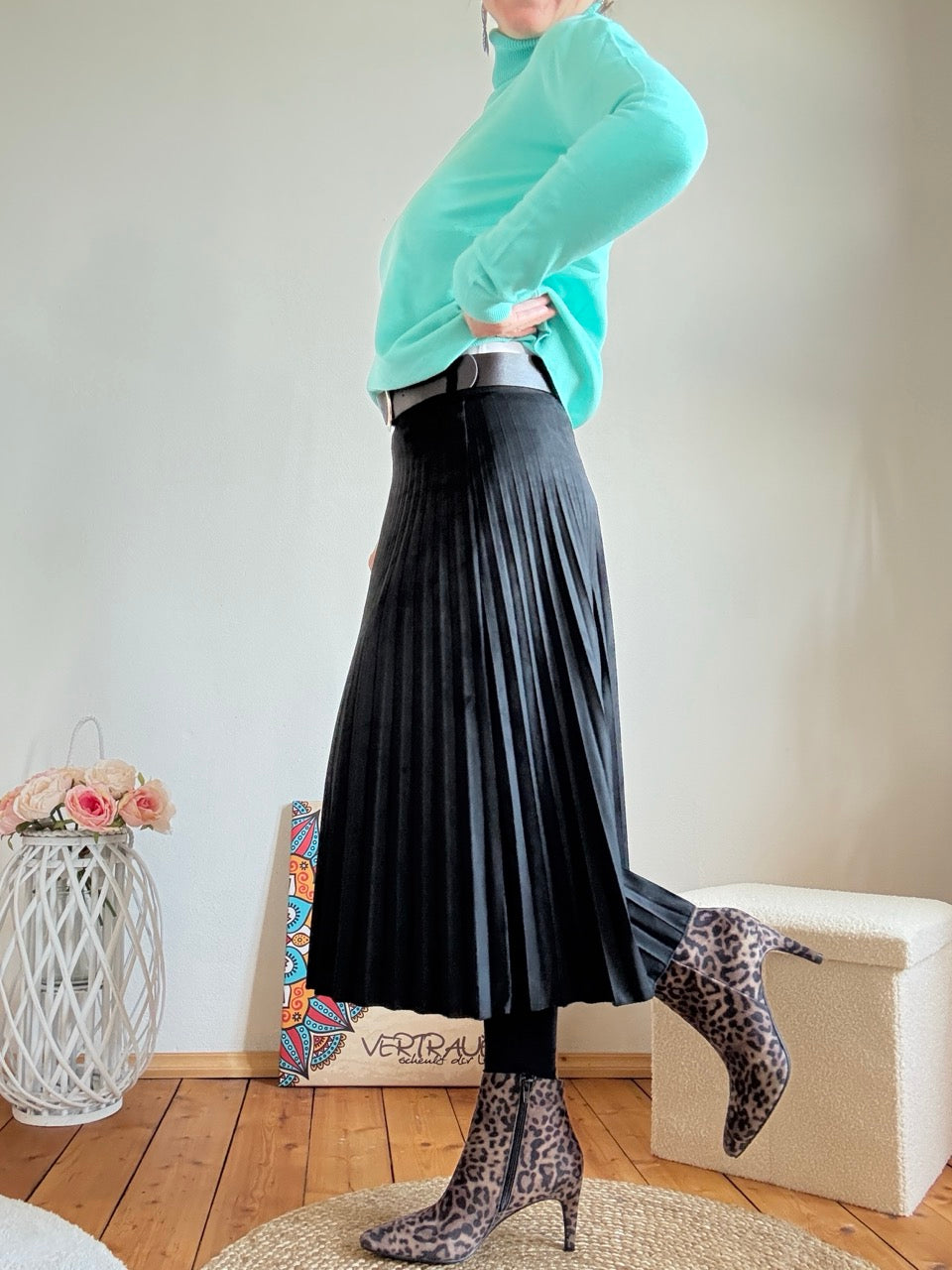 - Wunderschöner, wadenlanger, schwarzer Plissee Rock in Wildlederoptik, mit Gürtel