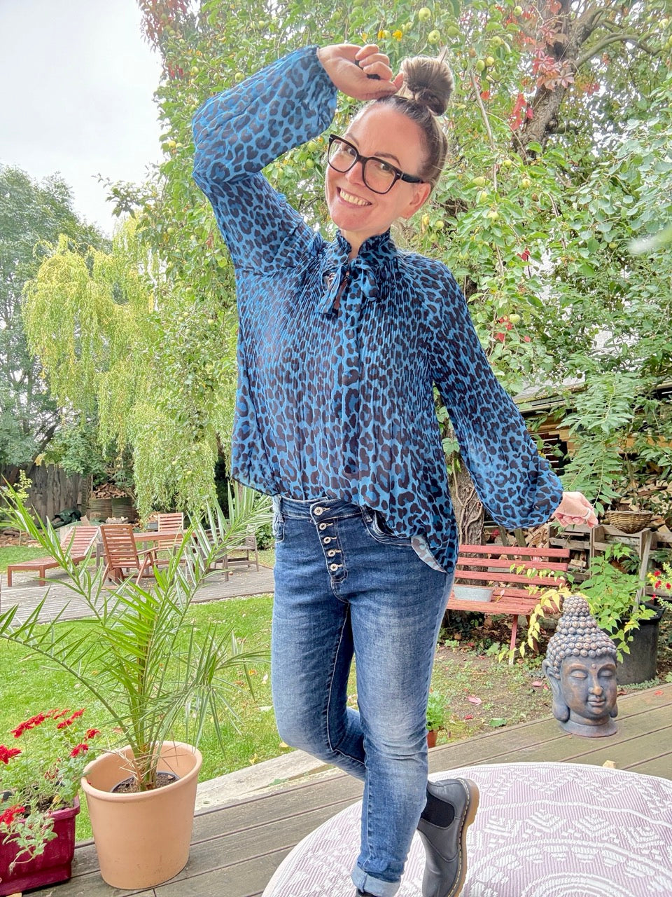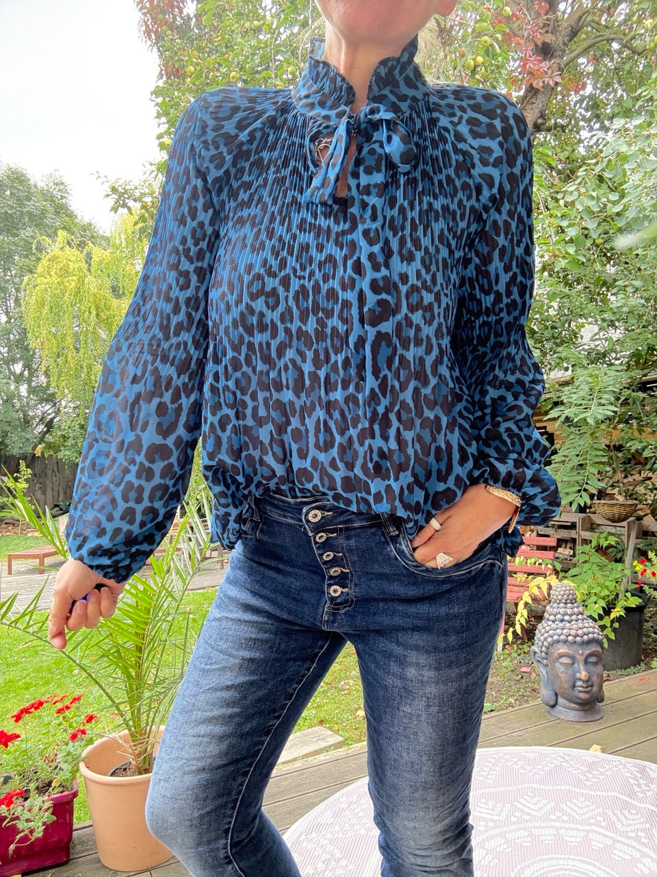- Wunderschöne, leichte Plissee Schluppen Bluse im Stil der 20er Jahre, in Leo Optik Blau