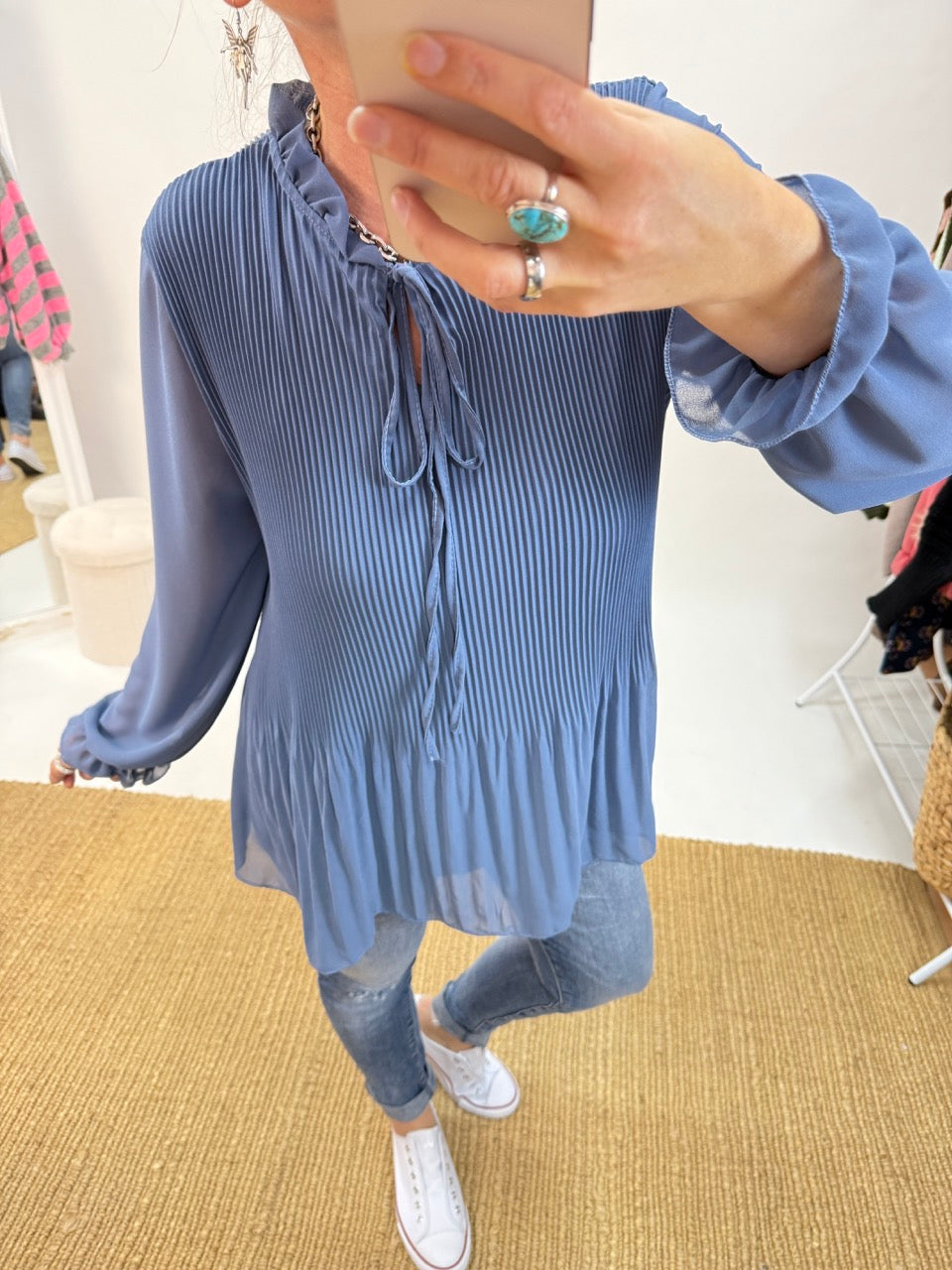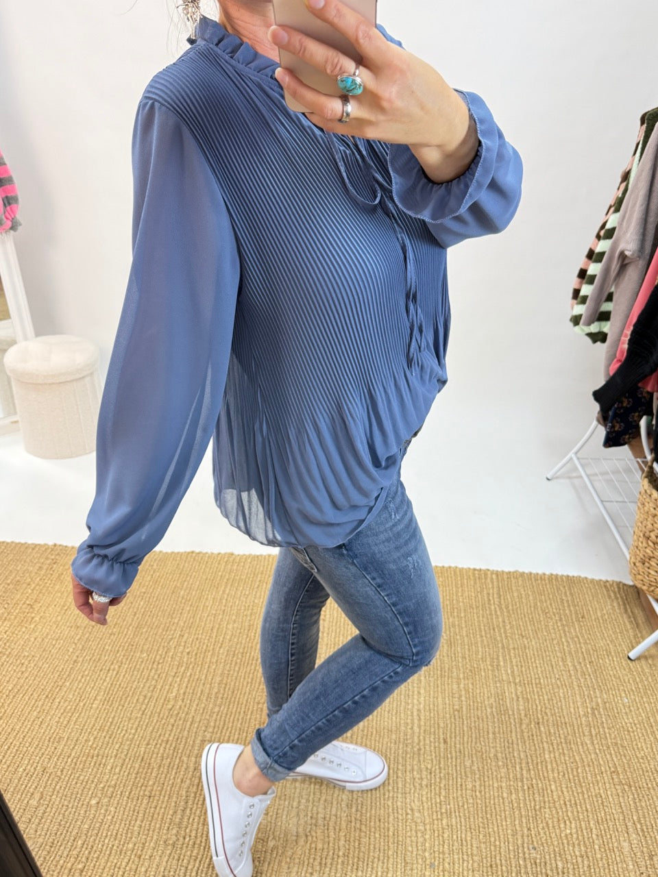 - Wunderschöne, leichte Plissee Schluppen Bluse im Stil der 20er Jahre, unterlegt, in Jeansblau