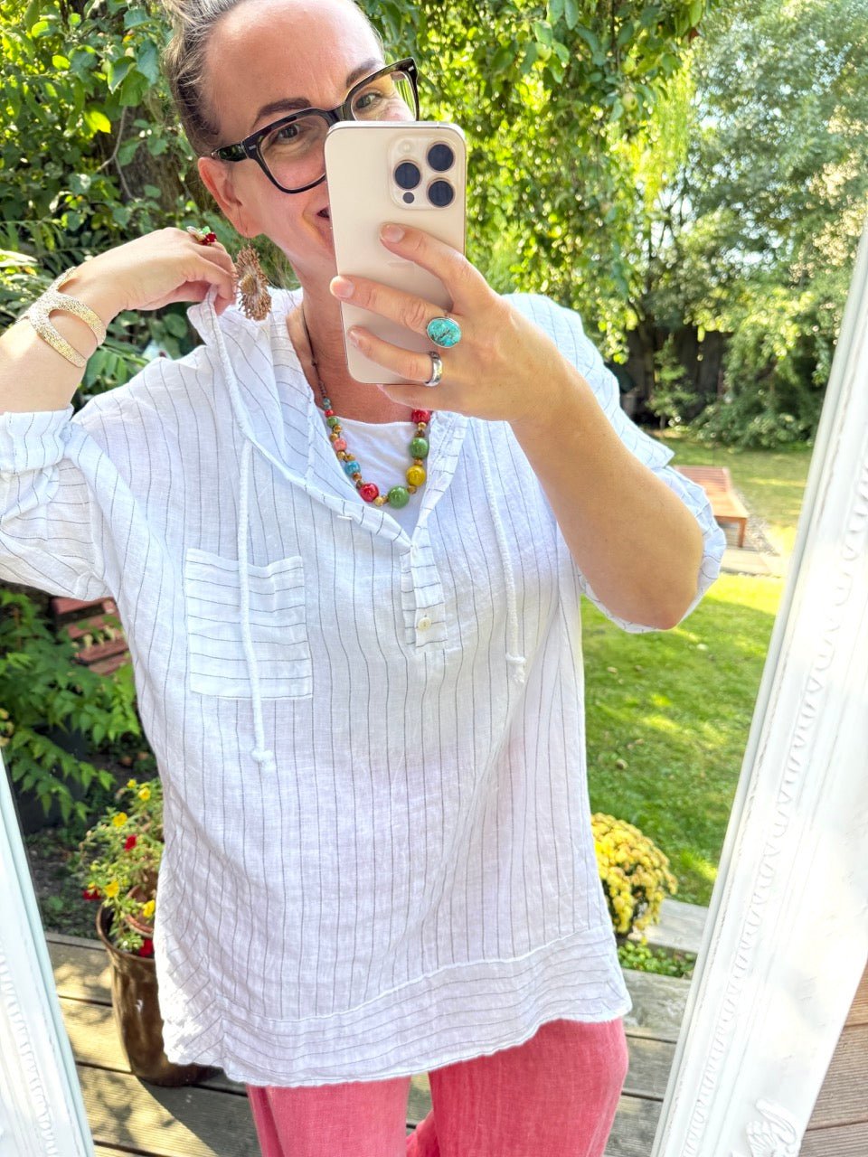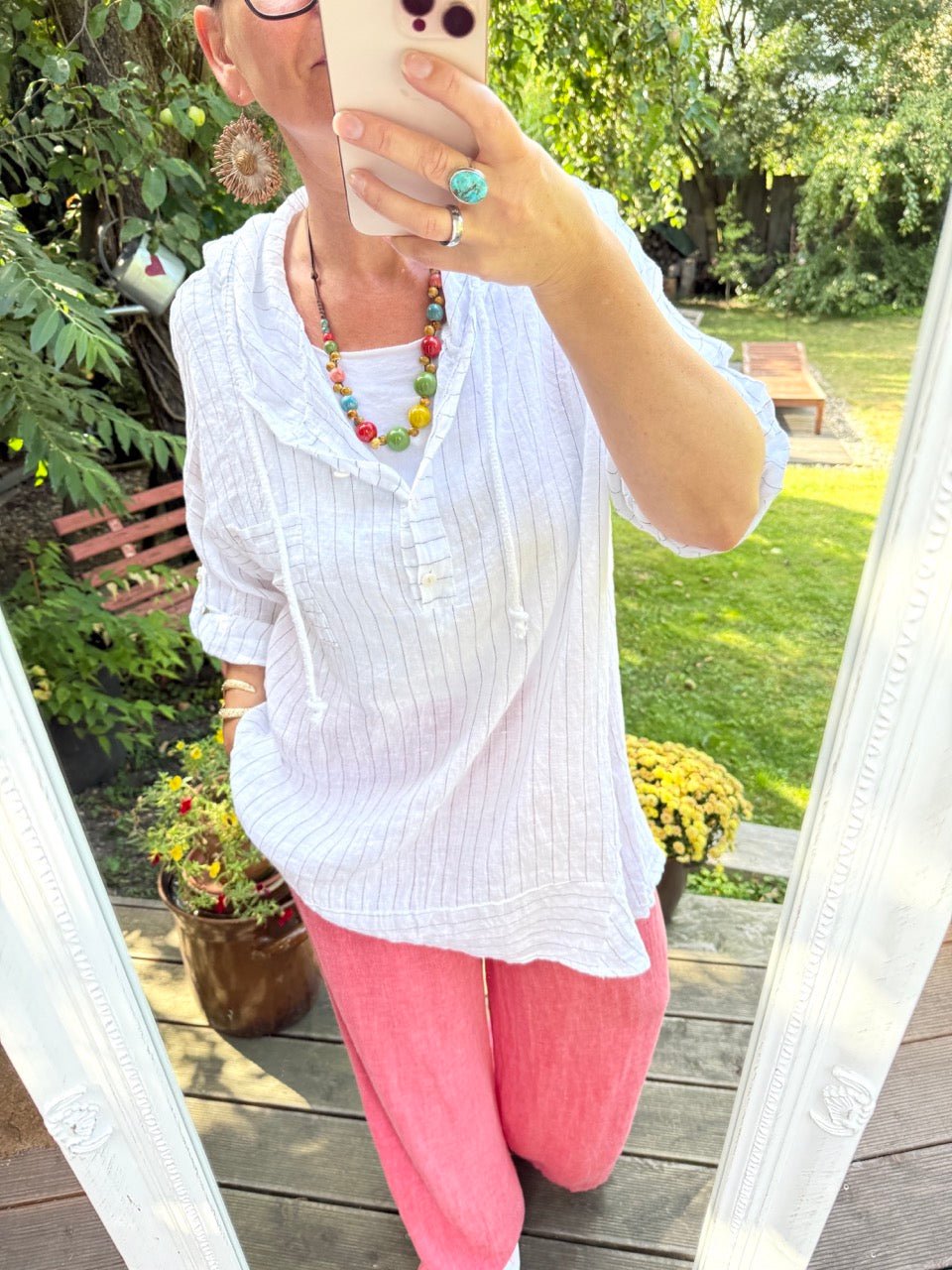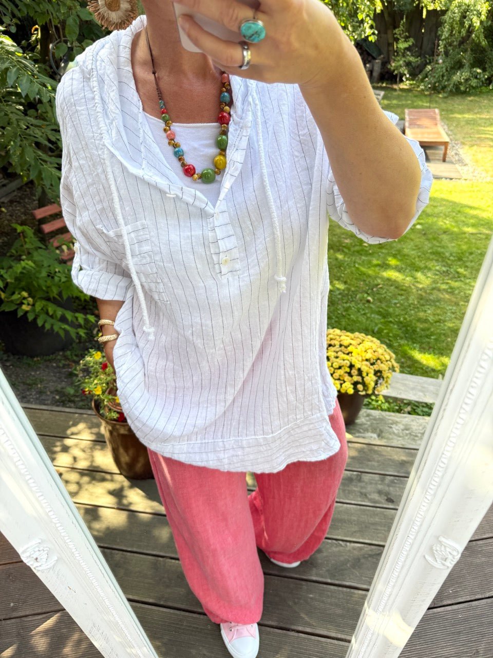 • mit Kapuze, weit geschnitten und aus 100% Leinen
