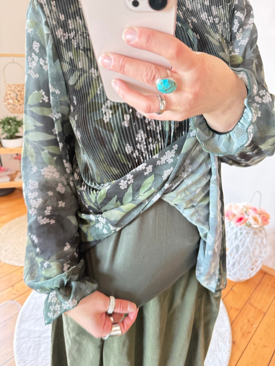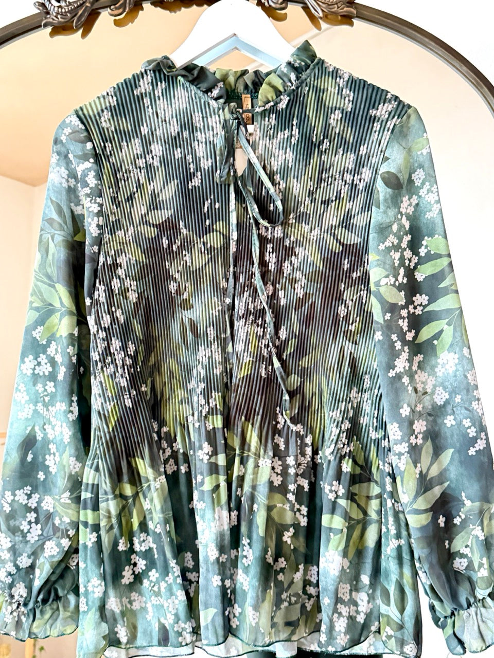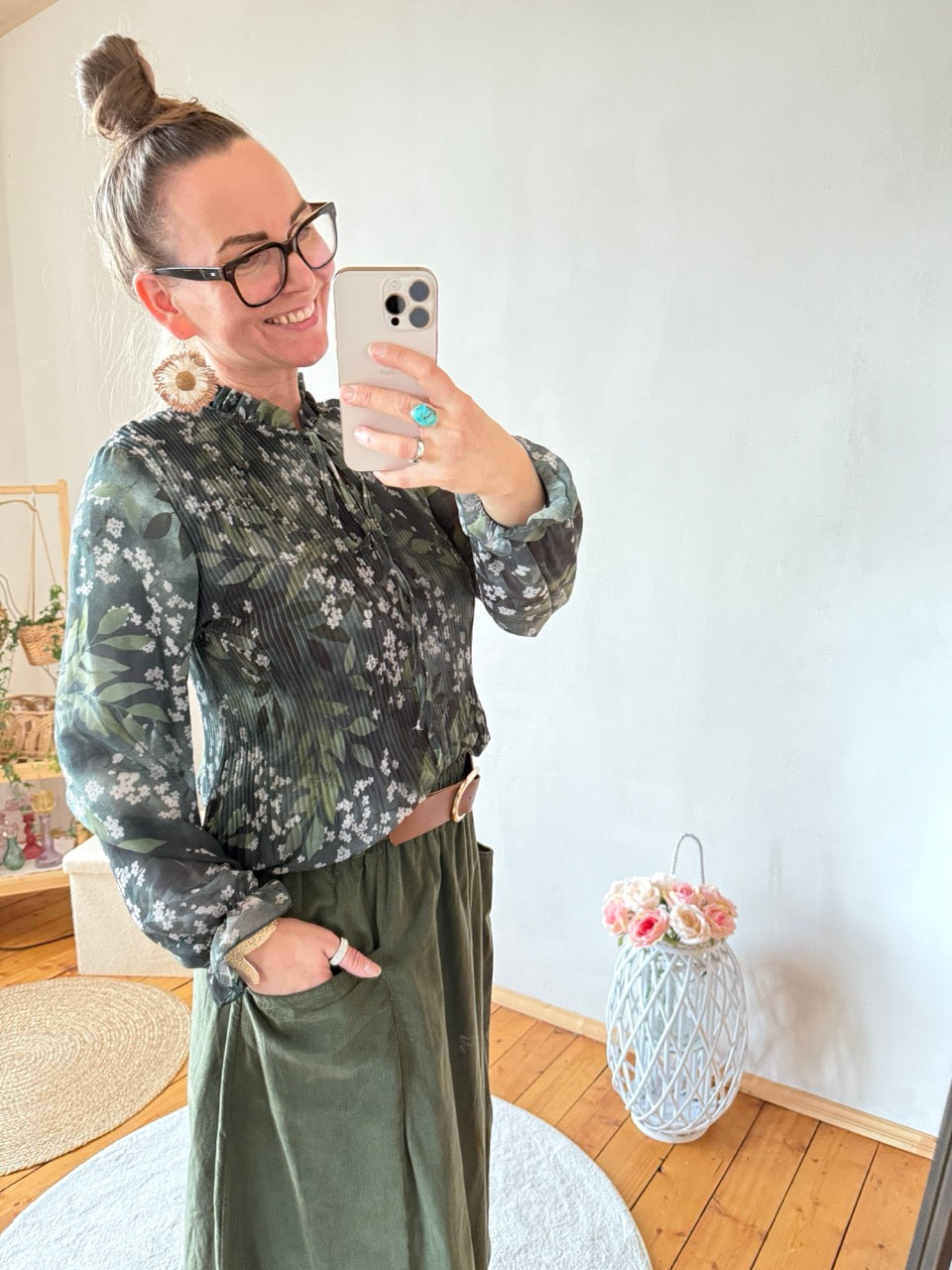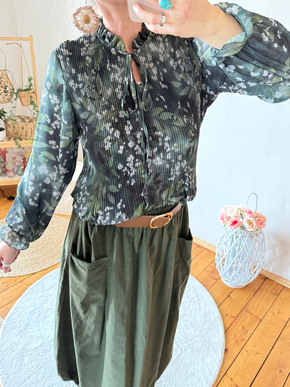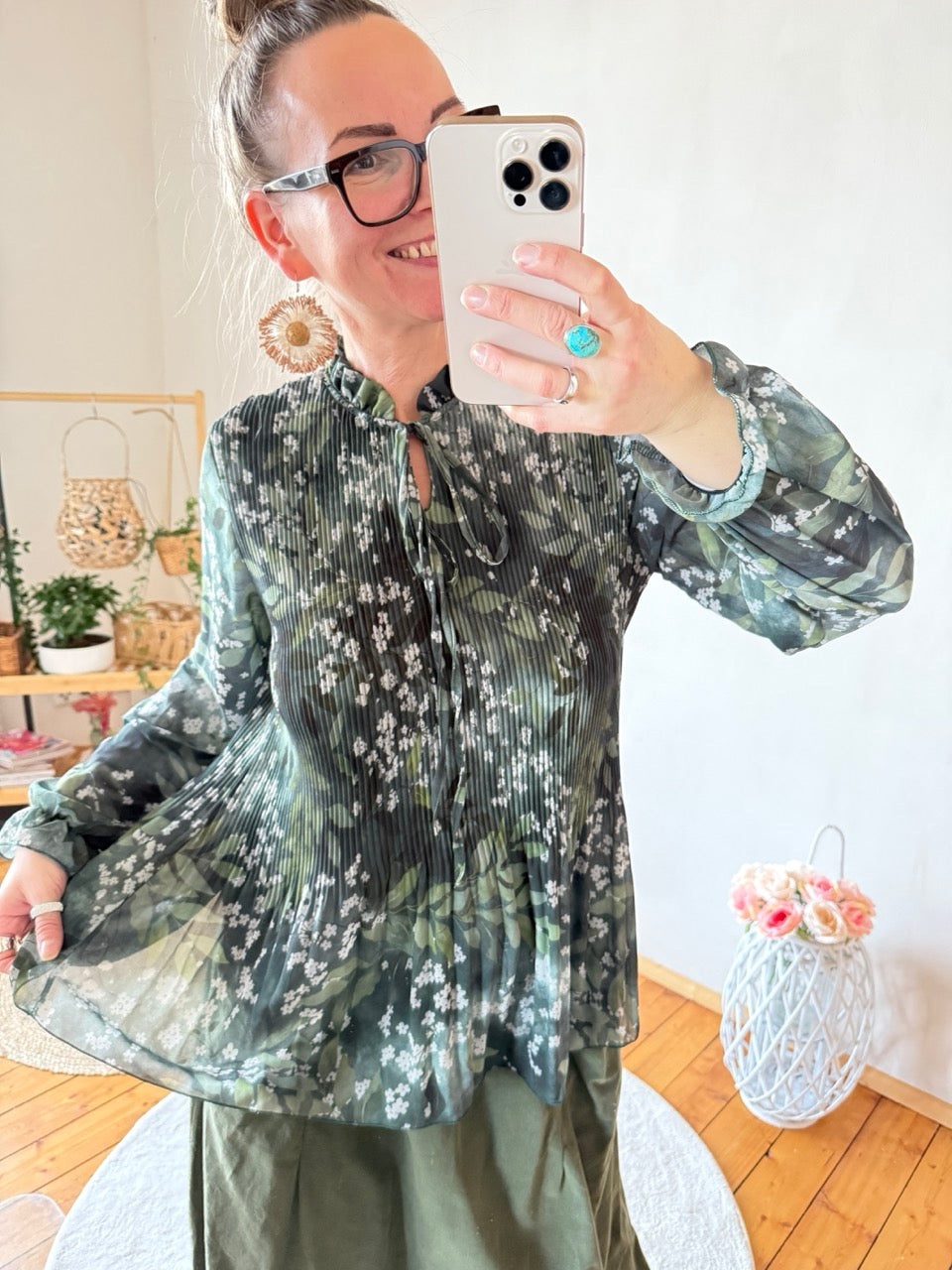 - Wunderschöne, leichte Plissee Schluppen Bluse im Stil der 20er Jahre, unterlegt, mit Blütenmuster in Tannengrün