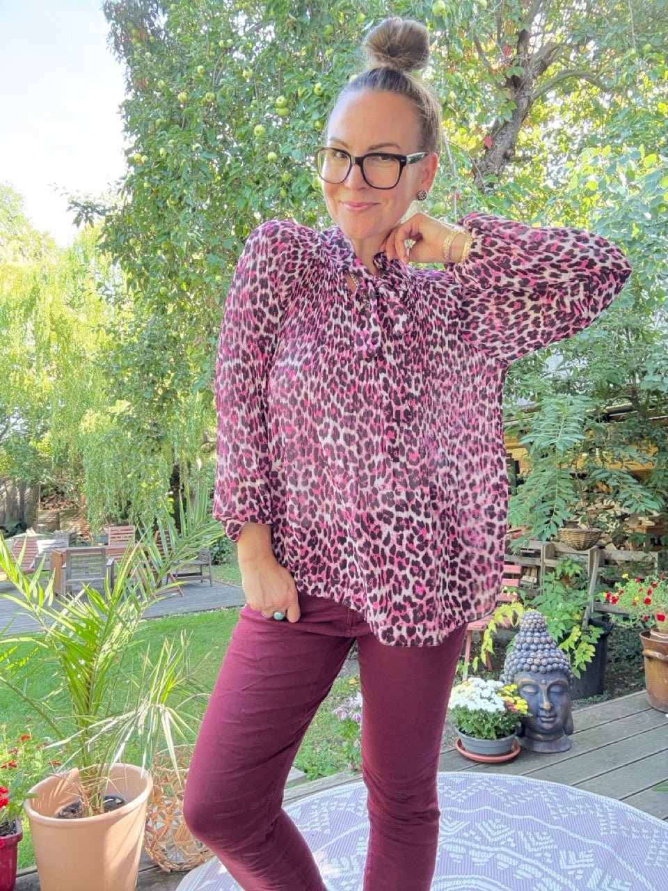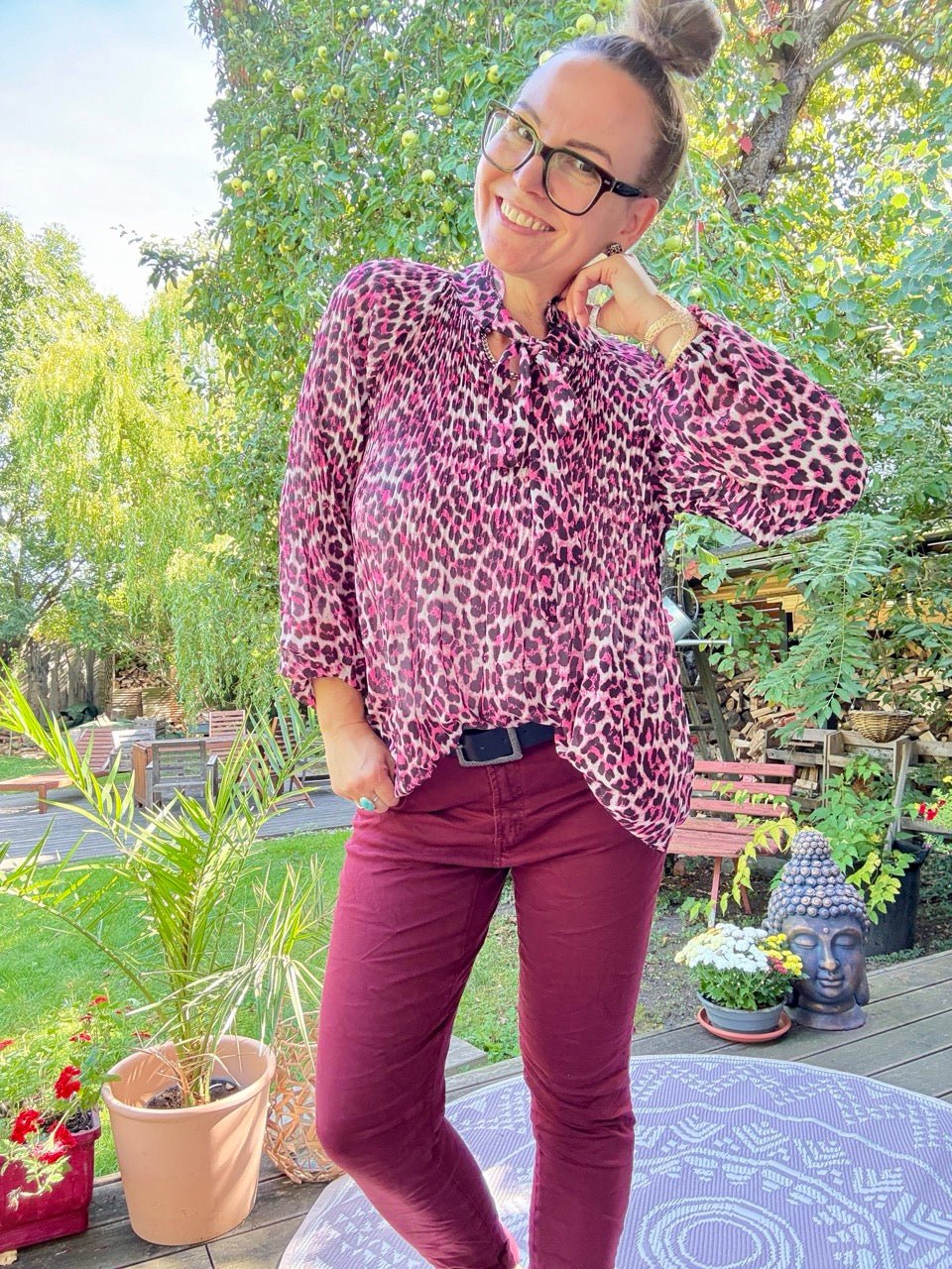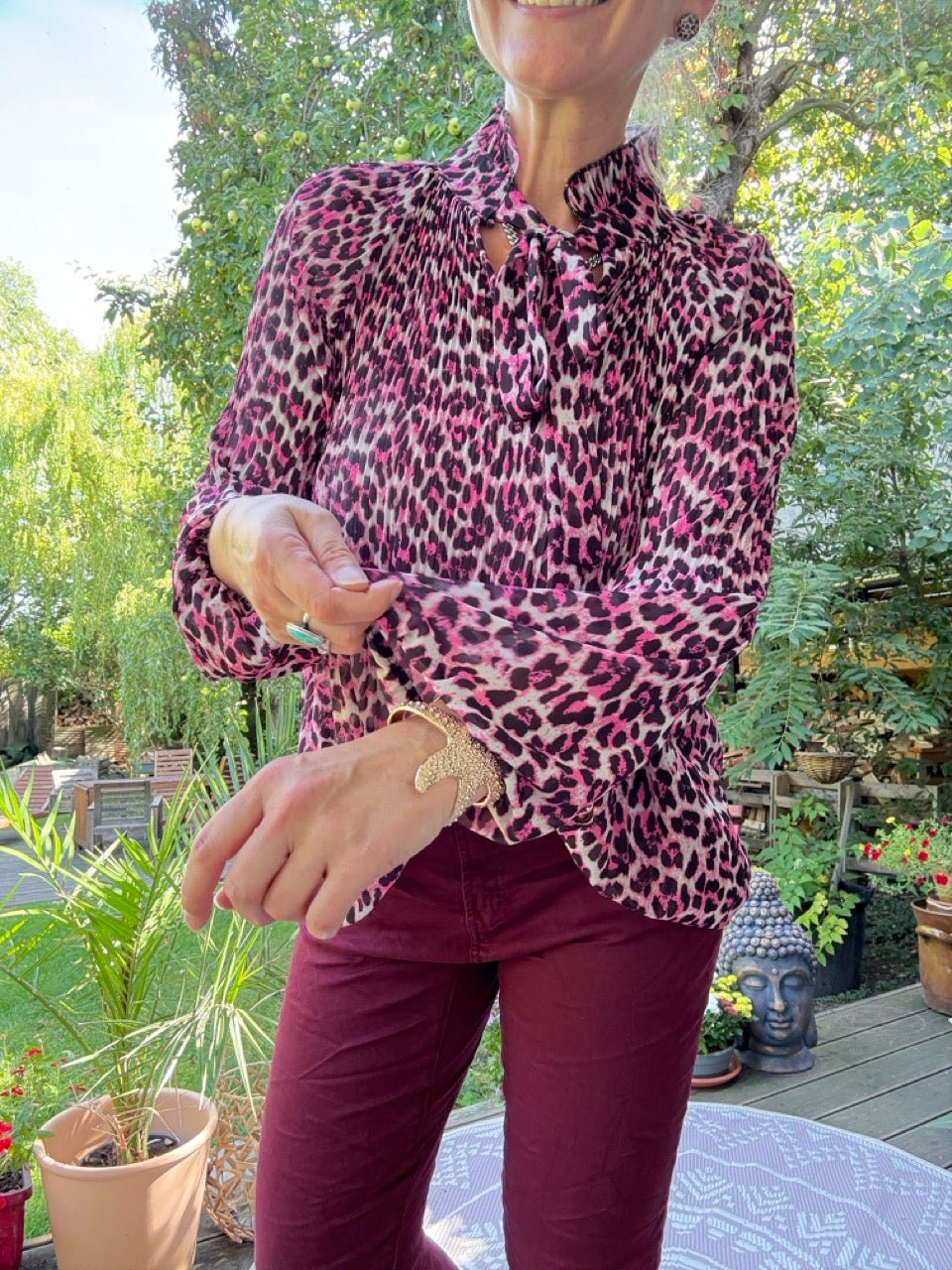 - Wunderschöne, leichte Plissee Schluppen Bluse im Stil der 20er Jahre, in Leo Optik Magenta Weiß