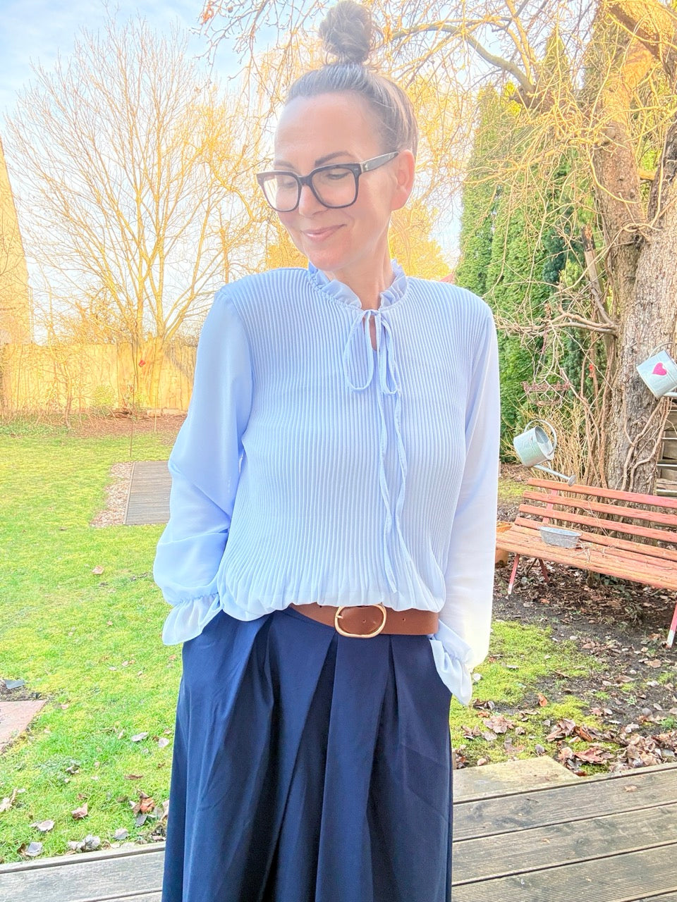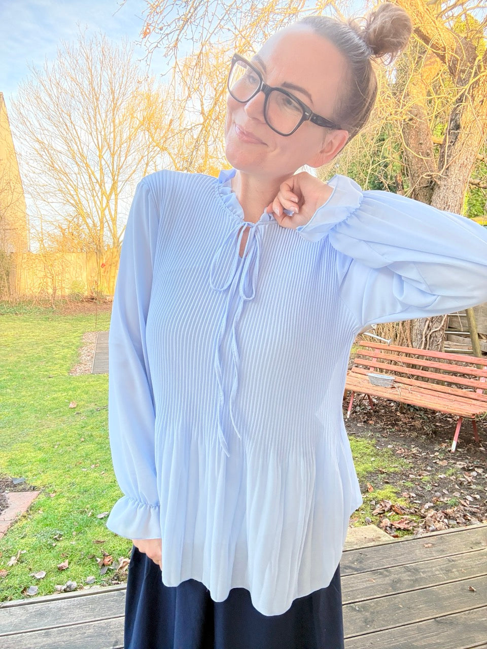 - Wunderschöne, leichte Plissee Schluppen Bluse im Stil der 20er Jahre, unterlegt, in zartem Hellblau