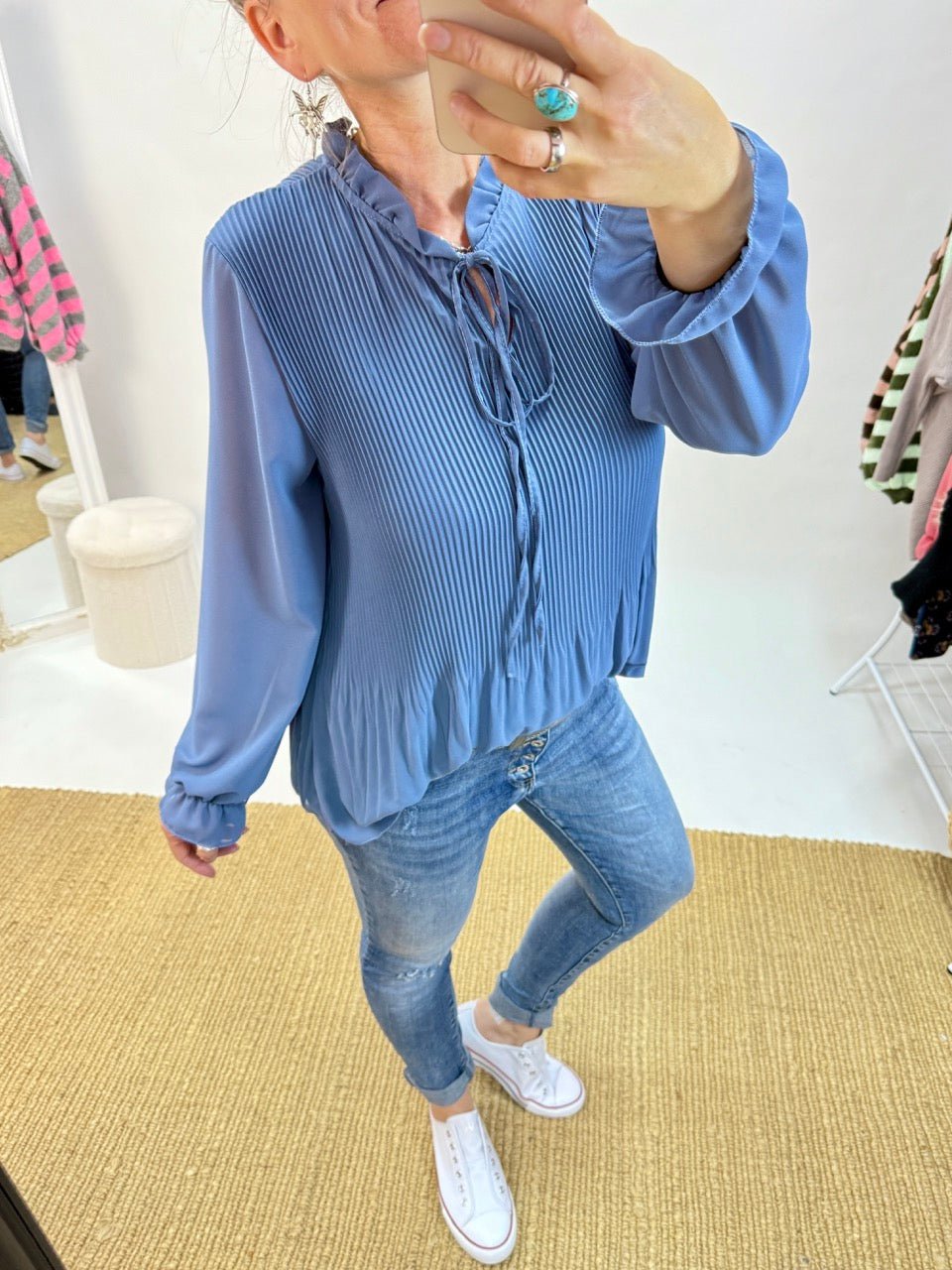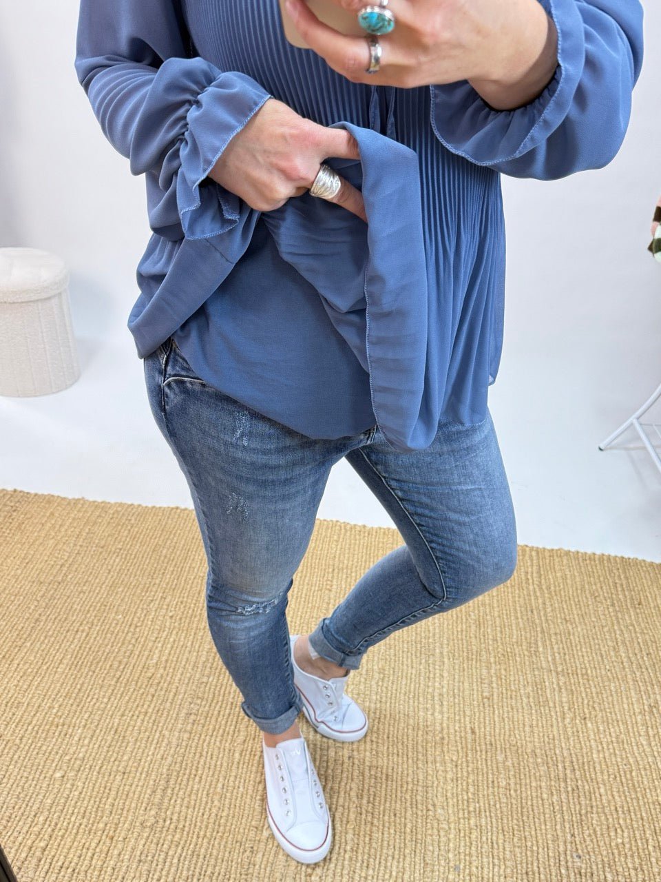 - Wunderschöne, leichte Plissee Schluppen Bluse im Stil der 20er Jahre, unterlegt, in Jeansblau