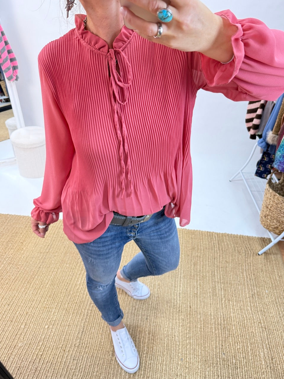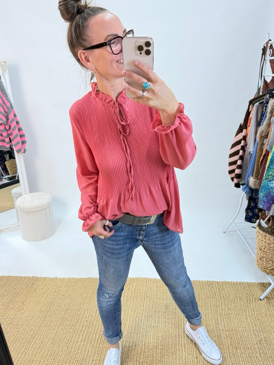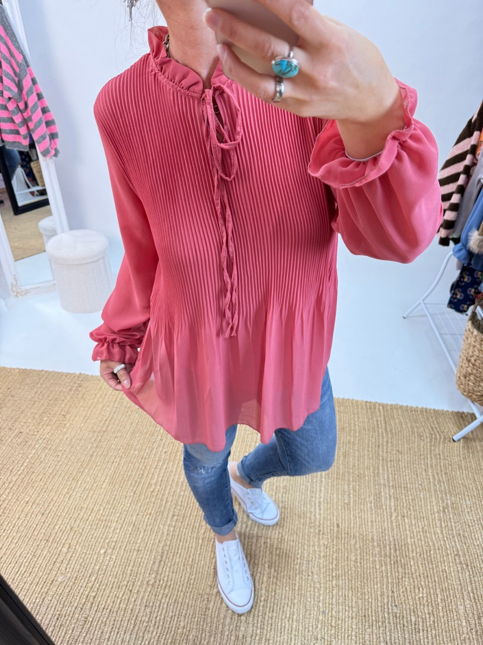 - Wunderschöne, leichte Plissee Schluppen Bluse im Stil der 20er Jahre, unterlegt, in Koralle