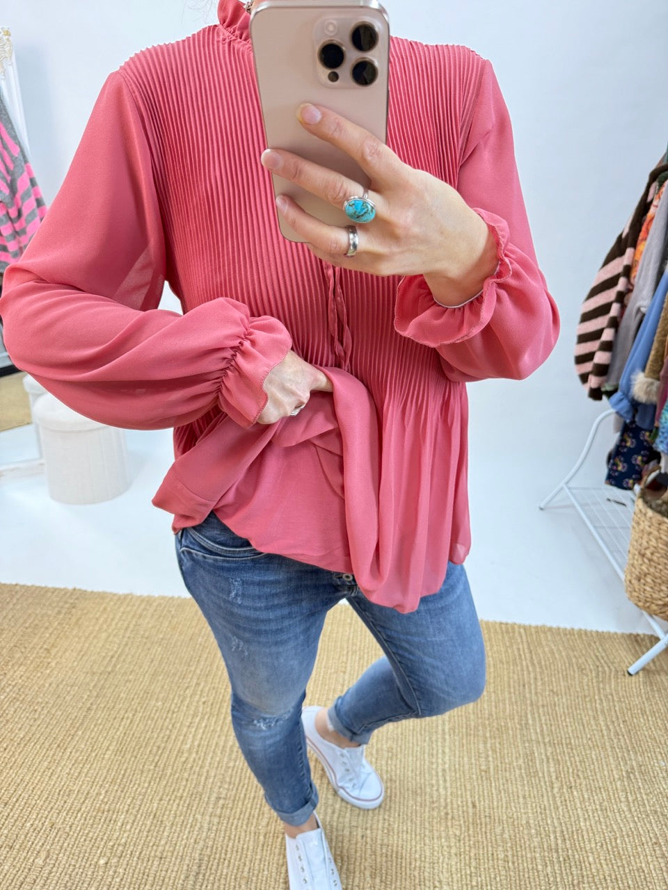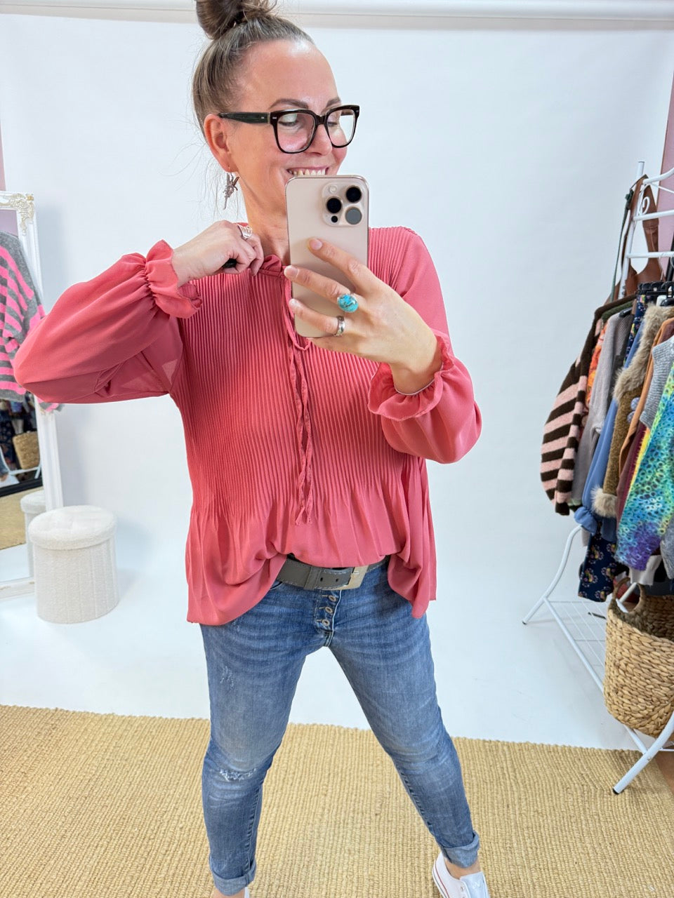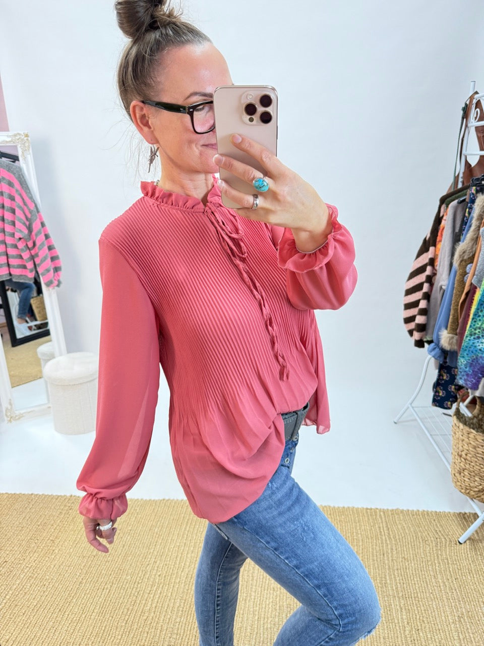 - Wunderschöne, leichte Plissee Schluppen Bluse im Stil der 20er Jahre, unterlegt, in Koralle