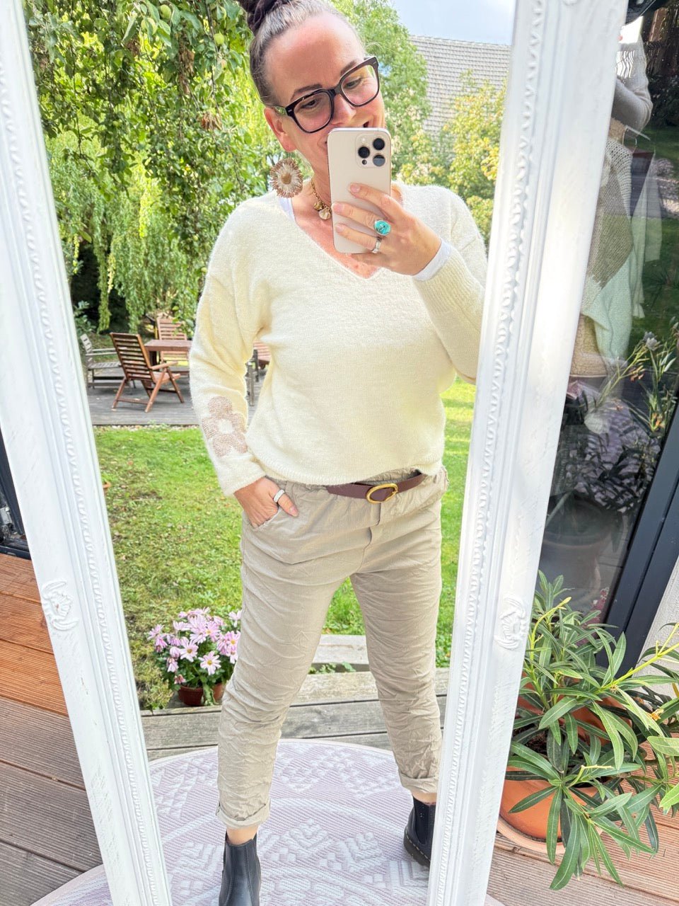 • Flauschiger Pullover mit süßen, zart goldenen Blütendetails auf den Armen und dem Rücken