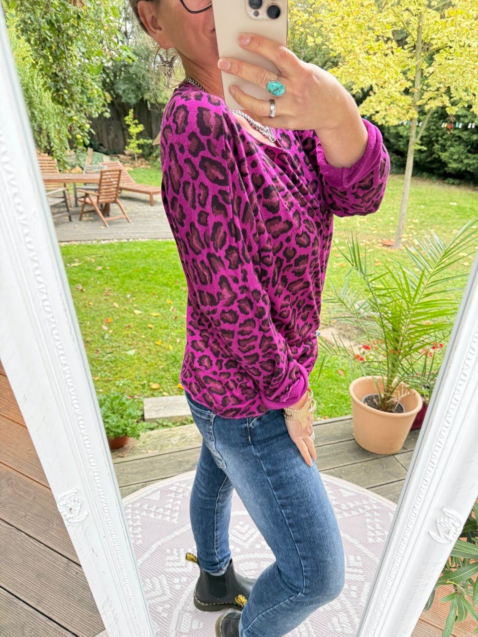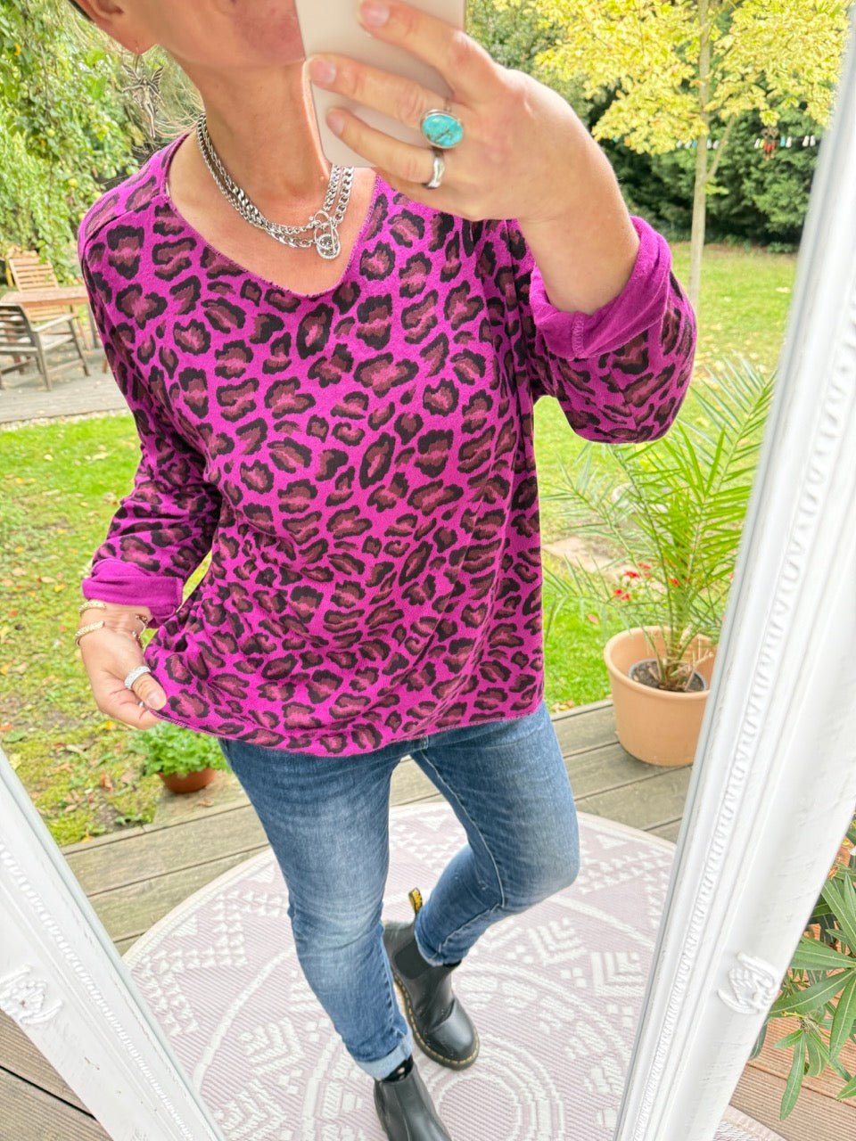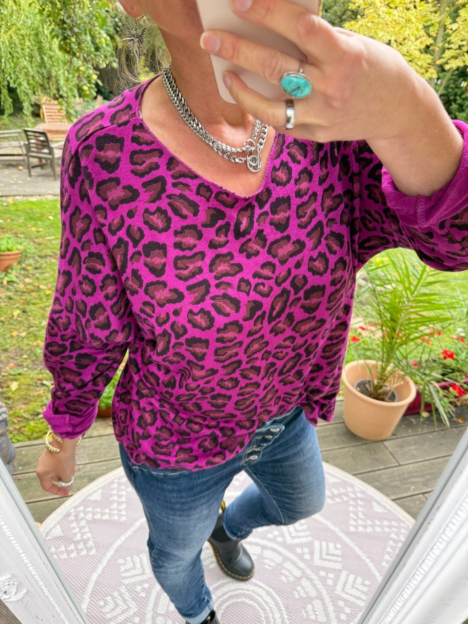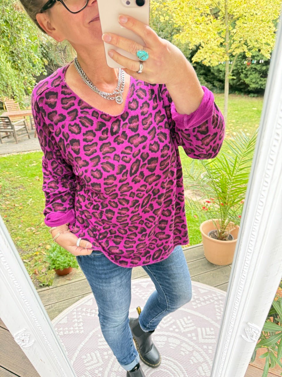 • Lockeres Langarmshirt in Leo Optik aus feinem, leichtem Strick, in Violett