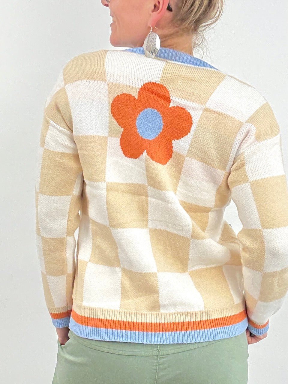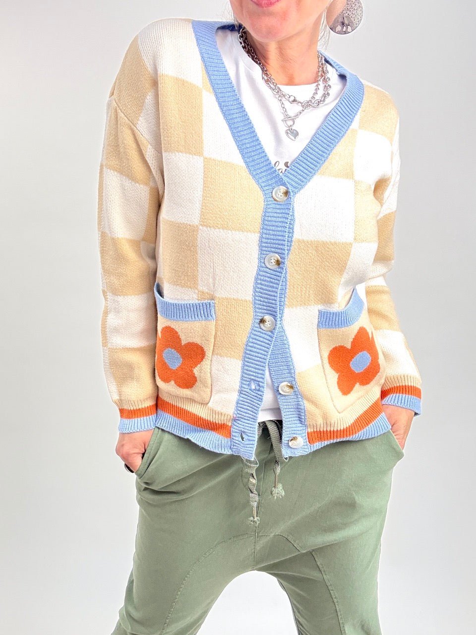 • Coole Strickjacke im karierten Retro Look, mit Blumen Motiv Vorder und Rückseitig