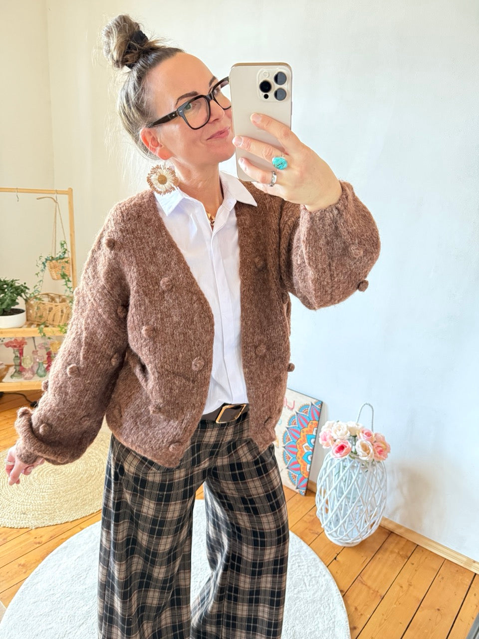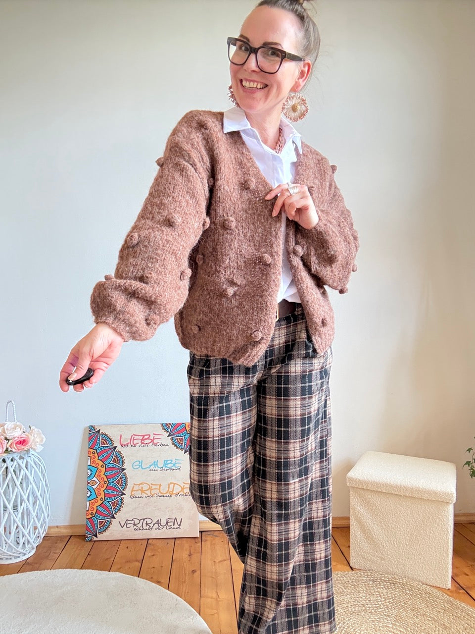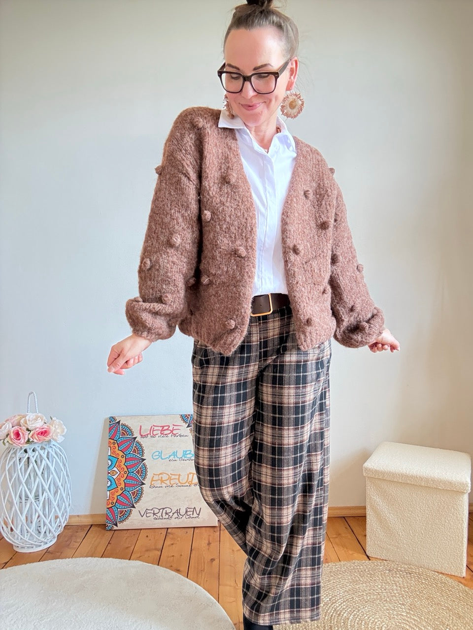 • Super gemütliche, locker geschnittene Strickjacke, in Toffee, mit tollen aufgesetzten Bommeln und kleinem Wollanteil