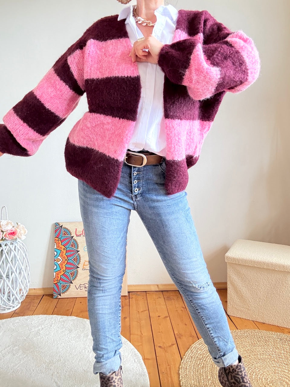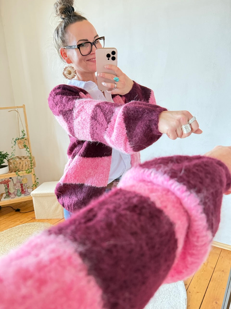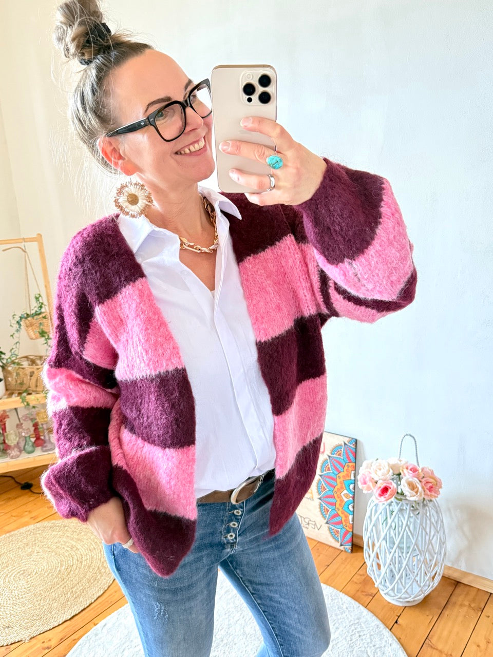 • Super gemütliche, locker geschnittene Strickjacke mit breiten Streifen in Magenta / Fuchsia und kleinem Wollanteil