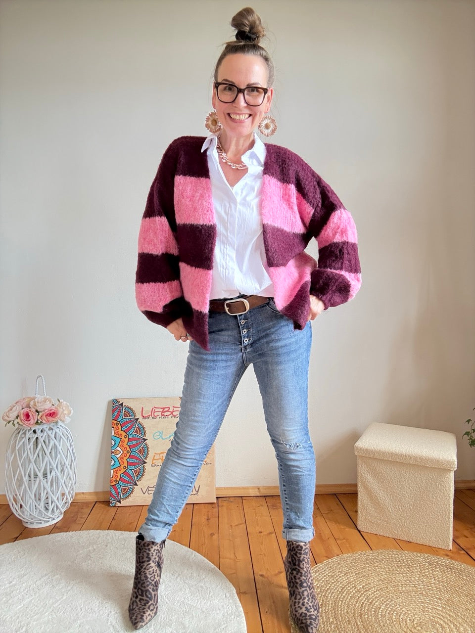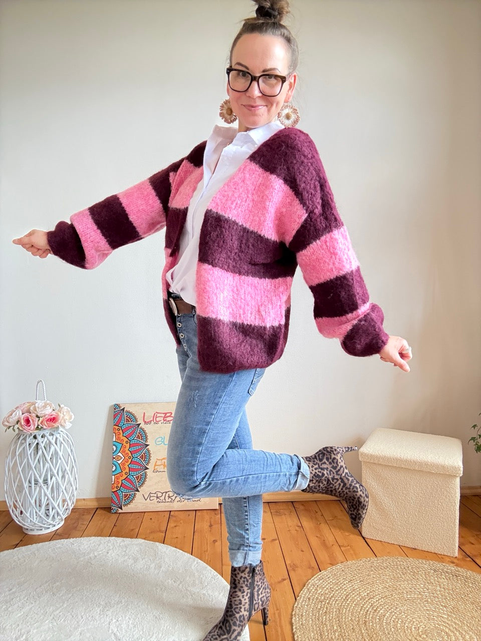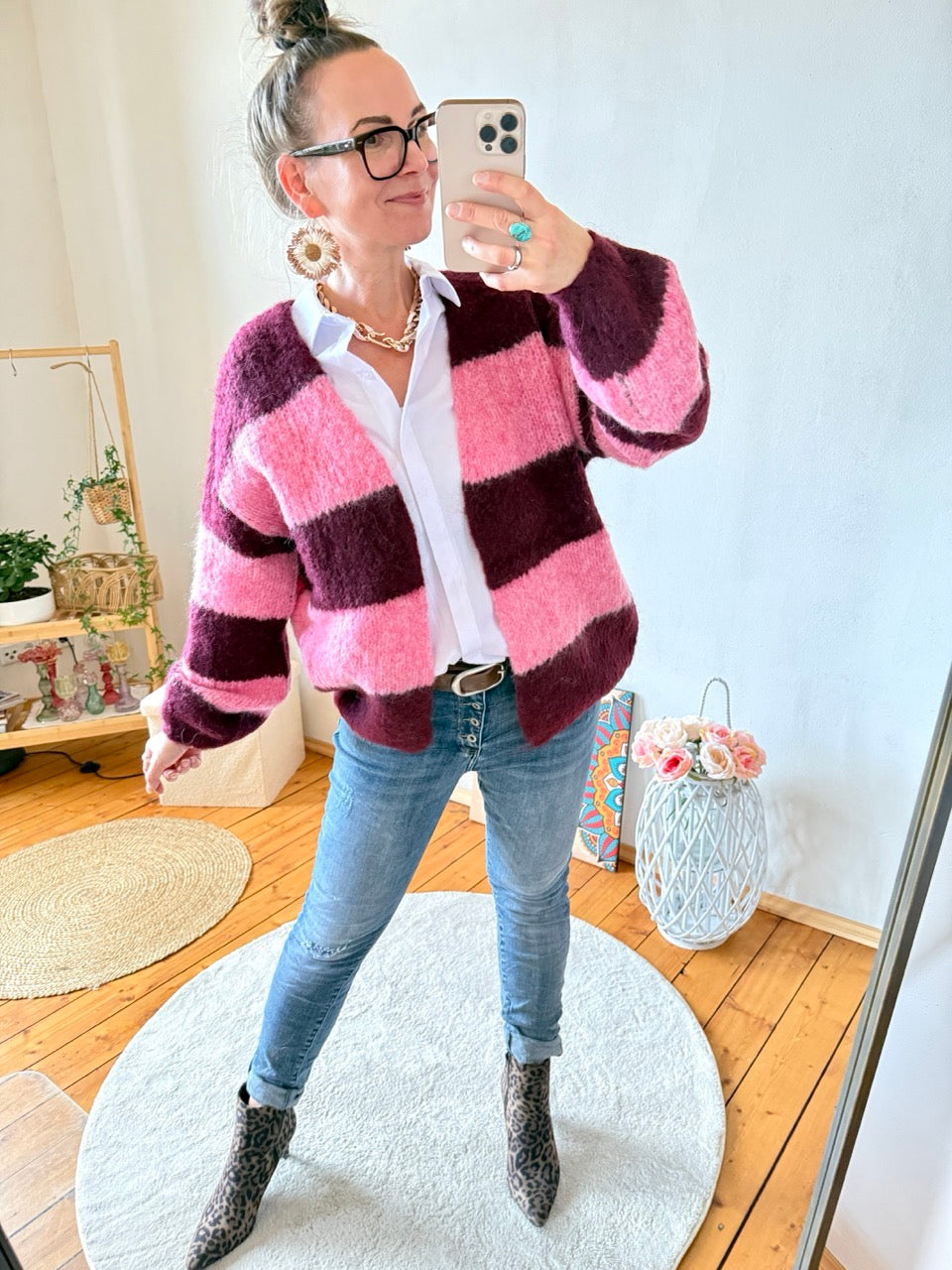 • Super gemütliche, locker geschnittene Strickjacke mit breiten Streifen in Magenta / Fuchsia und kleinem Wollanteil