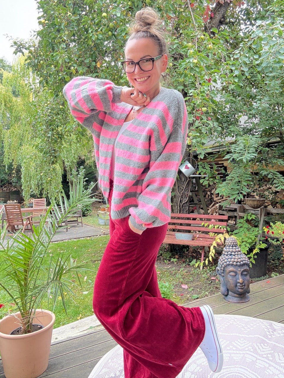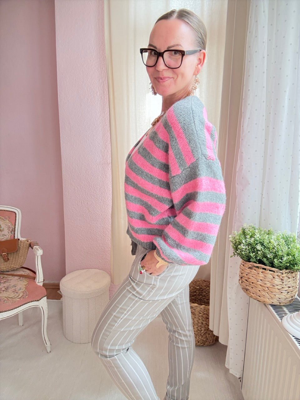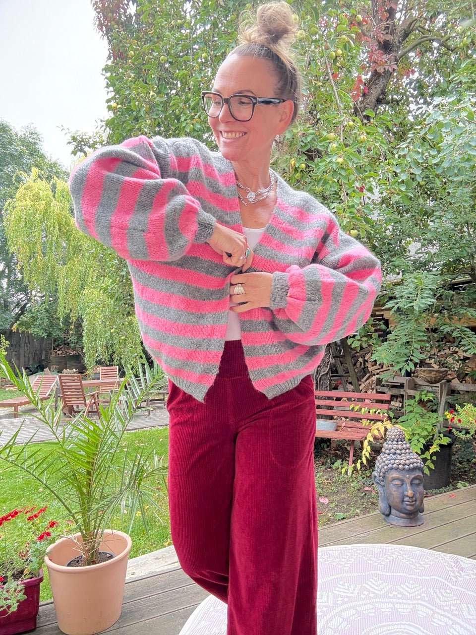 • Super gemütliche, locker geschnittene Strickjacke mit Streifen in Hellgrau / Rose und kleinem Wollanteil