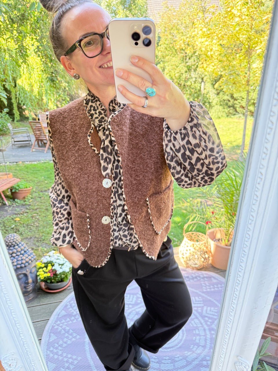 • Besondere Details: silberfarbene Knöpfe & Leo-Zierband