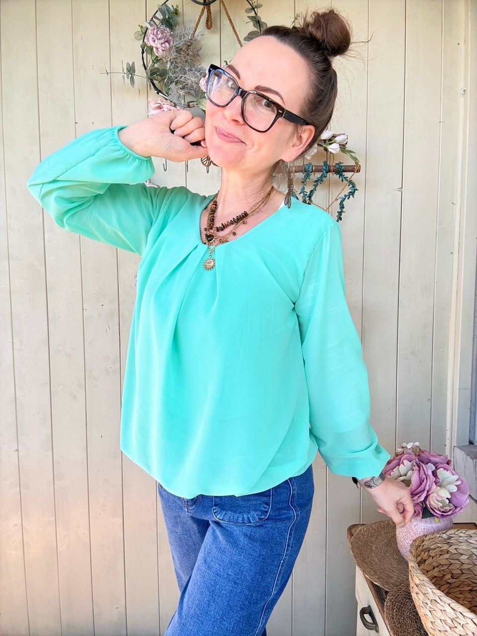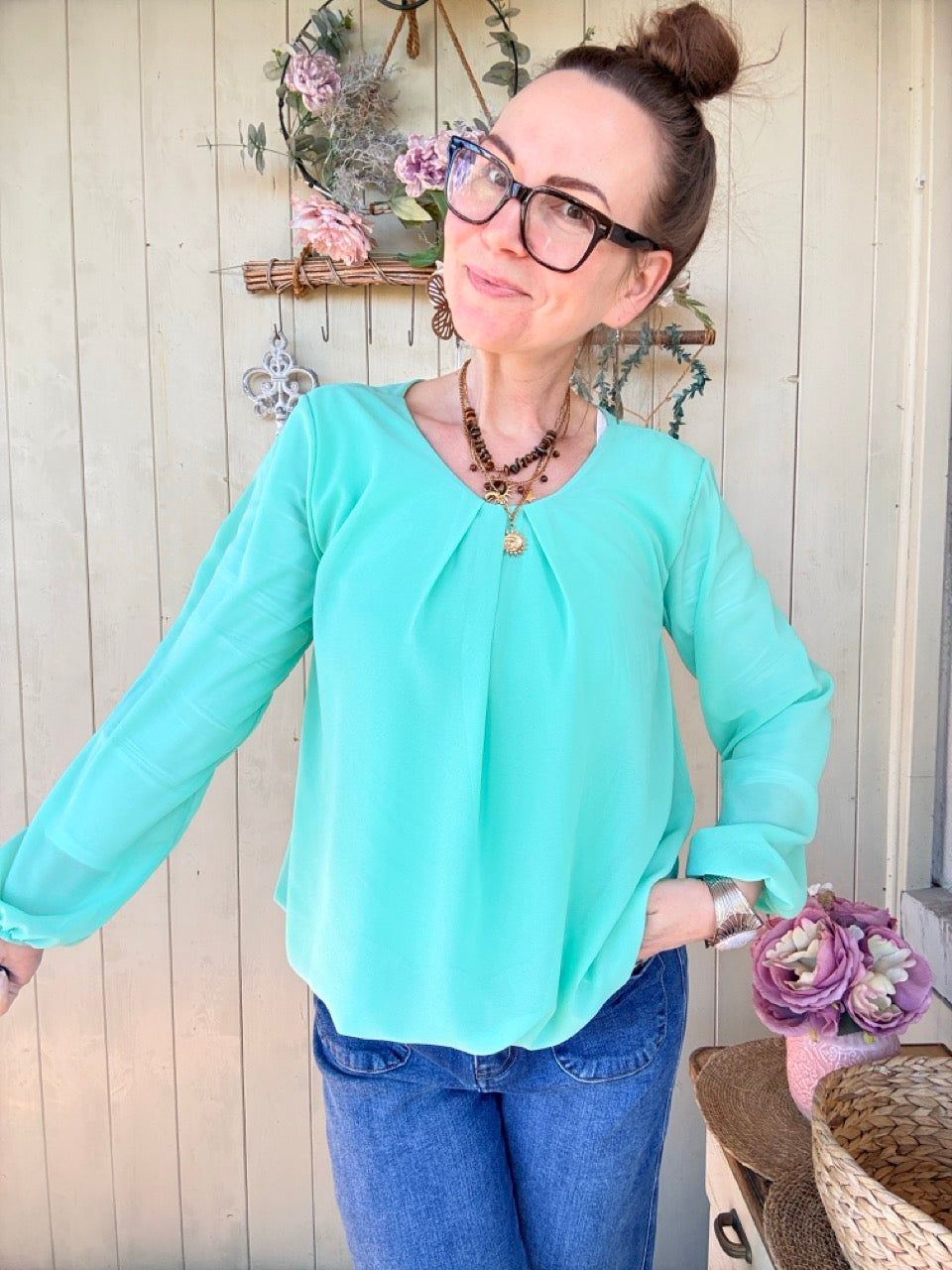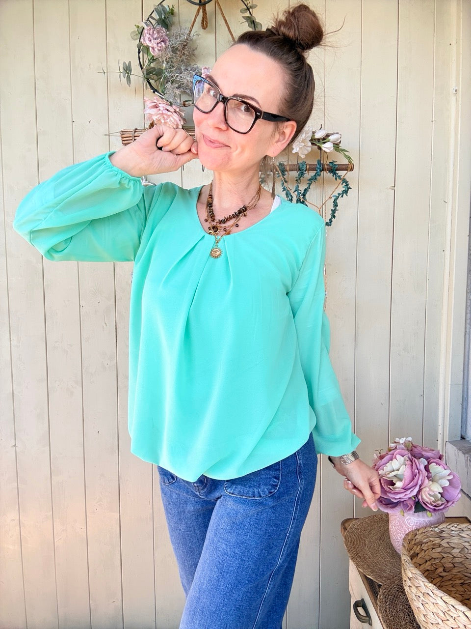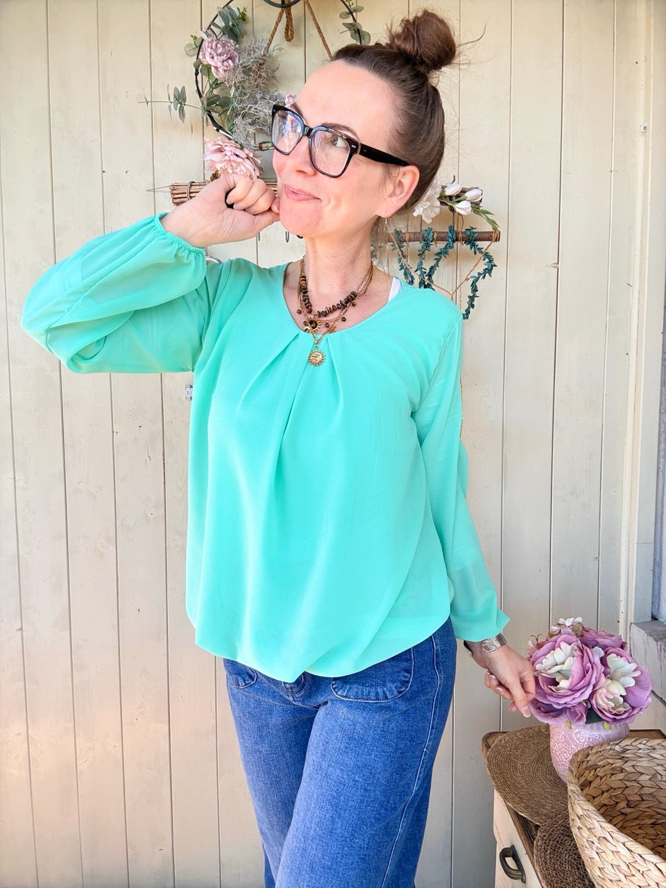 • Rundhalsausschnitt leicht gesmookt, lange Arme mit Gummibund