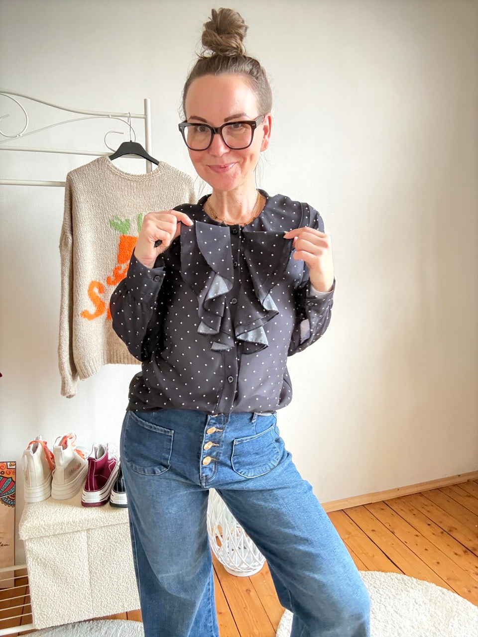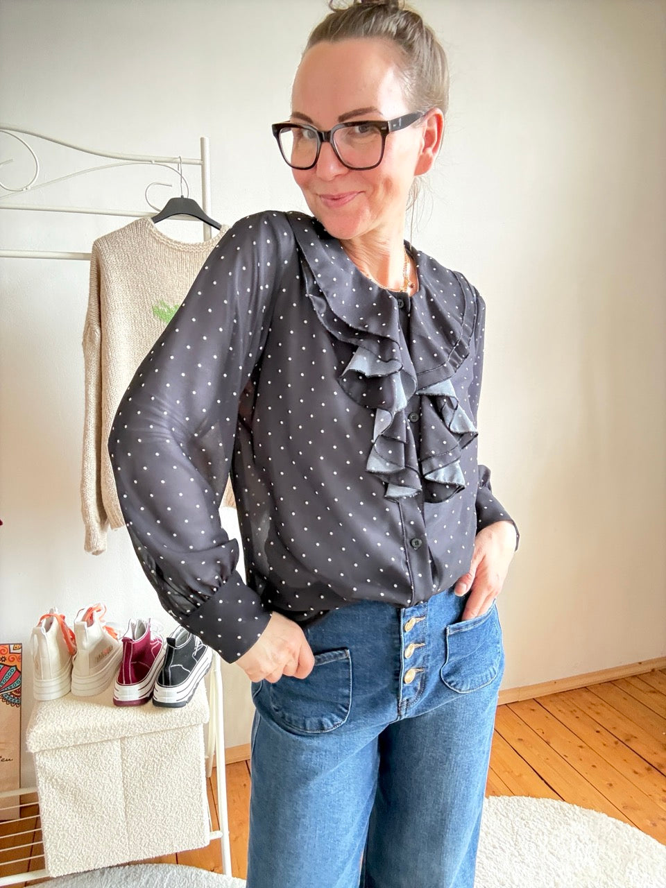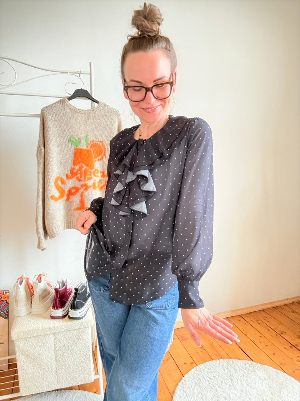 - Wunderschöne, leichte Rüschen Bluse in Schwarz mit Punkten
