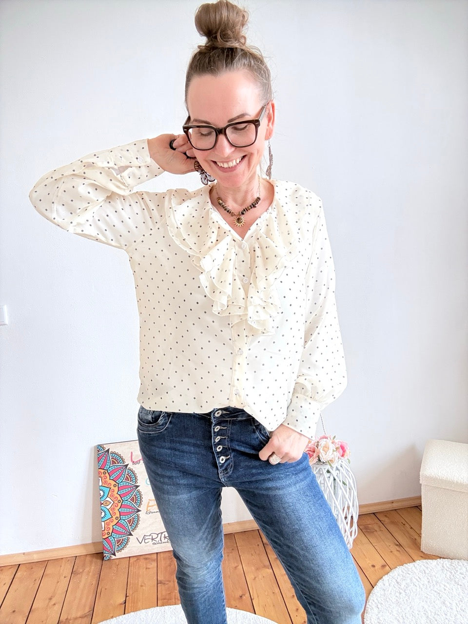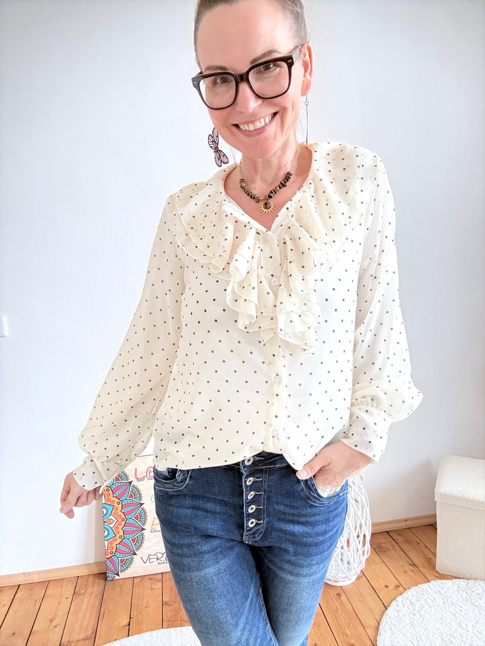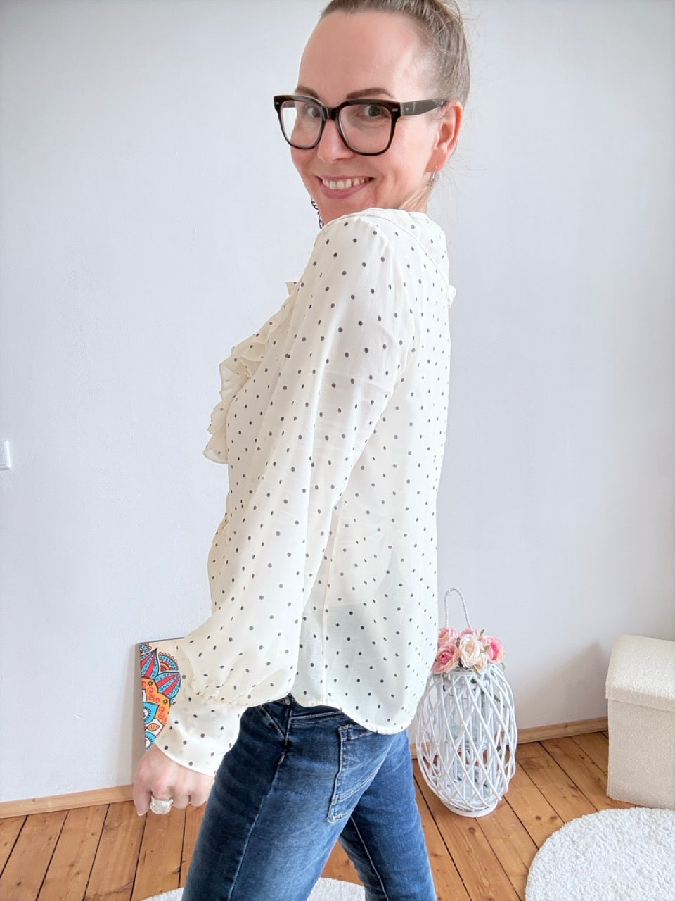 - Wunderschöne, leichte Rüschen Bluse in Weiß, mit Punkten