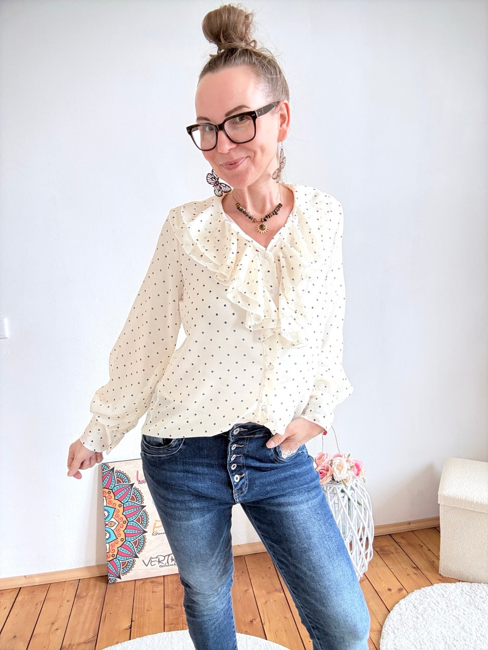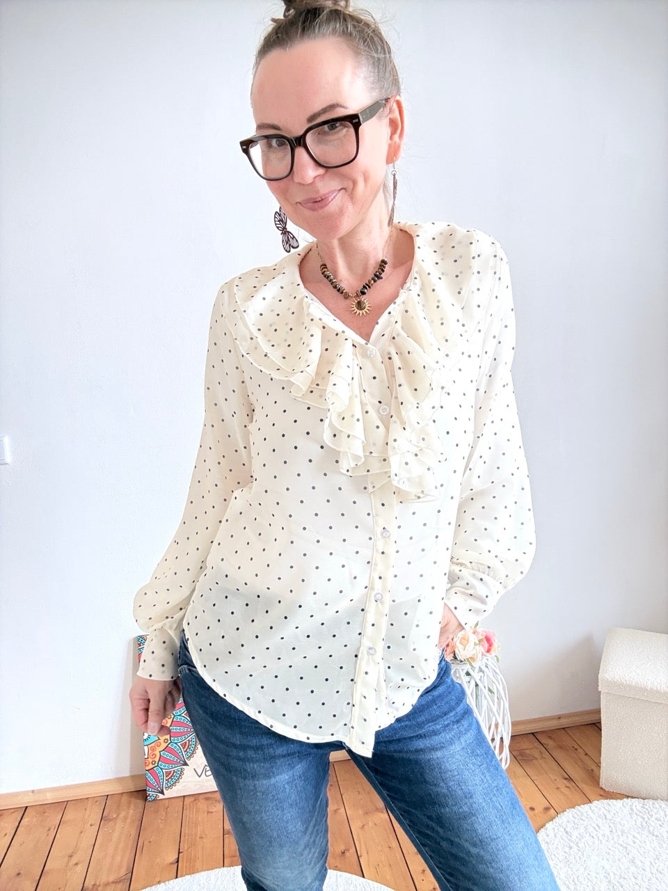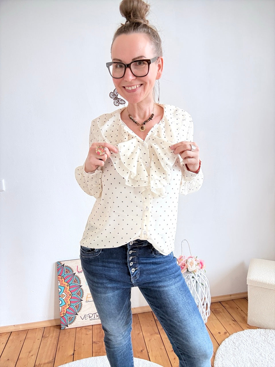 - Wunderschöne, leichte Rüschen Bluse in Weiß, mit Punkten