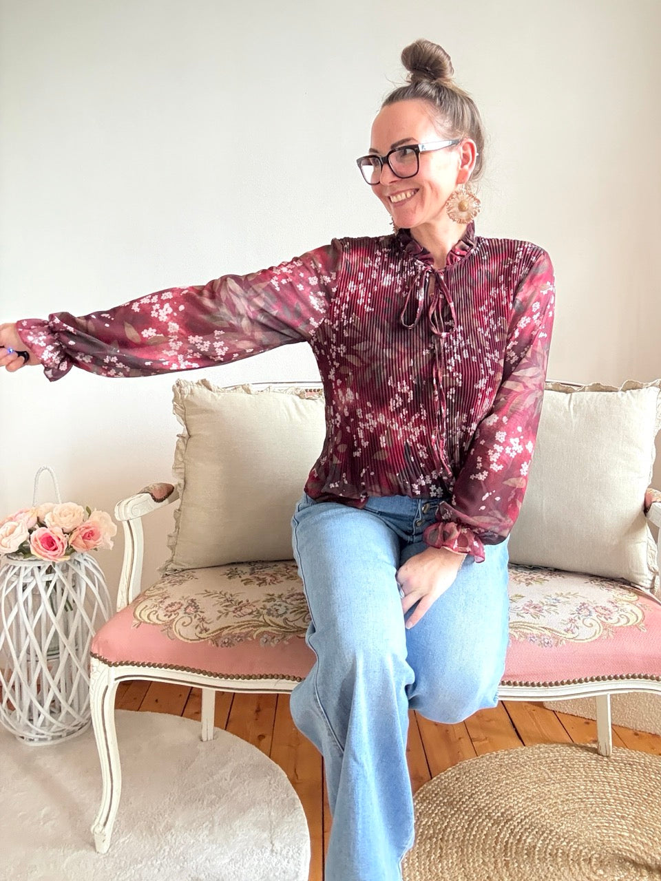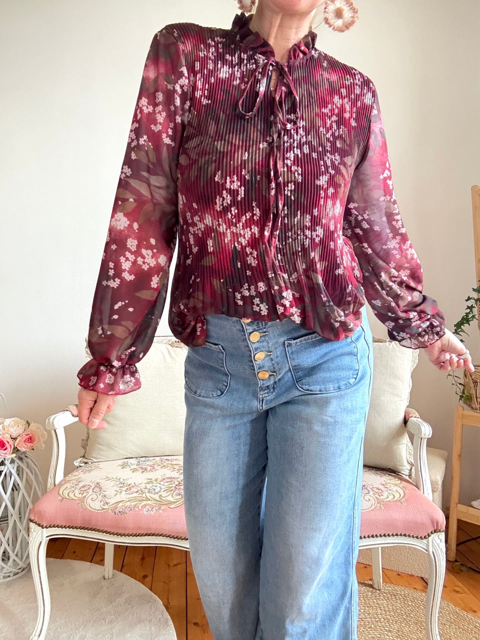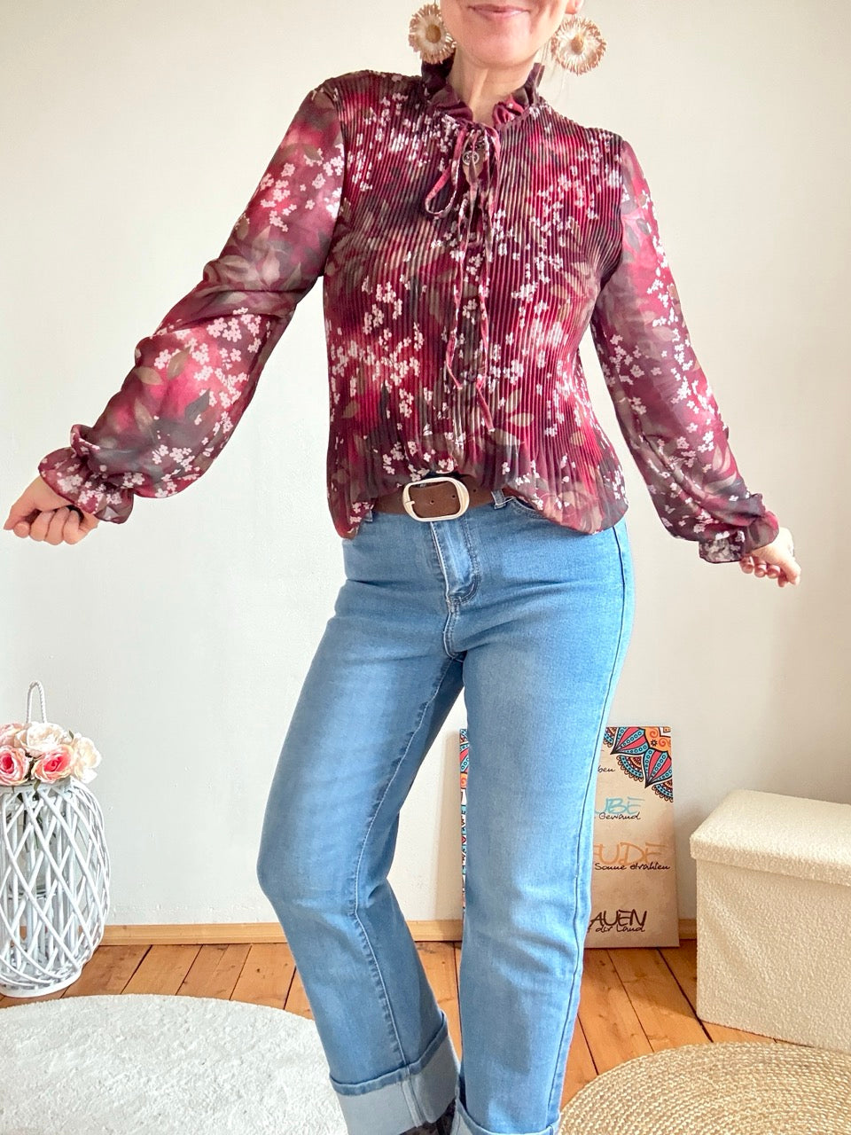 - Wunderschöne, leichte Plissee Schluppen Bluse im Stil der 20er Jahre, unterlegt, mit Blütenmuster in Cherry