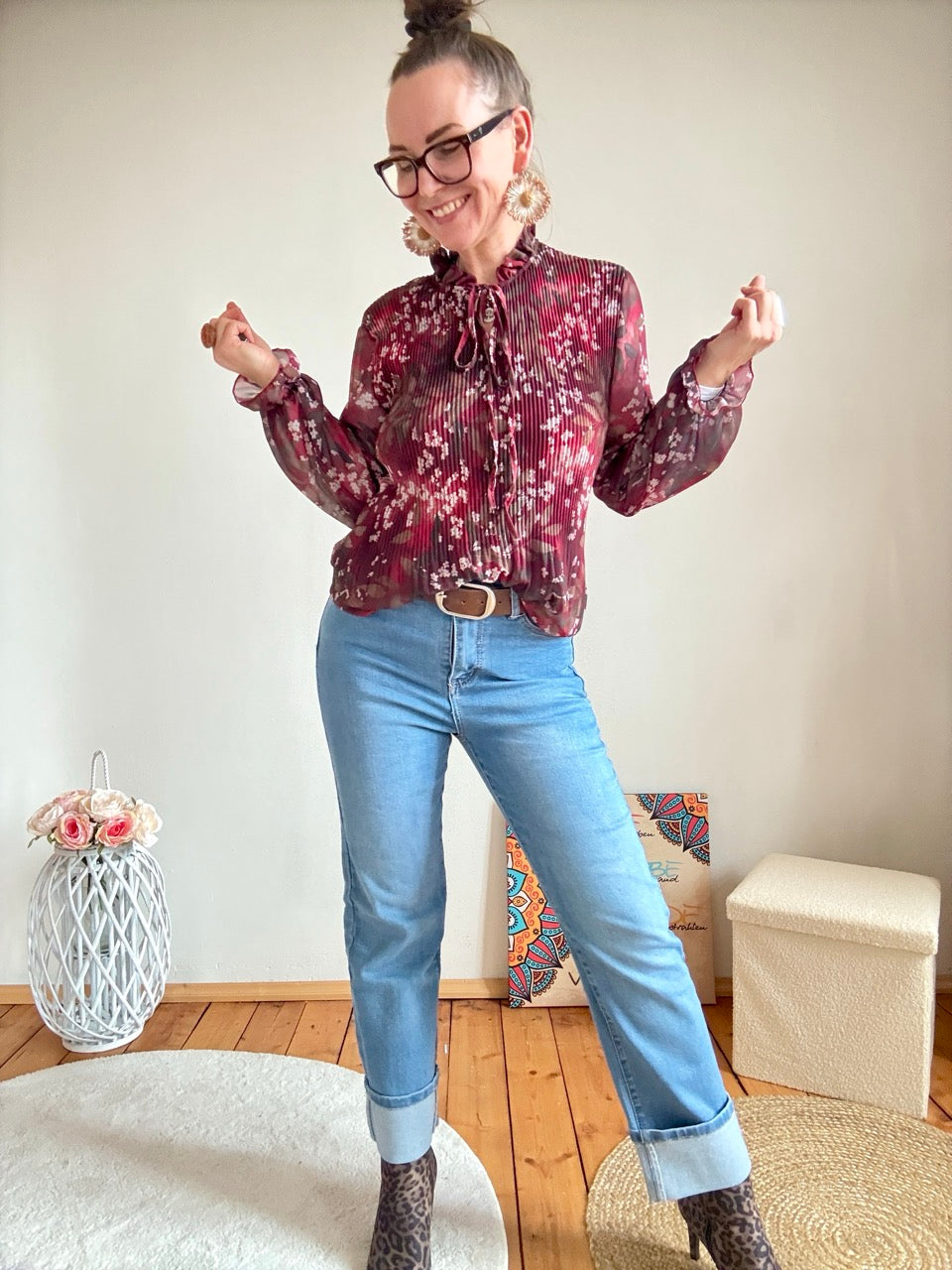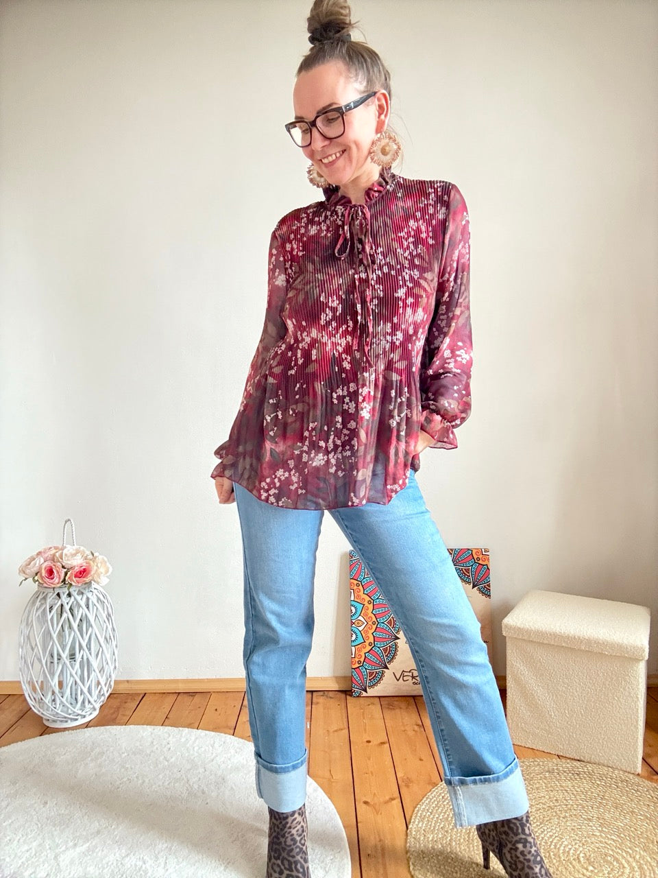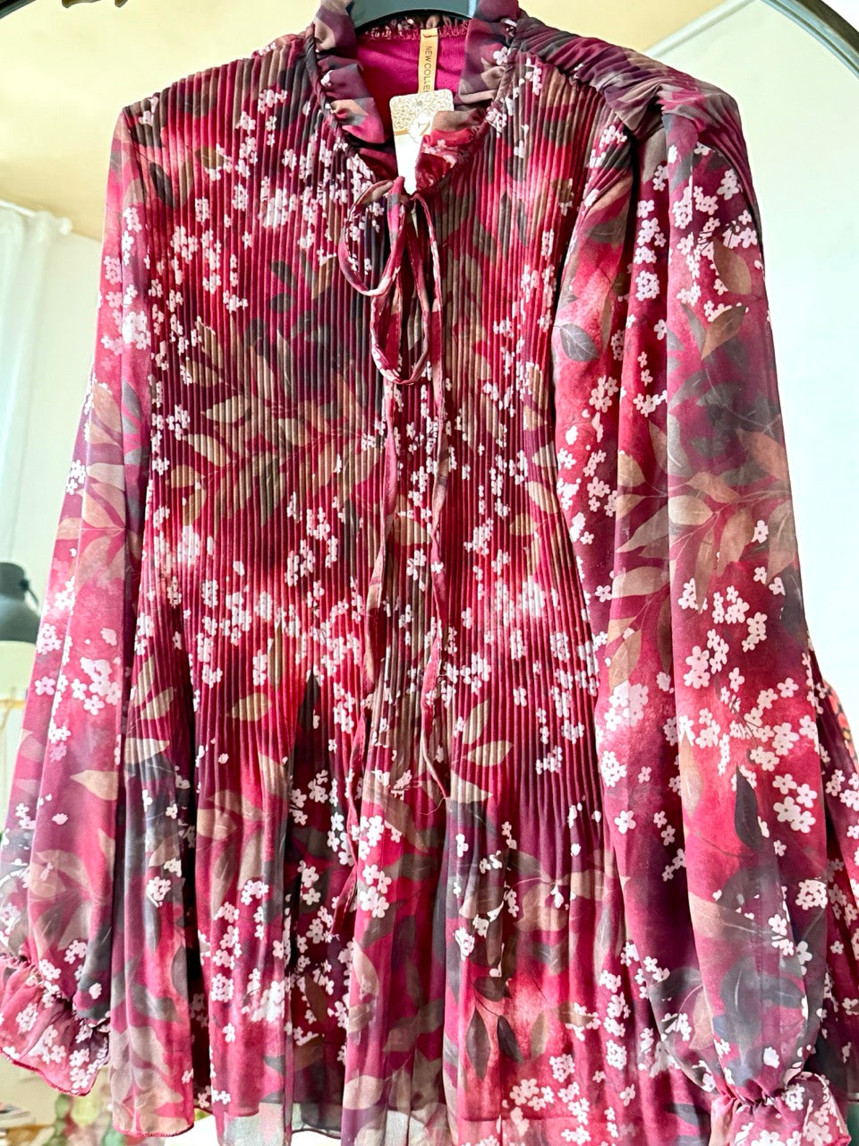 - Wunderschöne, leichte Plissee Schluppen Bluse im Stil der 20er Jahre, unterlegt, mit Blütenmuster in Cherry