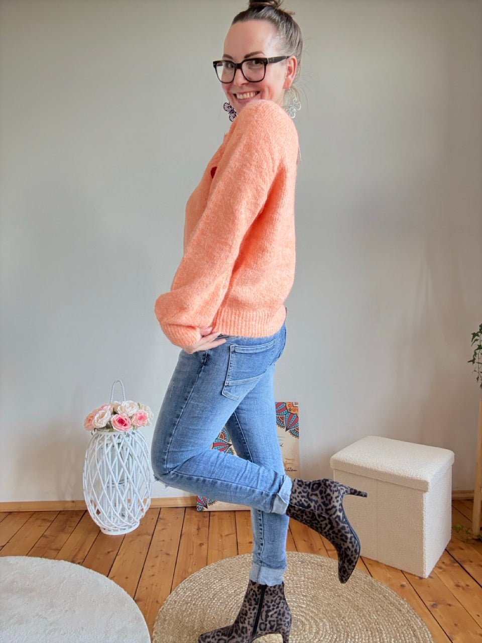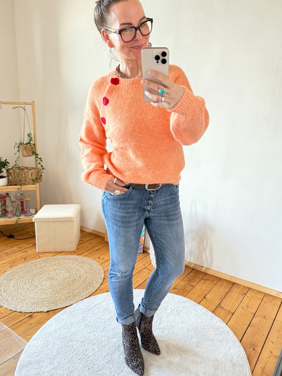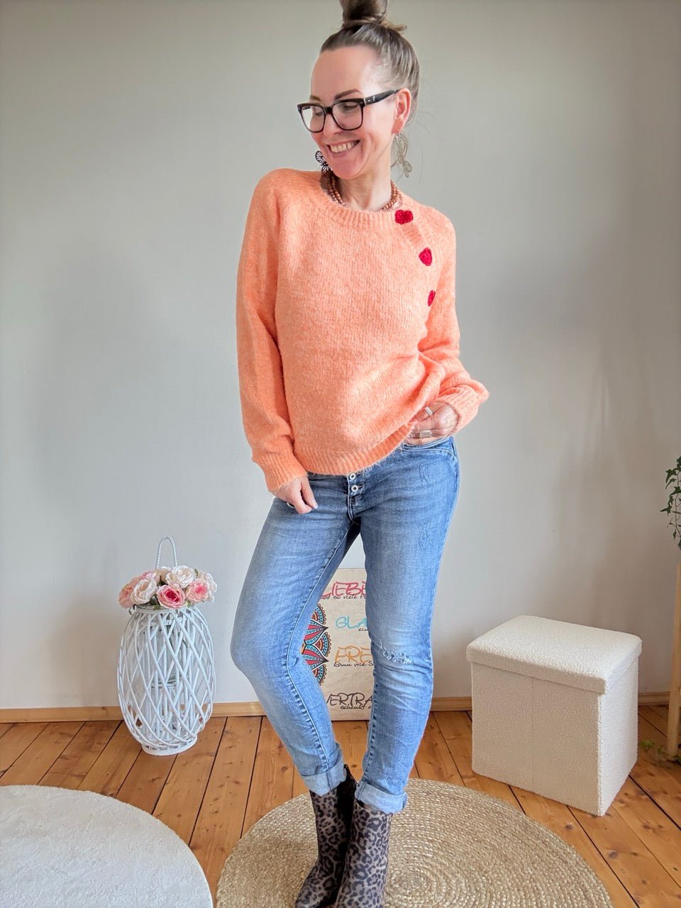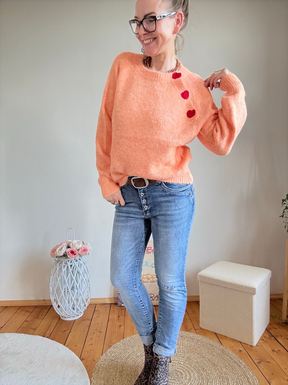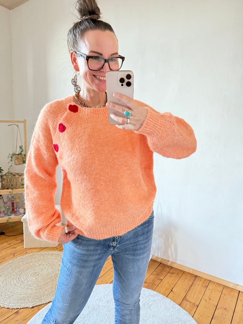 • Zauberhafter Pulli, in Orange, mit gesticktem Herzen entlang der Schulter, mit kleinem Wollanteil