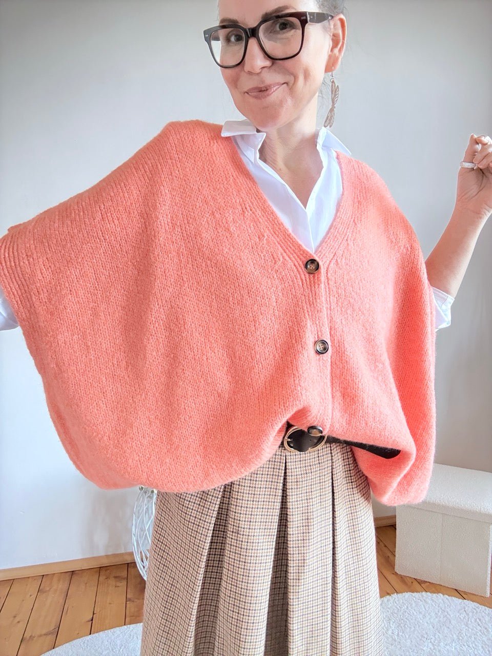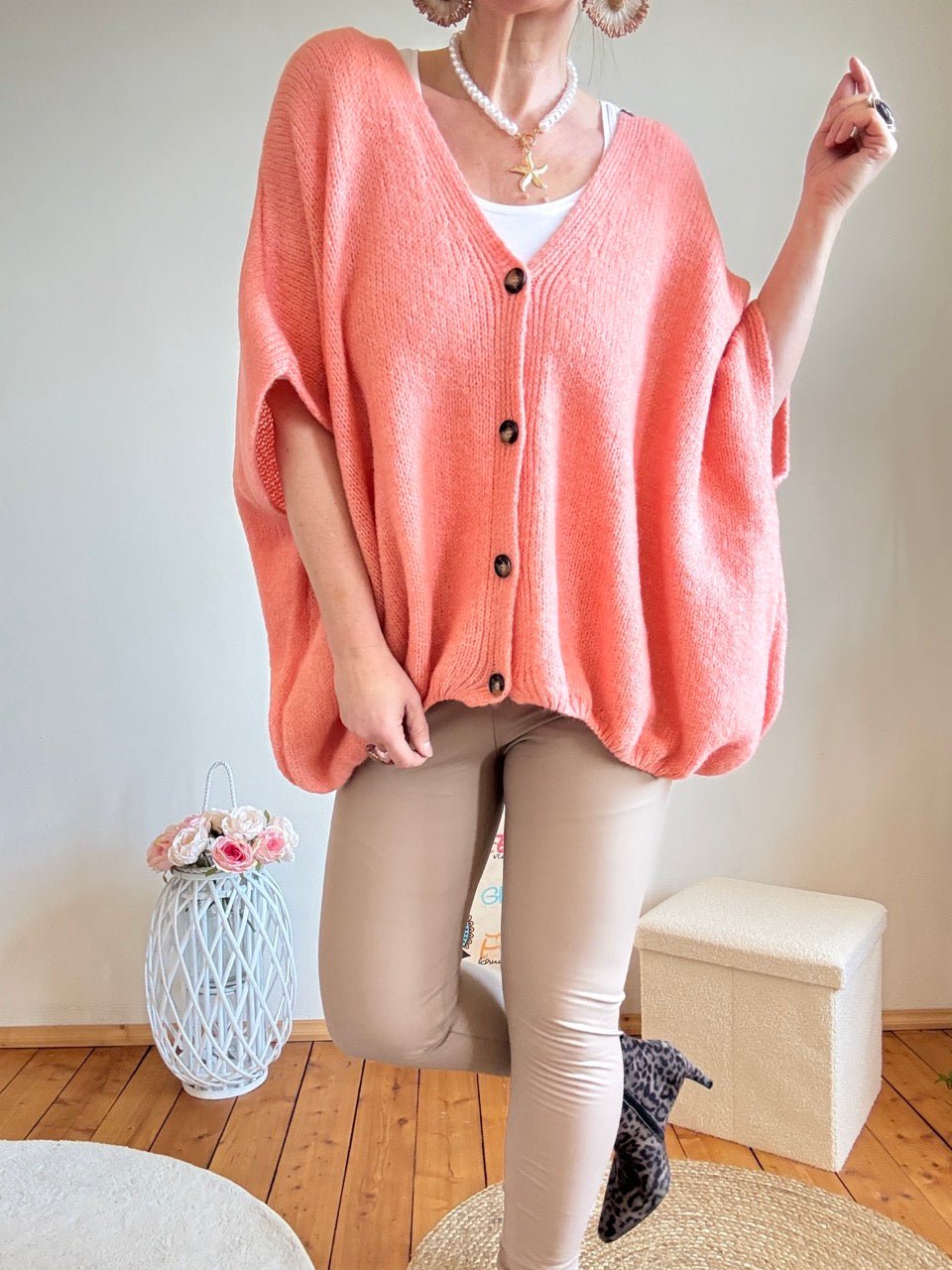 • Super gemütliche, weit geschnittene Strickjacke mit kurzen Armen in Pfirsich und kleinem Wollanteil