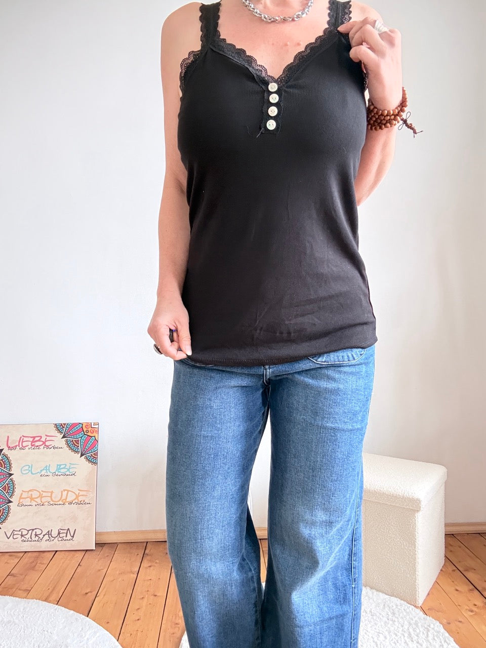 • Süsses, entspannt geschnittenes Top mit zartem Spitzenrand in Schwarz