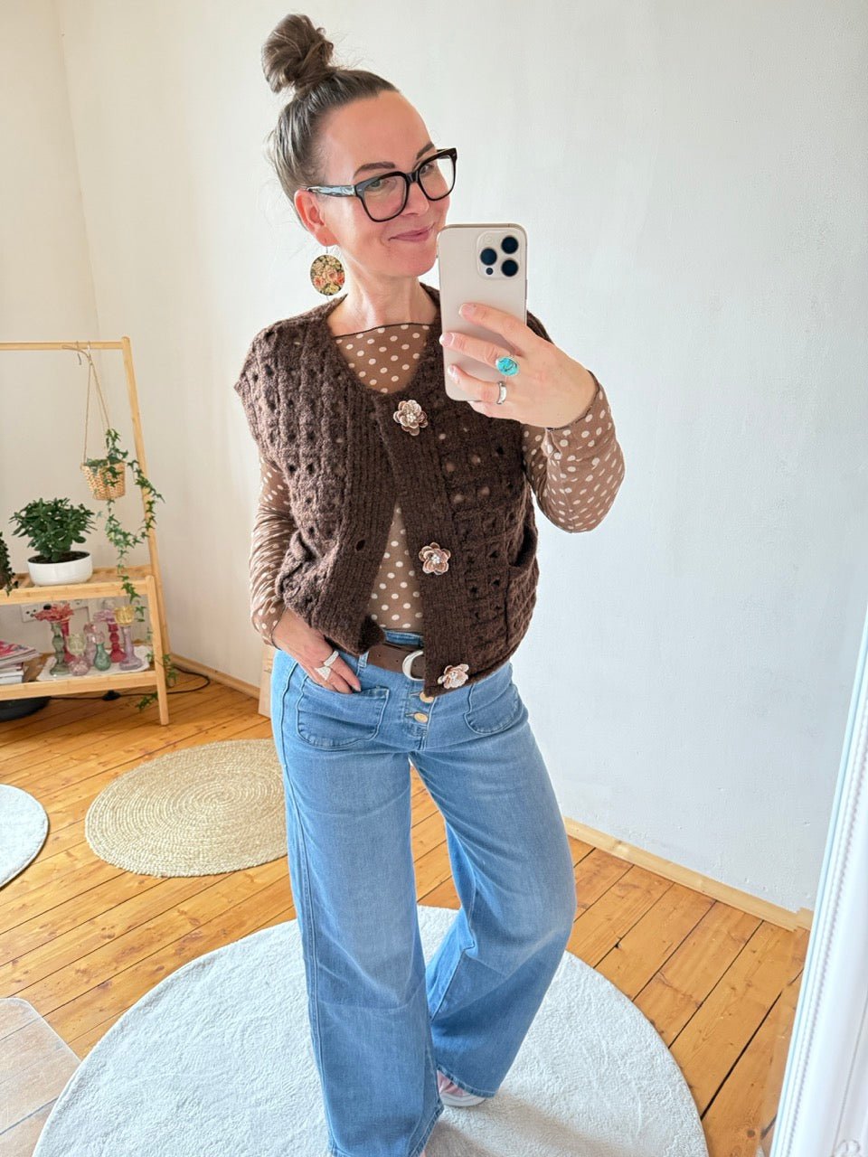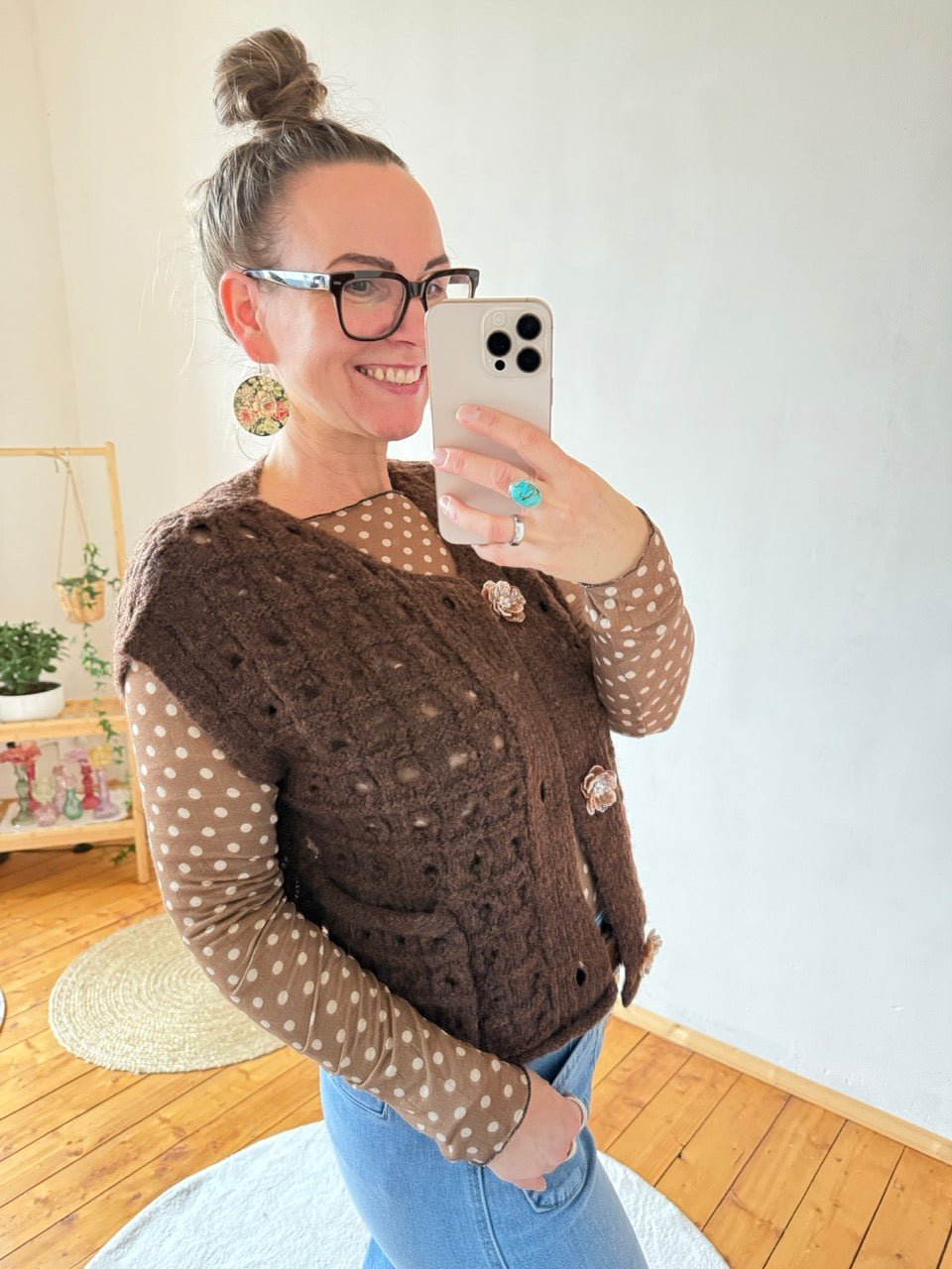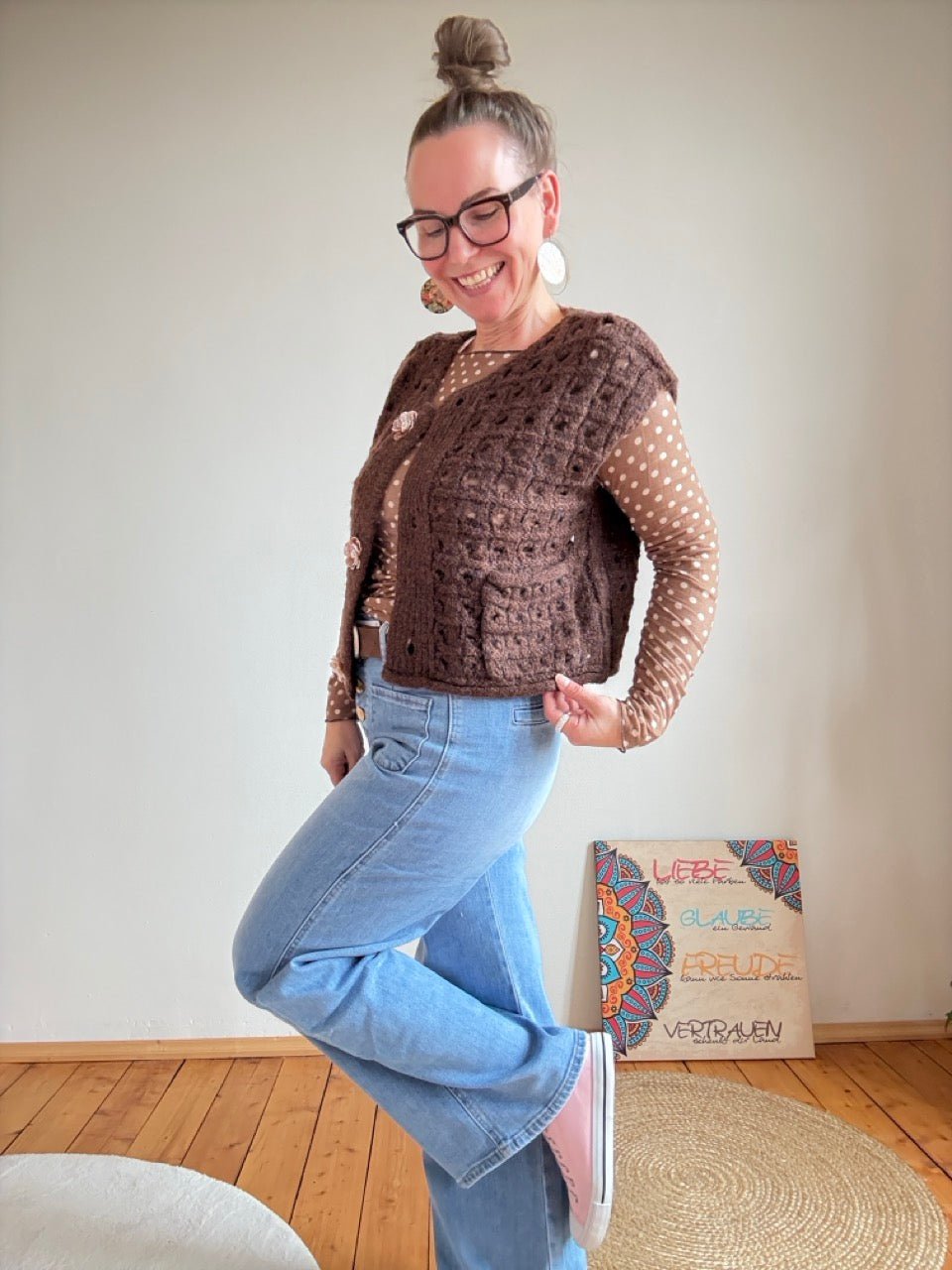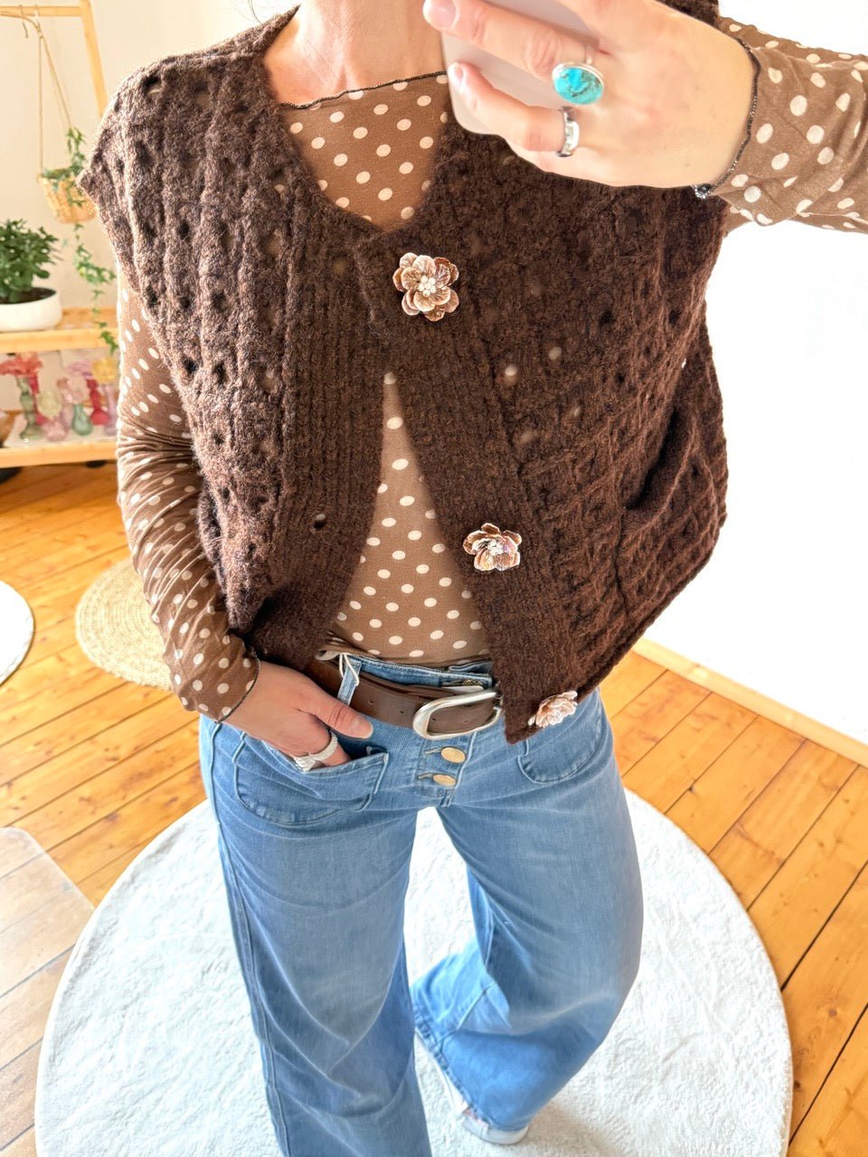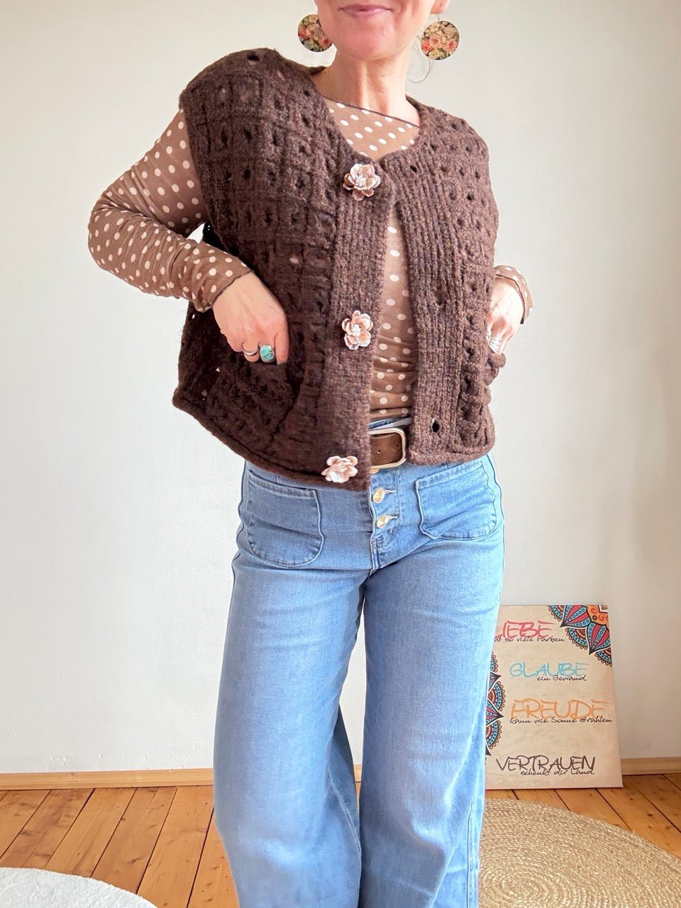 • Wunderschöne grob gestrickte Weste in Chocolate, mit tollen, aufwendig gearbeiteten, Blumenknöpfen