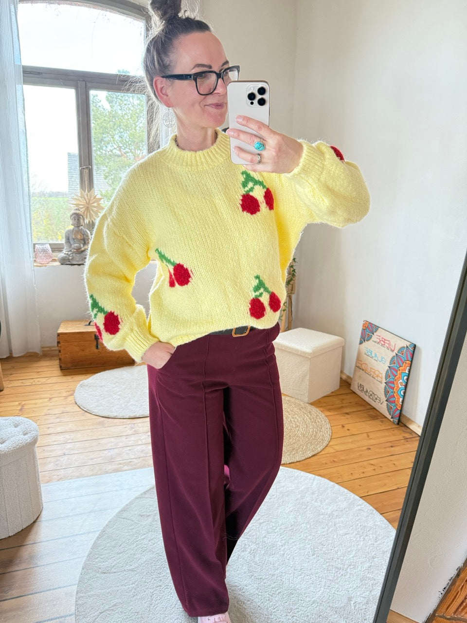• Süsser, gemütlicher Strick Pulli in hellem Sonnengelb mit Kirsche, mit kleinem Wollanteil