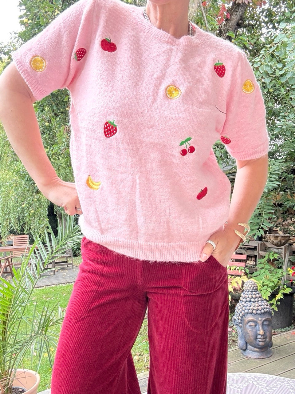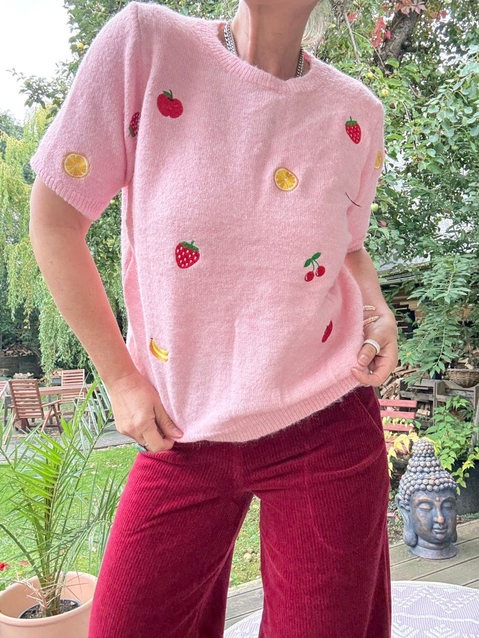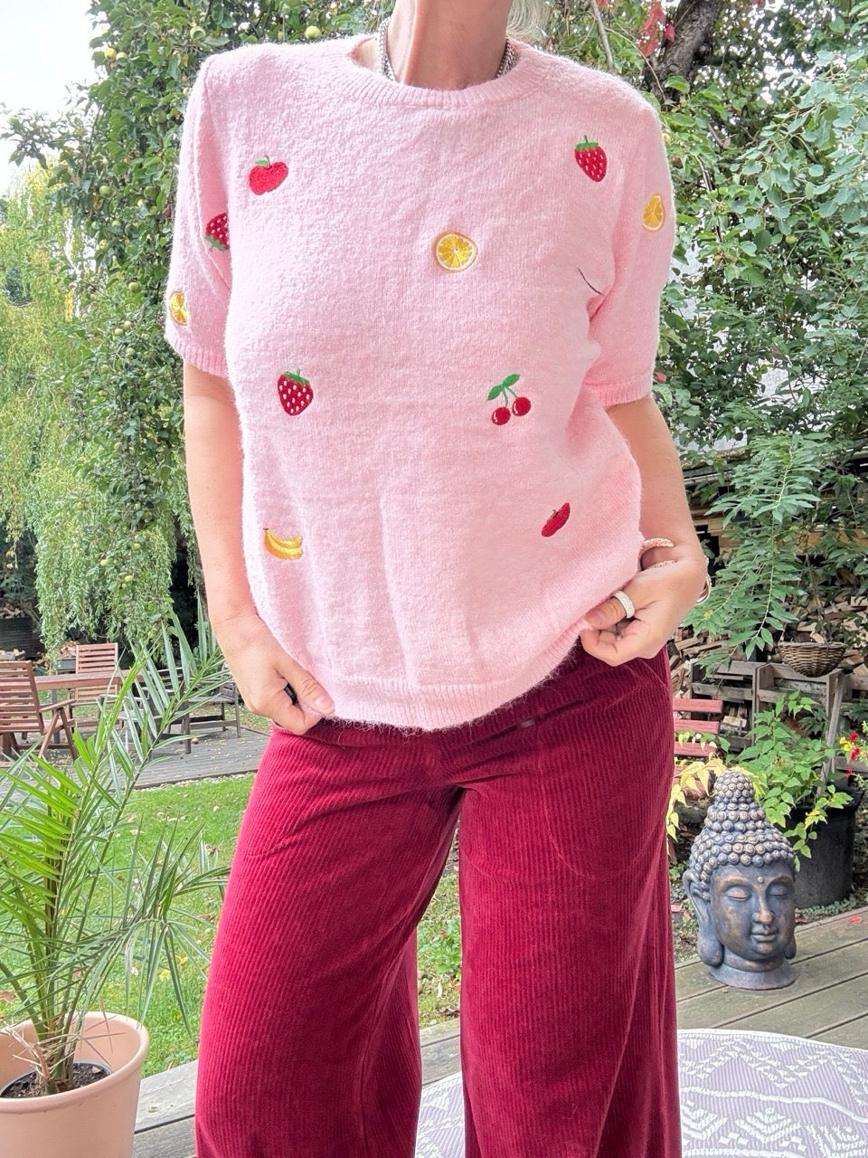 • Süsser, weicher Kurzarm Pulli in Rose, mit aufgestickten Früchten