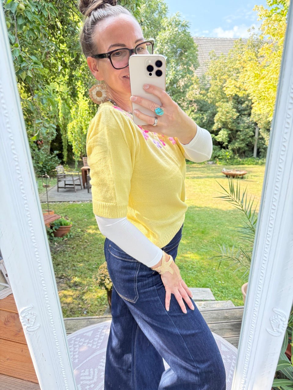 • Feine Stickereien in Pink, Gelb und Flieder zieren den Ausschnitt wie ein kleiner Blumenkranz