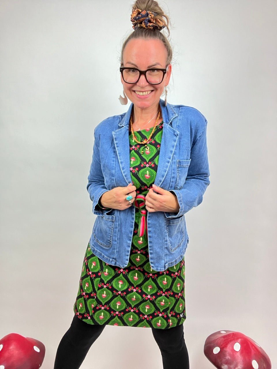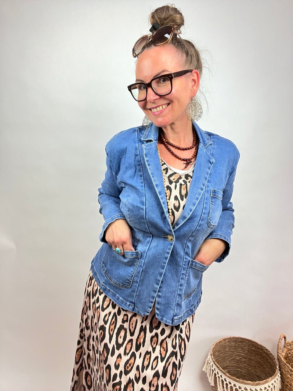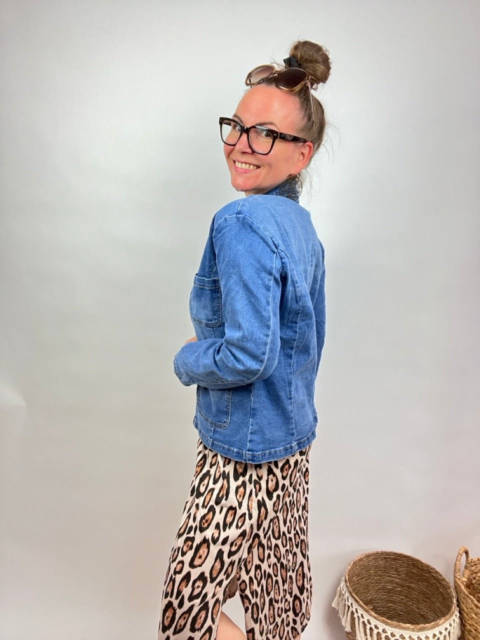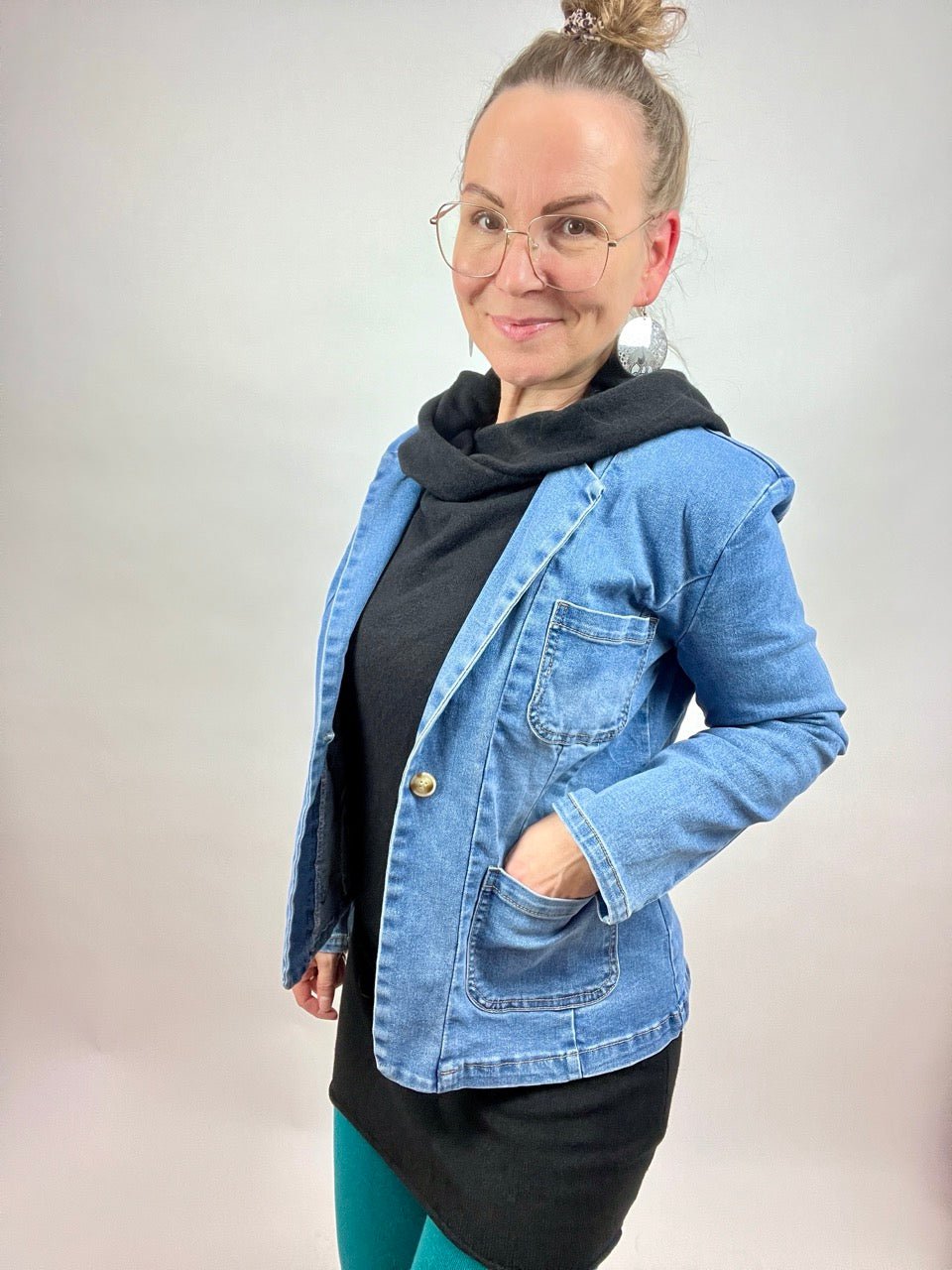 • taillierter Schnitt mit seitlichen Einschubtaschen und einem Knopf zum verschließen