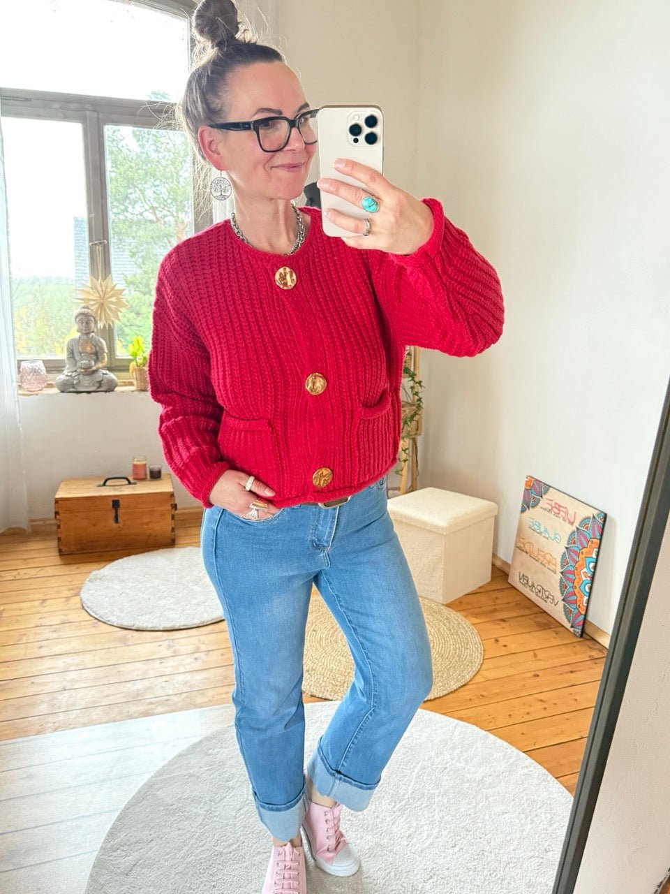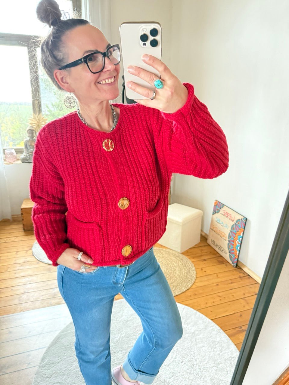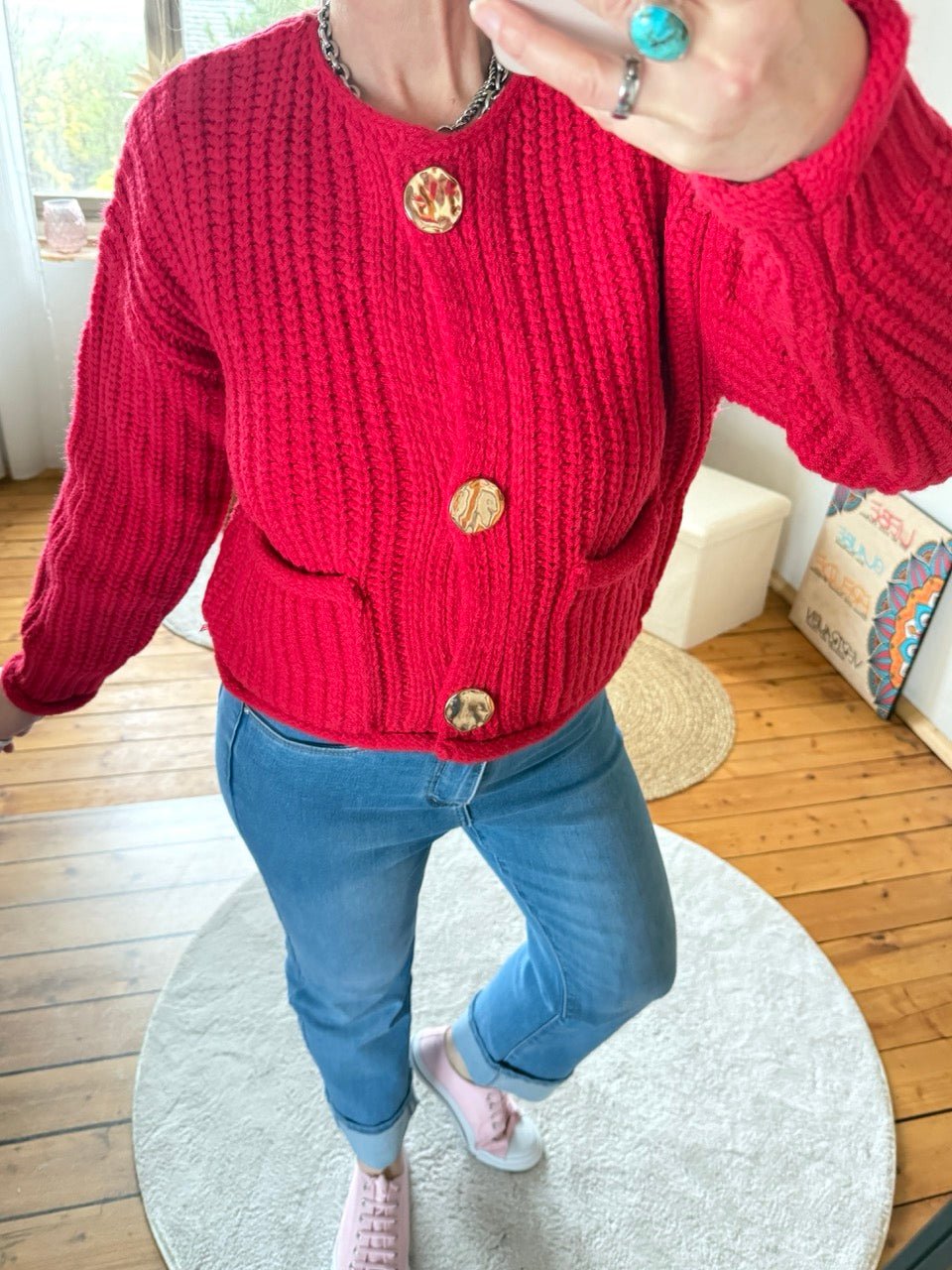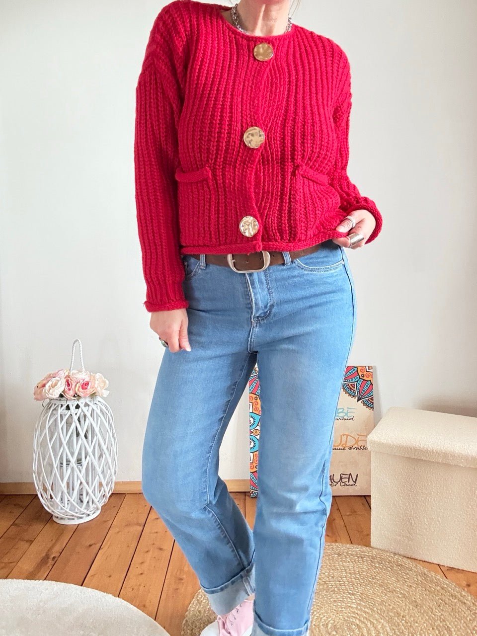 Regulärer Preis 37,59 €• Wunderschöne grob gestrickte Strickjacke in Rot, mit tollen, großen, goldfarbenen Knöpfen