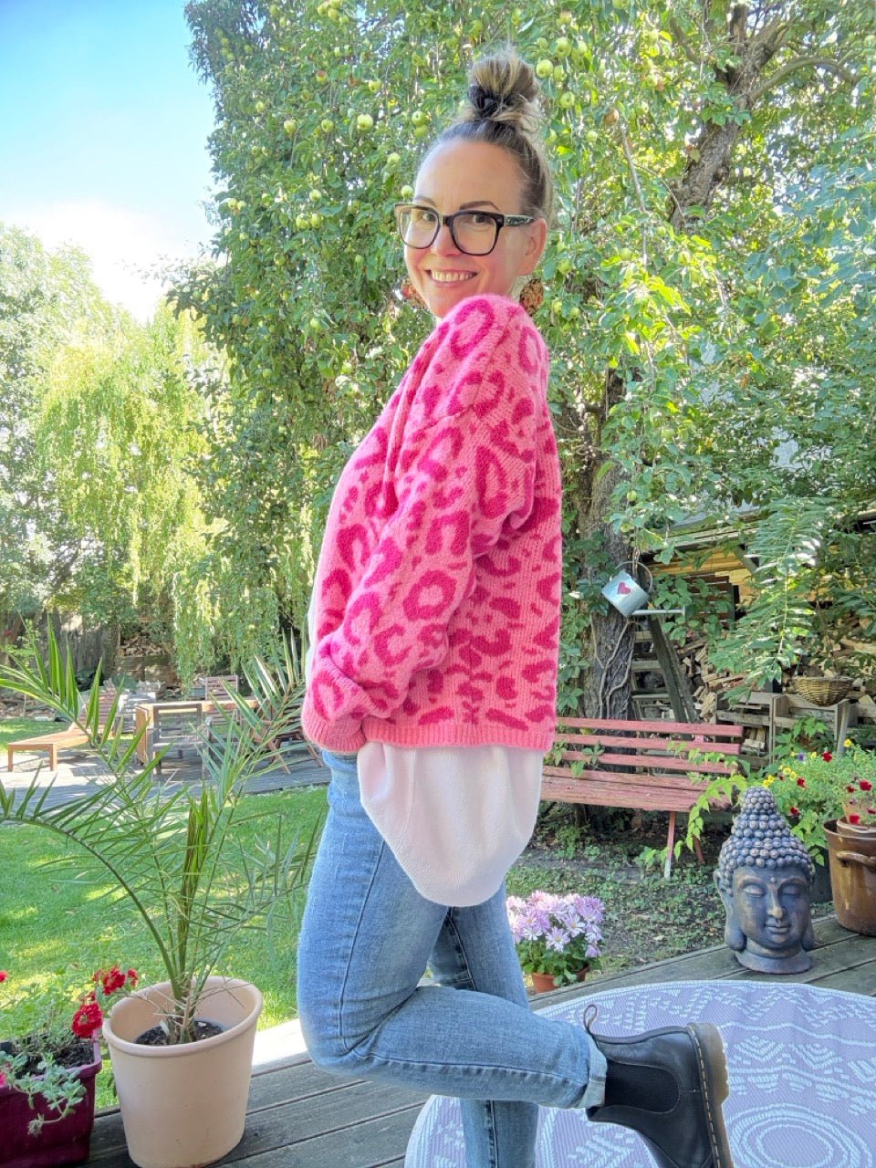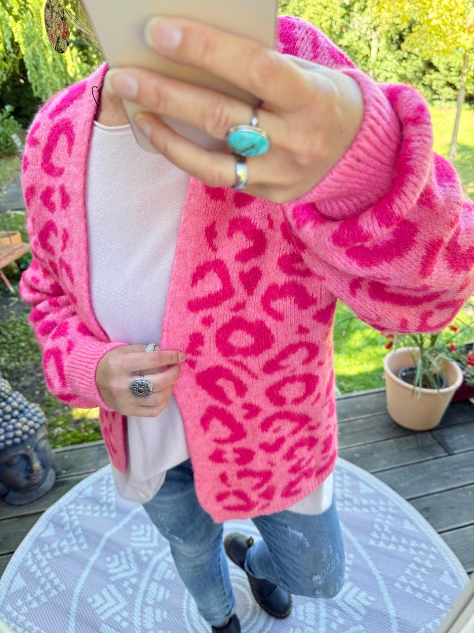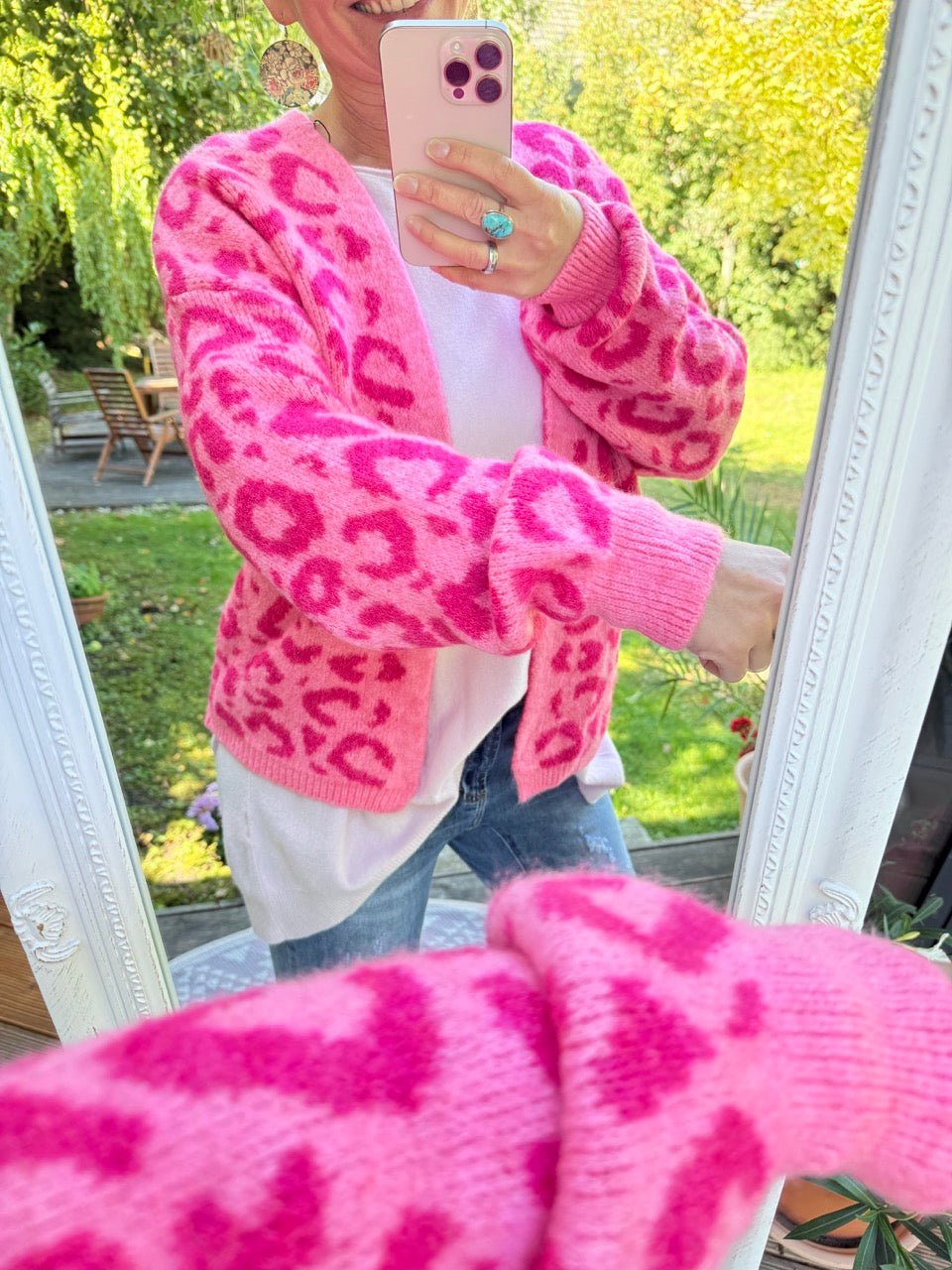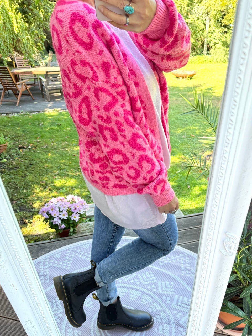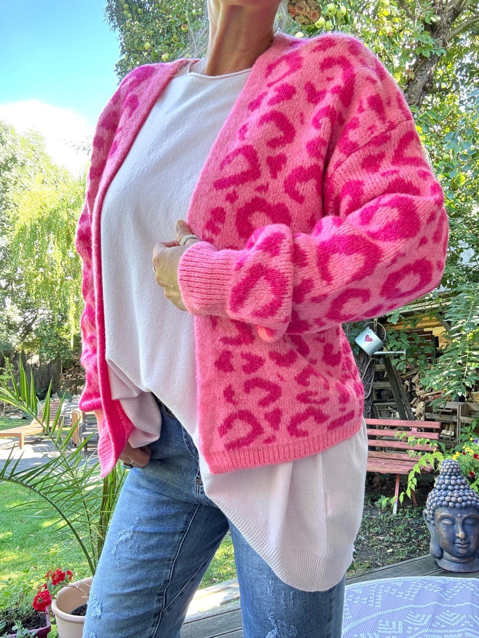 • Super gemütliche, locker geschnittene Strickjacke in Leo Optik Rose / Fuchsia und kleinem Wollanteil