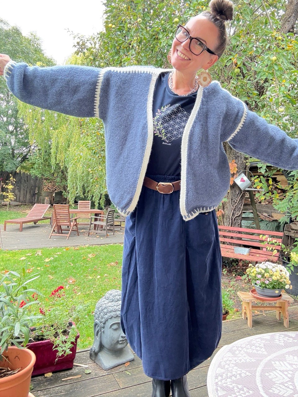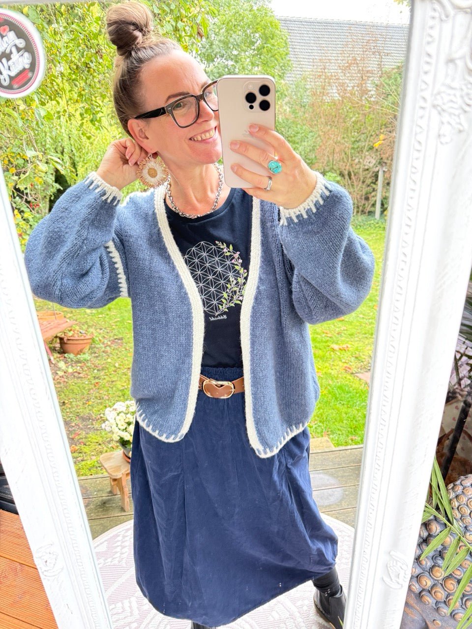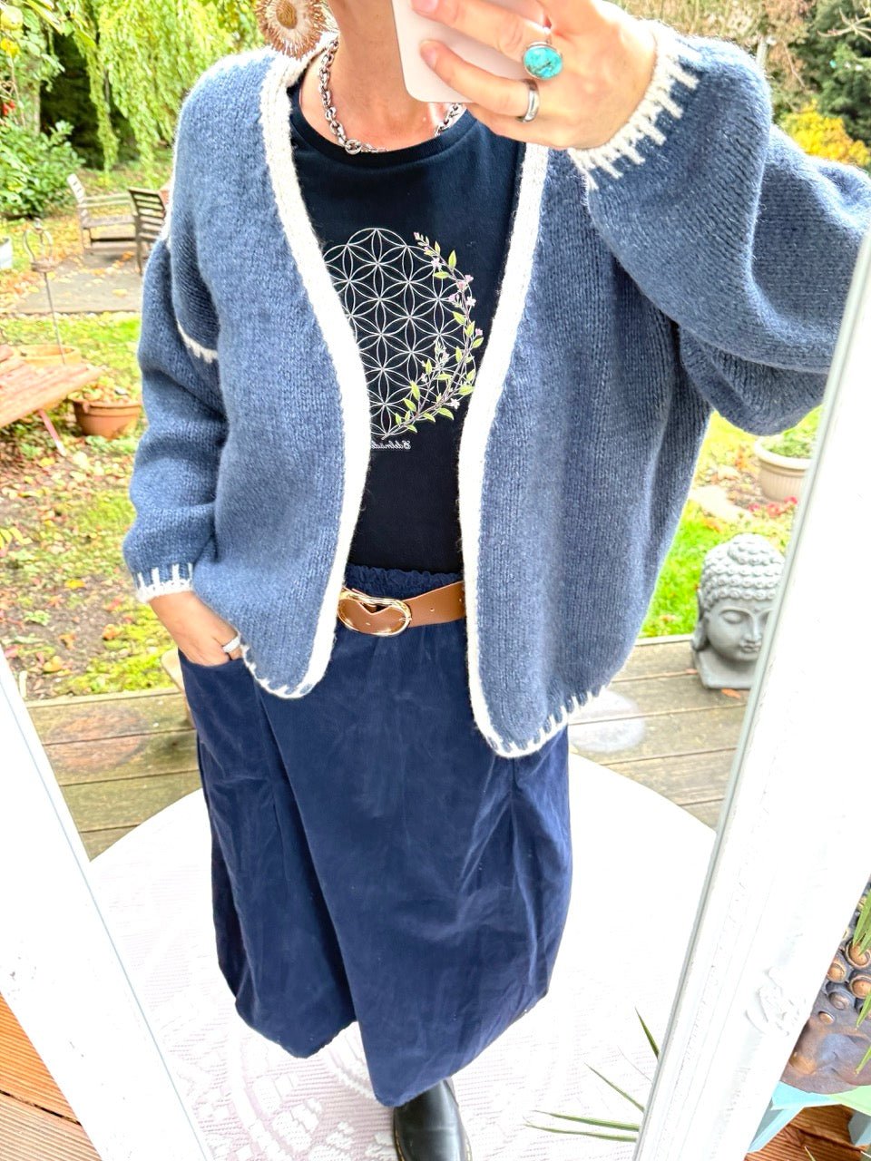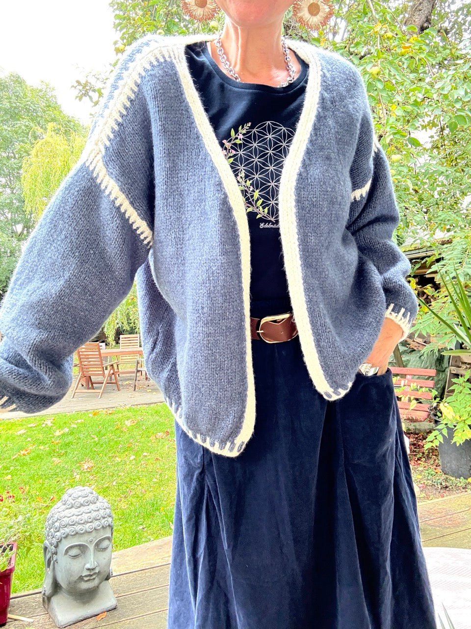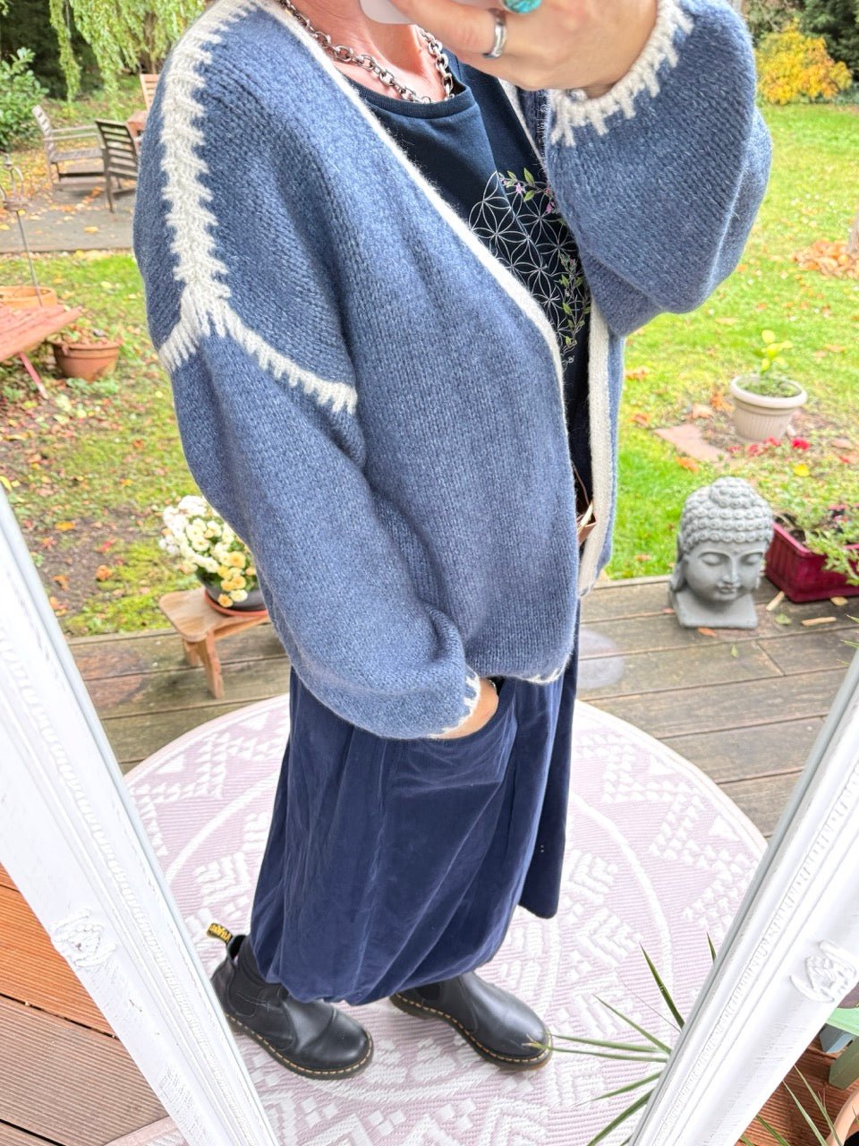 • Super gemütliche, locker geschnittene Strickjacke in Jeansblau, farblich abgesetzten Nähten und kleinem Wollanteil