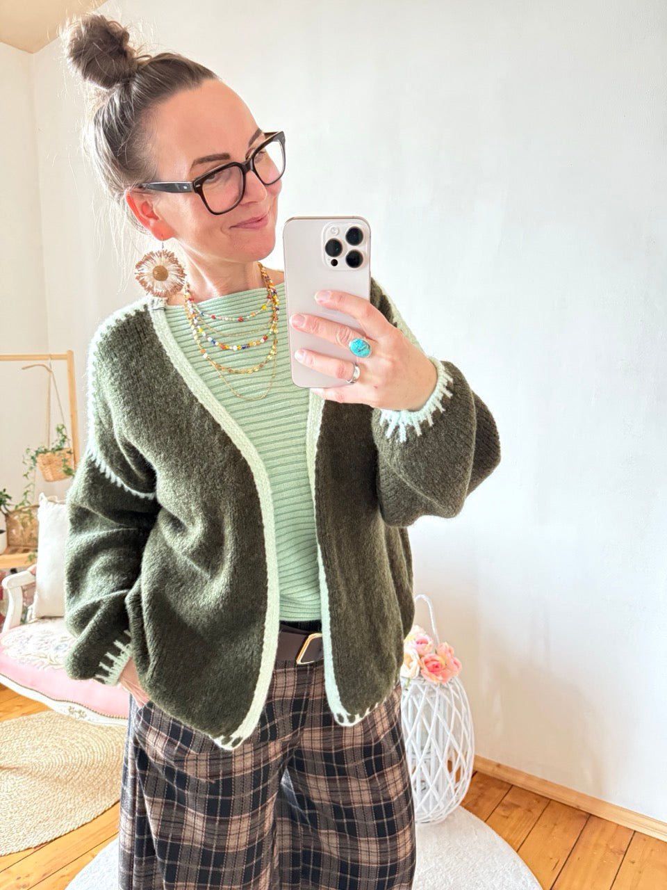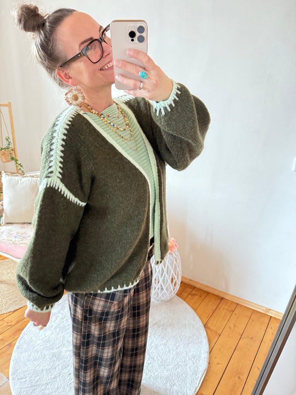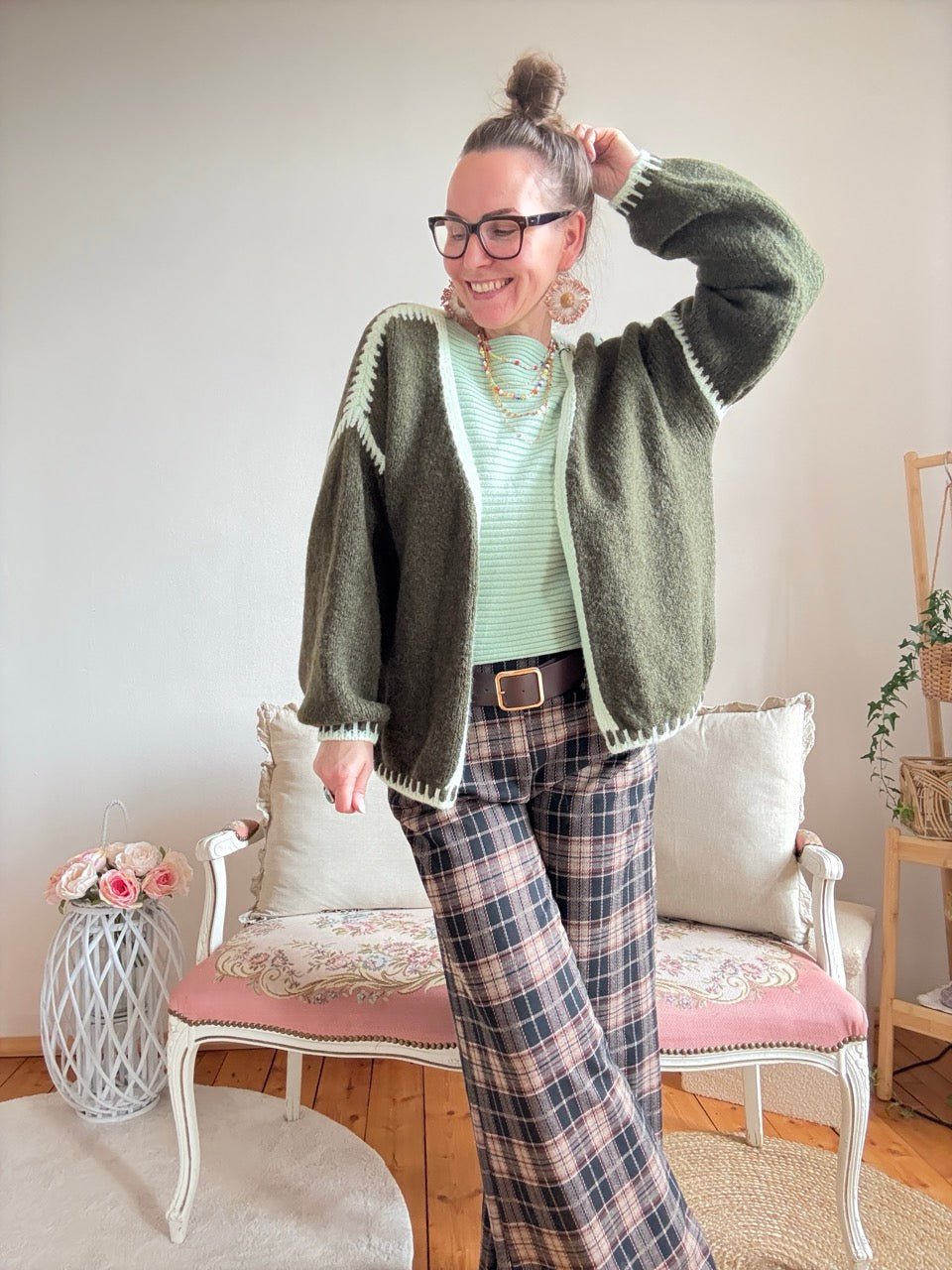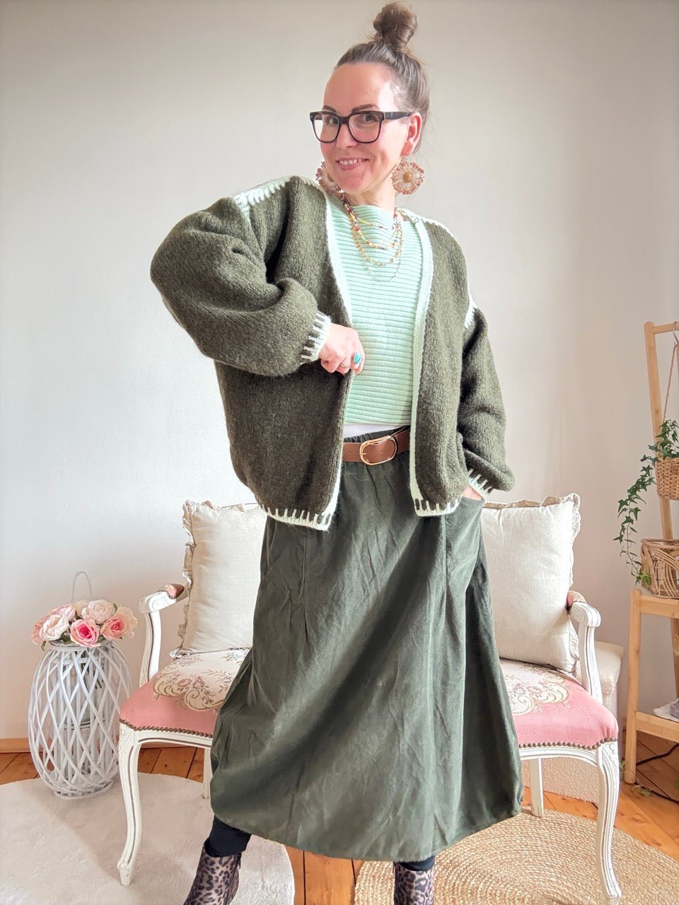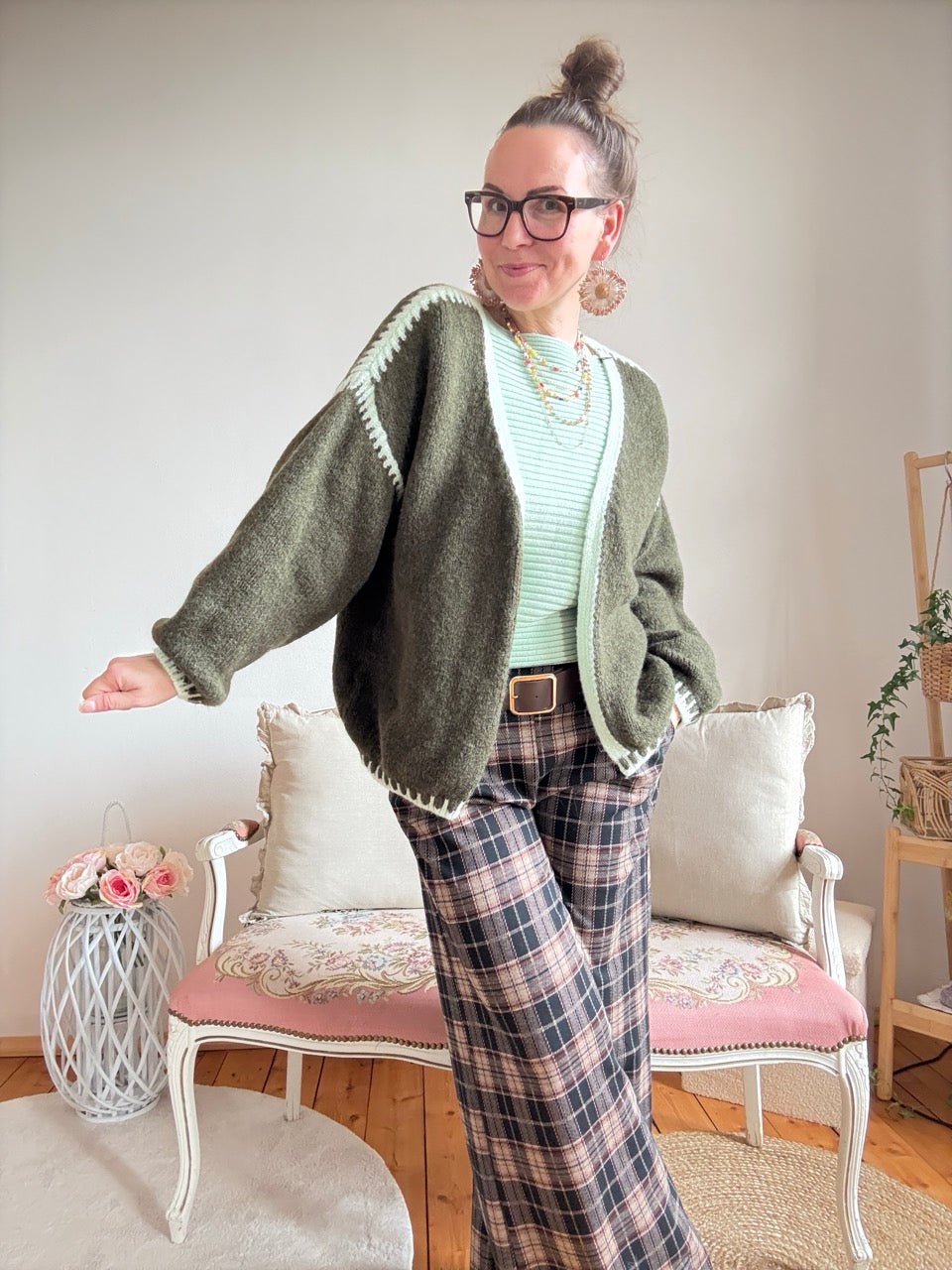 • Super gemütliche, locker geschnittene Strickjacke in Olive, farblich abgesetzten Nähten und kleinem Wollanteil