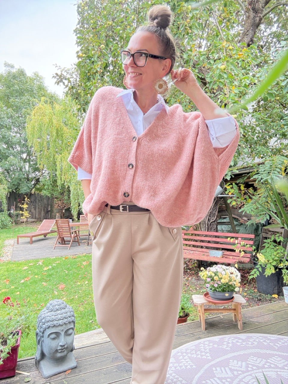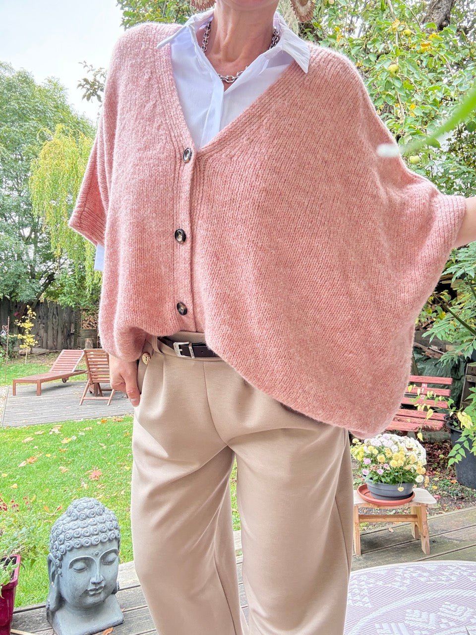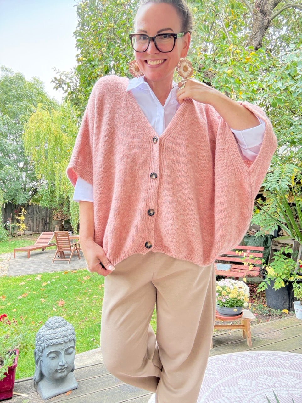 • Super gemütliche, weit geschnittene Strickjacke mit kurzen Armen in Alt Rose und kleinem Wollanteil