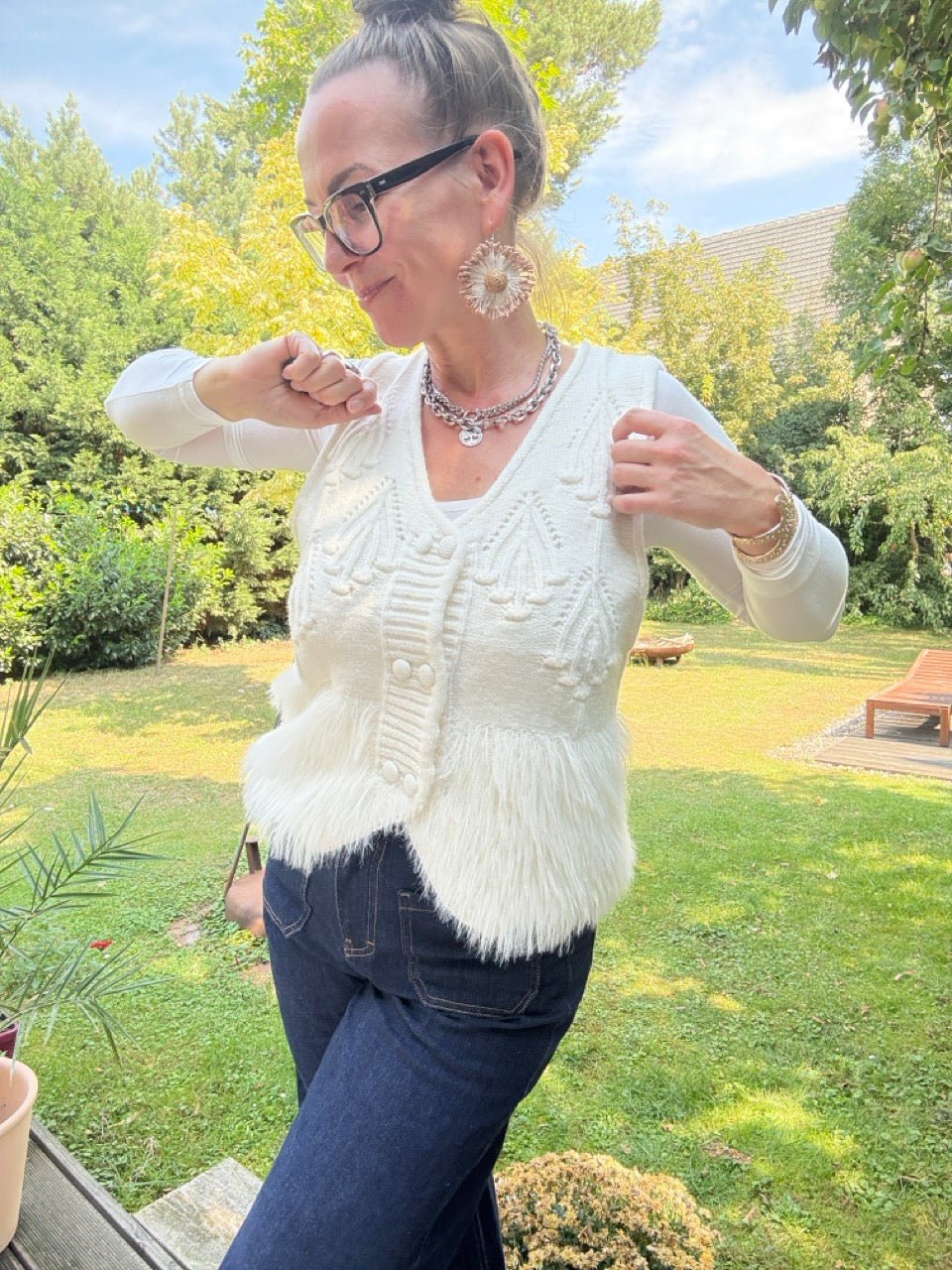 • Gemütlich Elegante Strickweste in Wollweiß mit Fransenabschluß